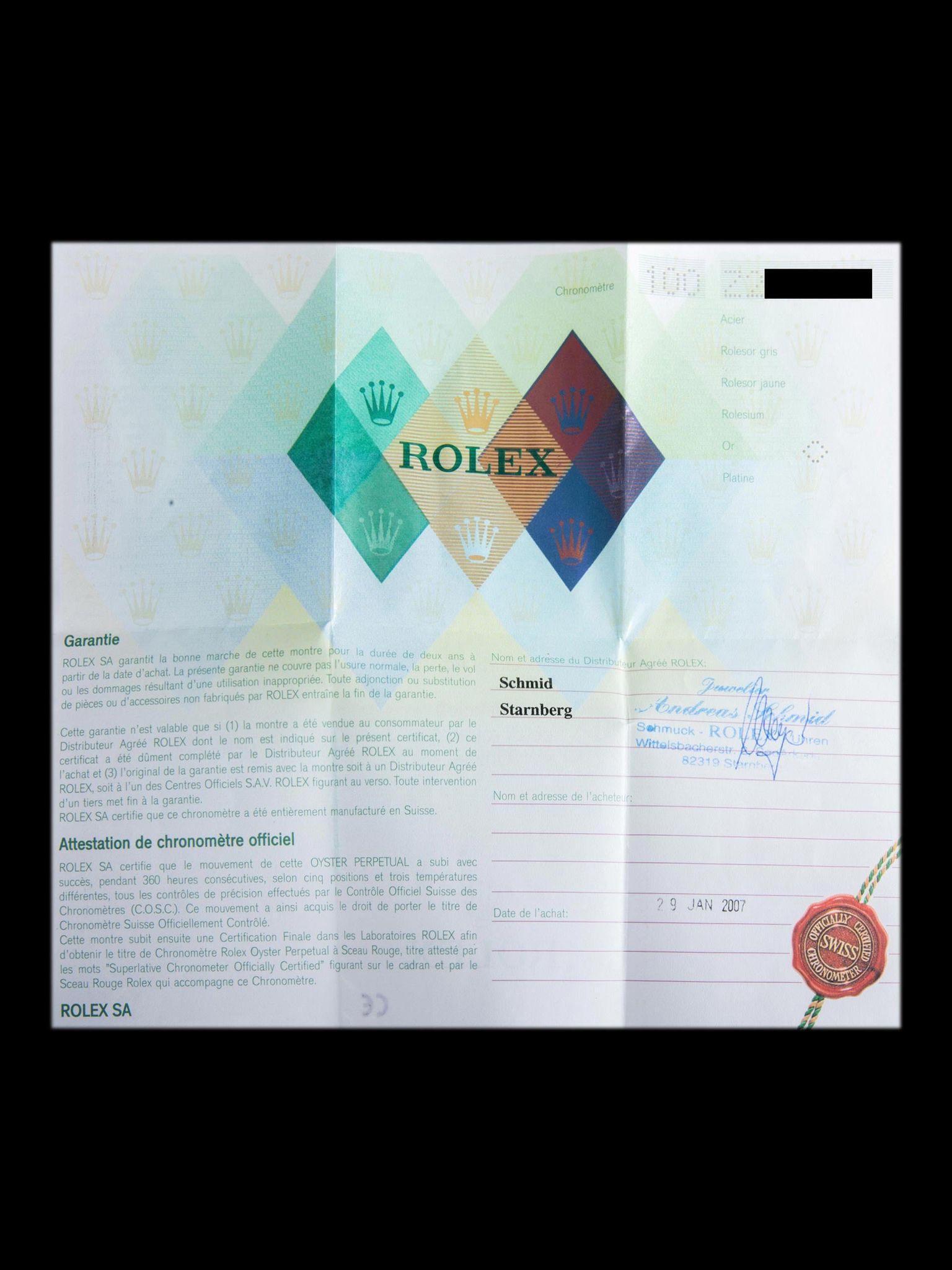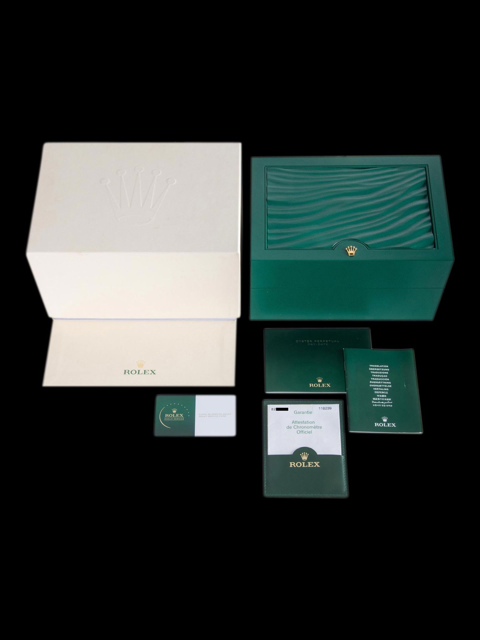 The watch comes as a complete set, with its original inner and outer boxes, Rolex guarantee paper, booklets, and a recent Rolex Service Center Card. The watch is still under Rolex timekeeping warranty until May 2027.