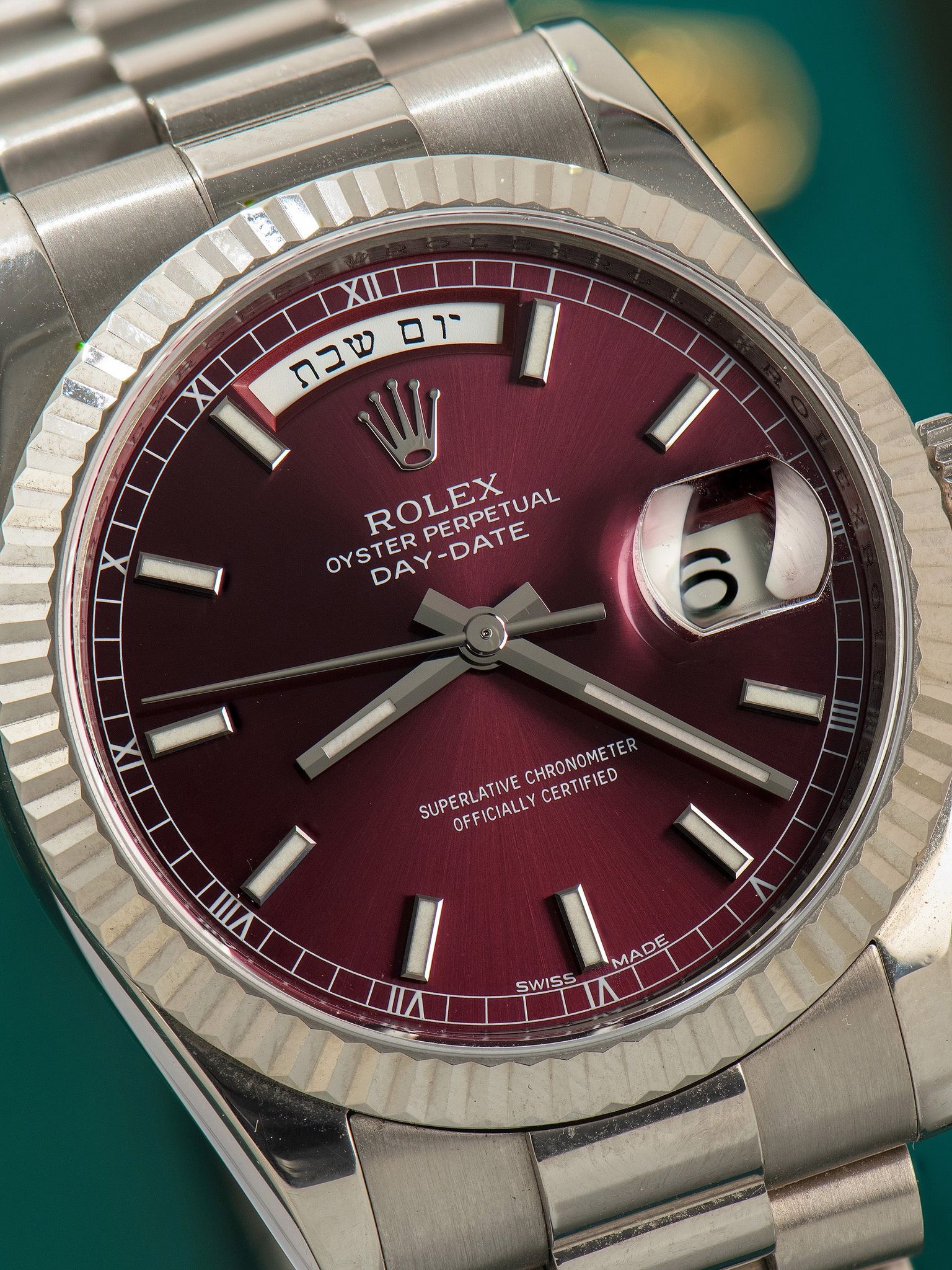 2007 Rolex Day-Date 18K WG (Ref. 118239) Cherry Dial W/ Hebrew Day Wheel, Box, Papers, & Recent Rolex Service
