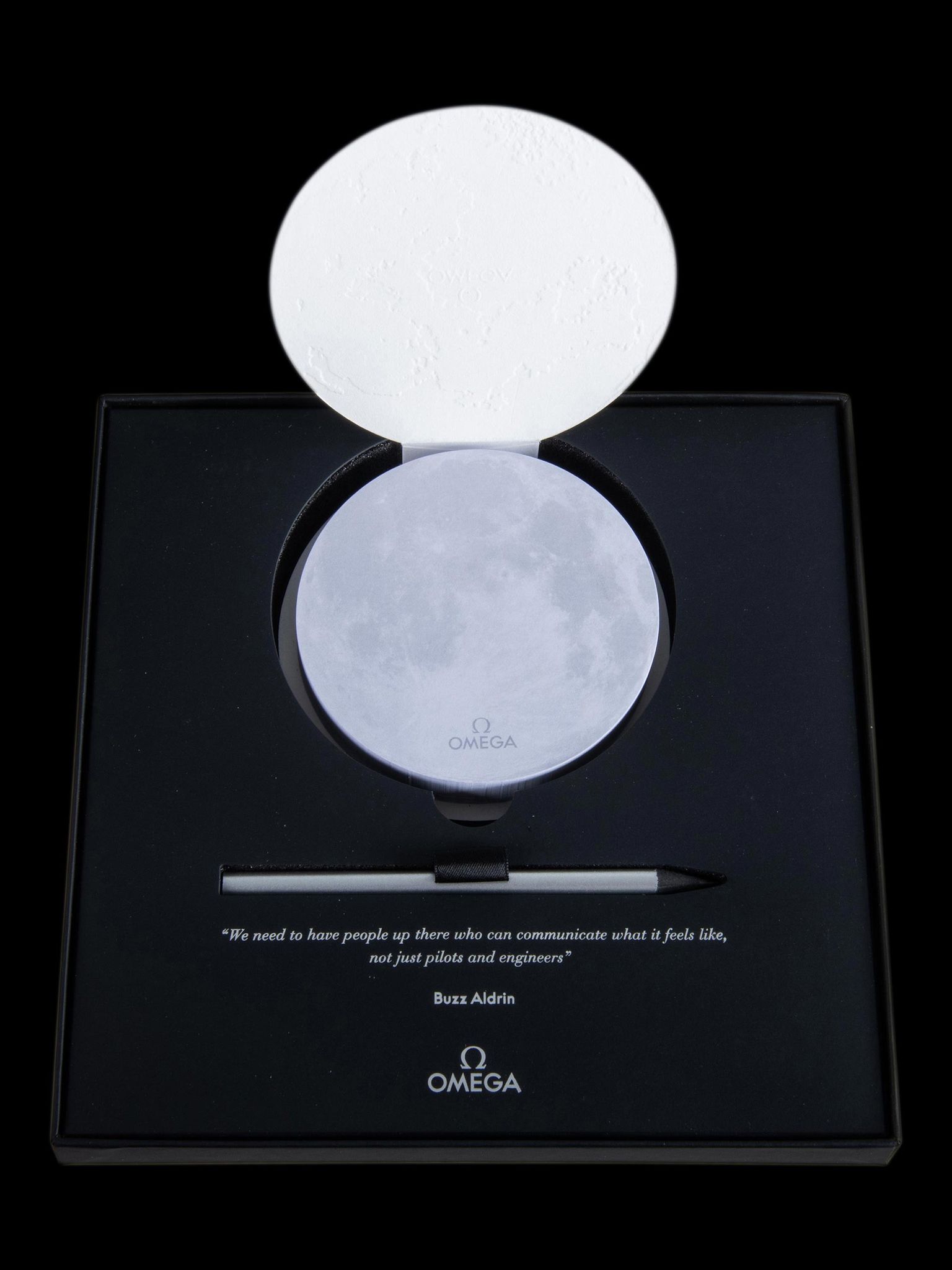 The watch is a complete set including the cardboard shipping box, outer display box, inner box, travel case, case accessories, two extra straps, warranty cards, instruction booklets, and promotional Omega pen and pad notebook. The watch is keeping time perfectly.