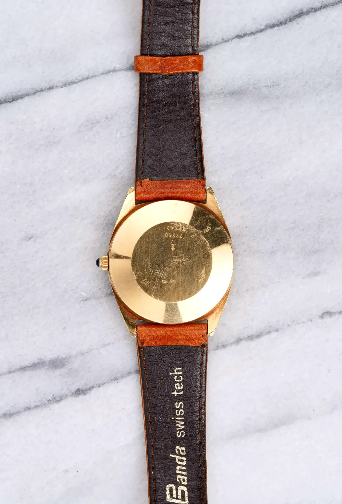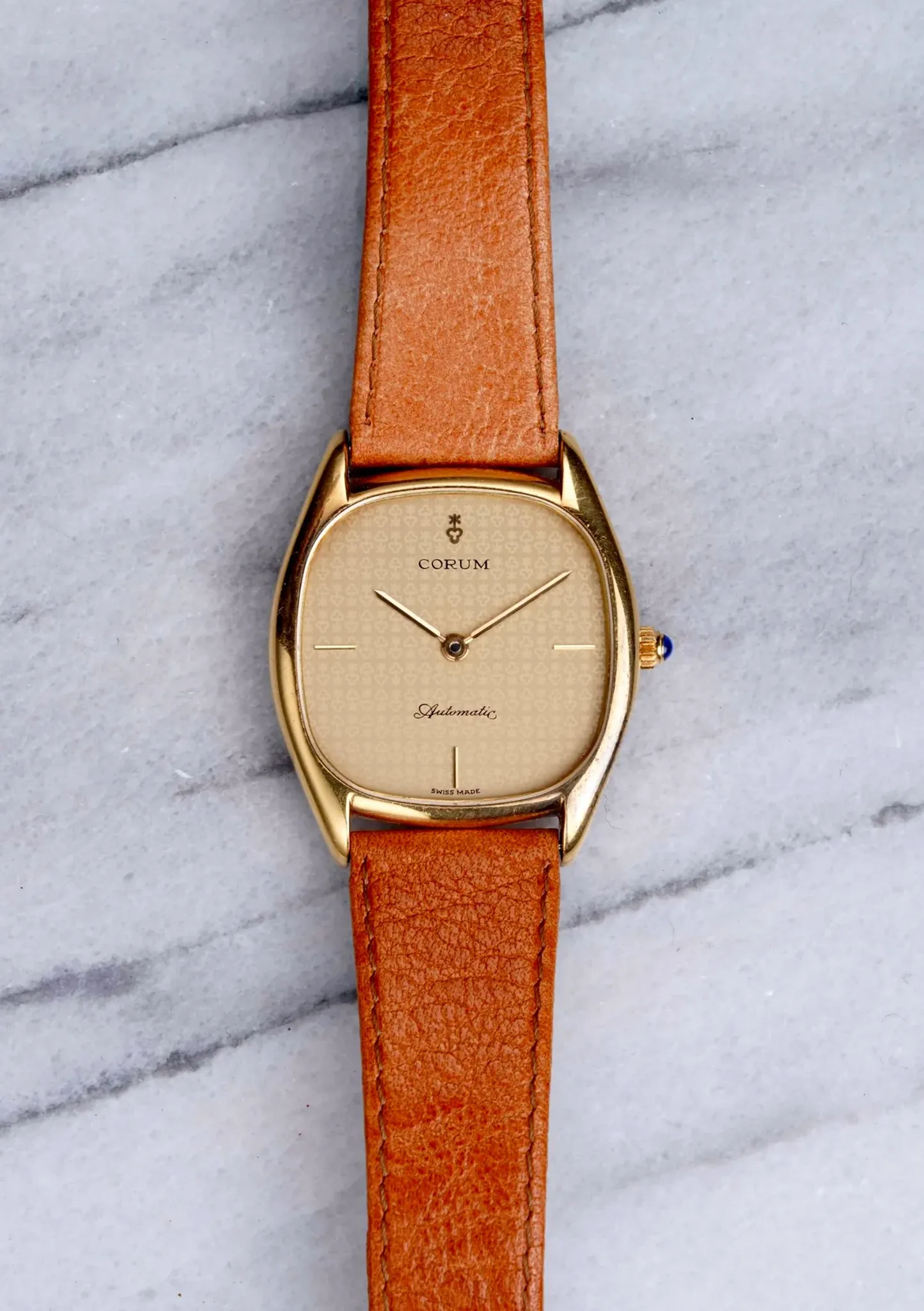 Here's a vintage Corum with a champagne dial featuring little Corum motifs all around. It is powered by a automatic movement and paired with a brown pigskin strap. The case is 18K yellow gold. Keeps great time and is fully functional. The watch is dating to the late 1970s. The strap fits wrists of 6.5-7.5 inches. 18K yellow case, bracelet, and caseback 37x39mm case including the blue cabochon crown. All parts are original including dial, movement, and caseback. Both the dial and case are in great cosmetic, untouched condition.