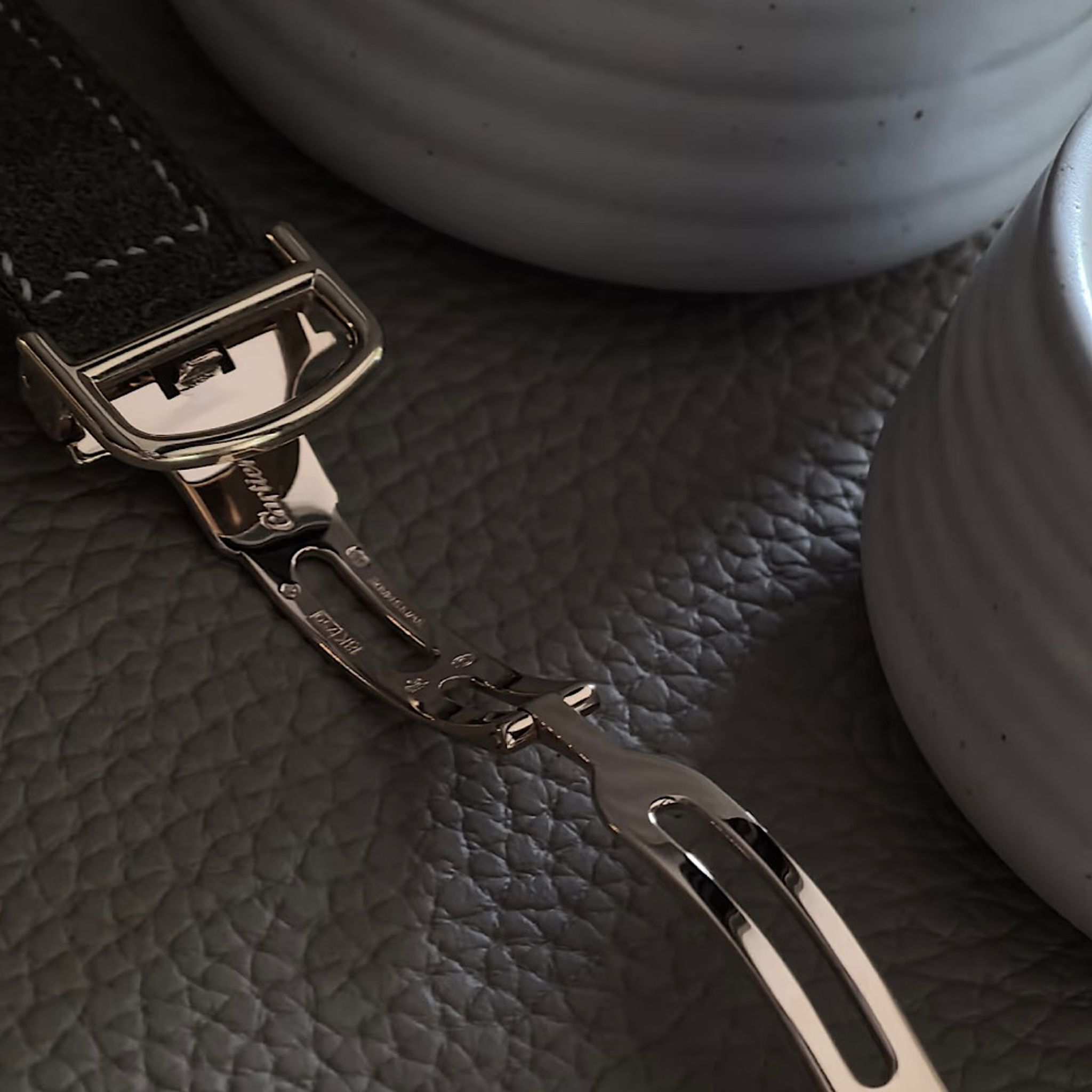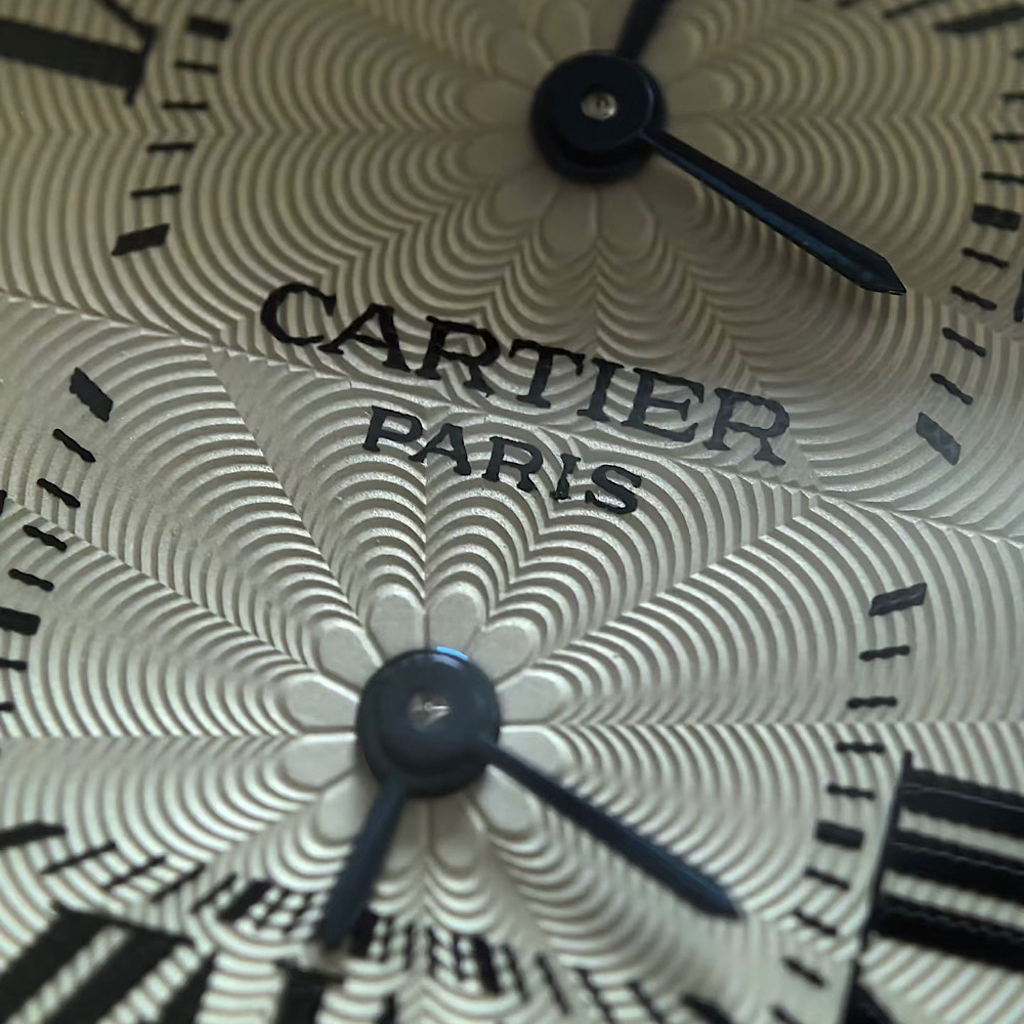 The signature ivory dial is adorned with Cartier’s vintage rose guilloche pattern. Black Roman numerals sit across its surface, while blued steel hands sweep in vivid contrast. At its core lies the innovative split-dial, a dual time complication that tells two stories at once; perfect for both the cosmopolitan traveler.