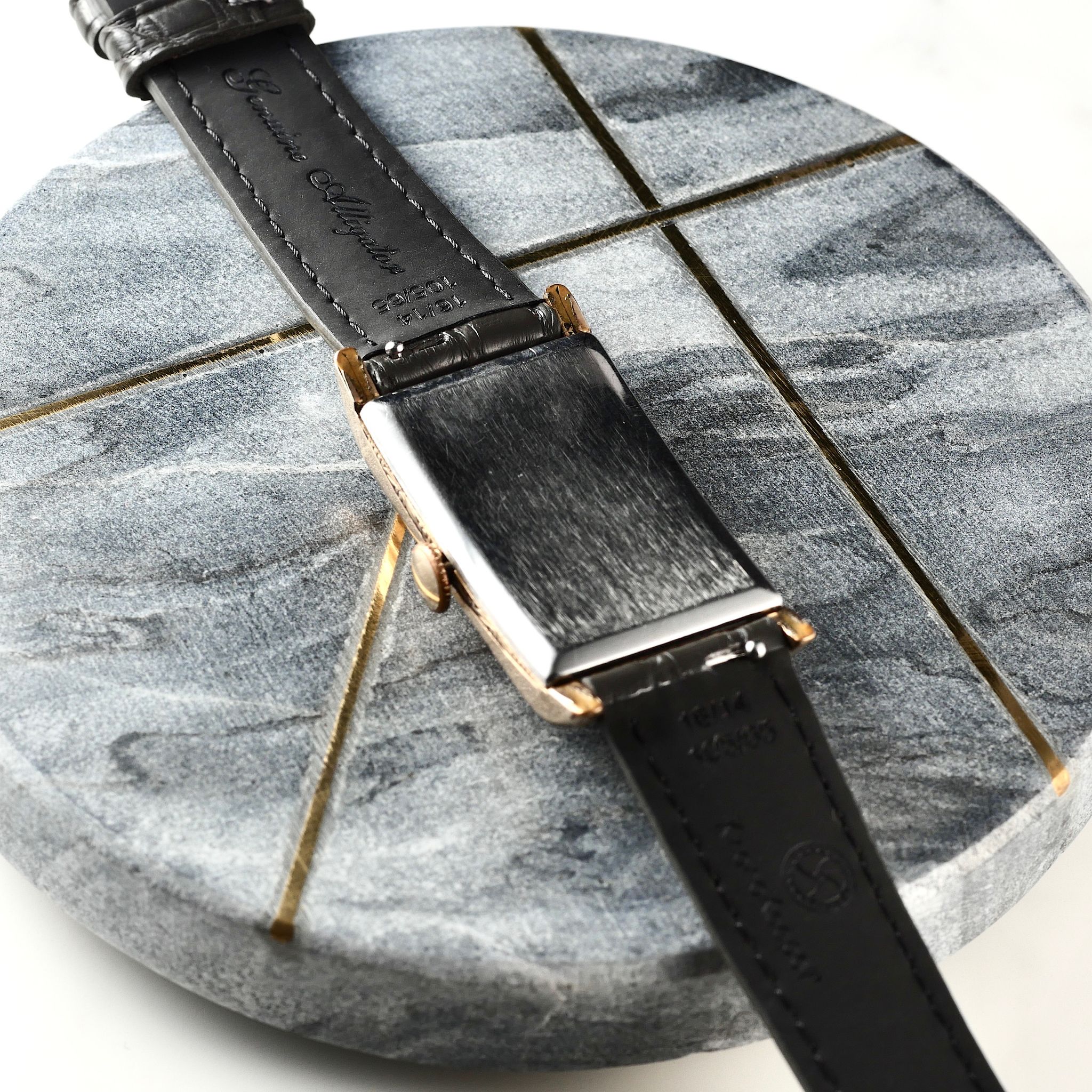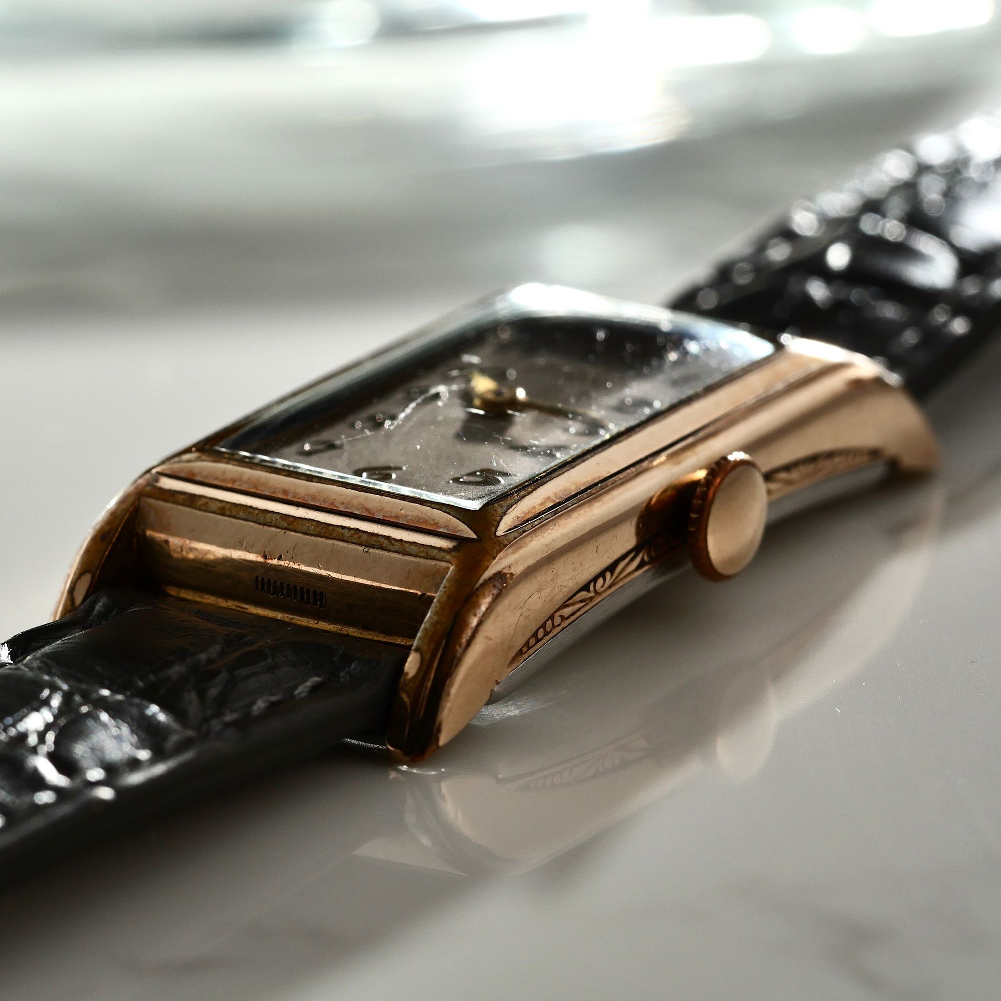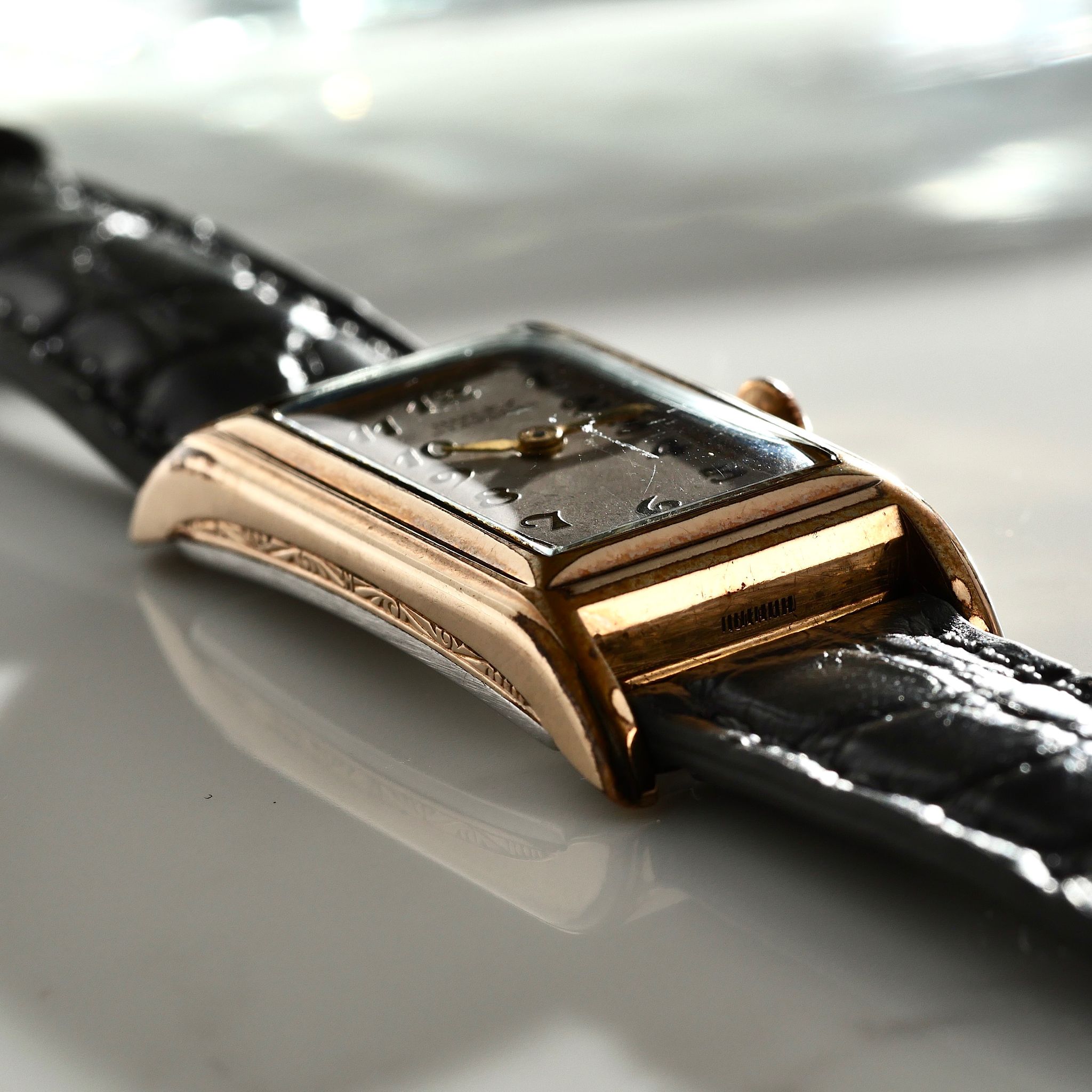 SPECIFICATIONS: Gold Filled, Hand finished elongated curved case with applied engraving, Gold dial with hand applied Breguet numerals, non-OEM Leather Strap, non-OEM Buckle, Very rare.