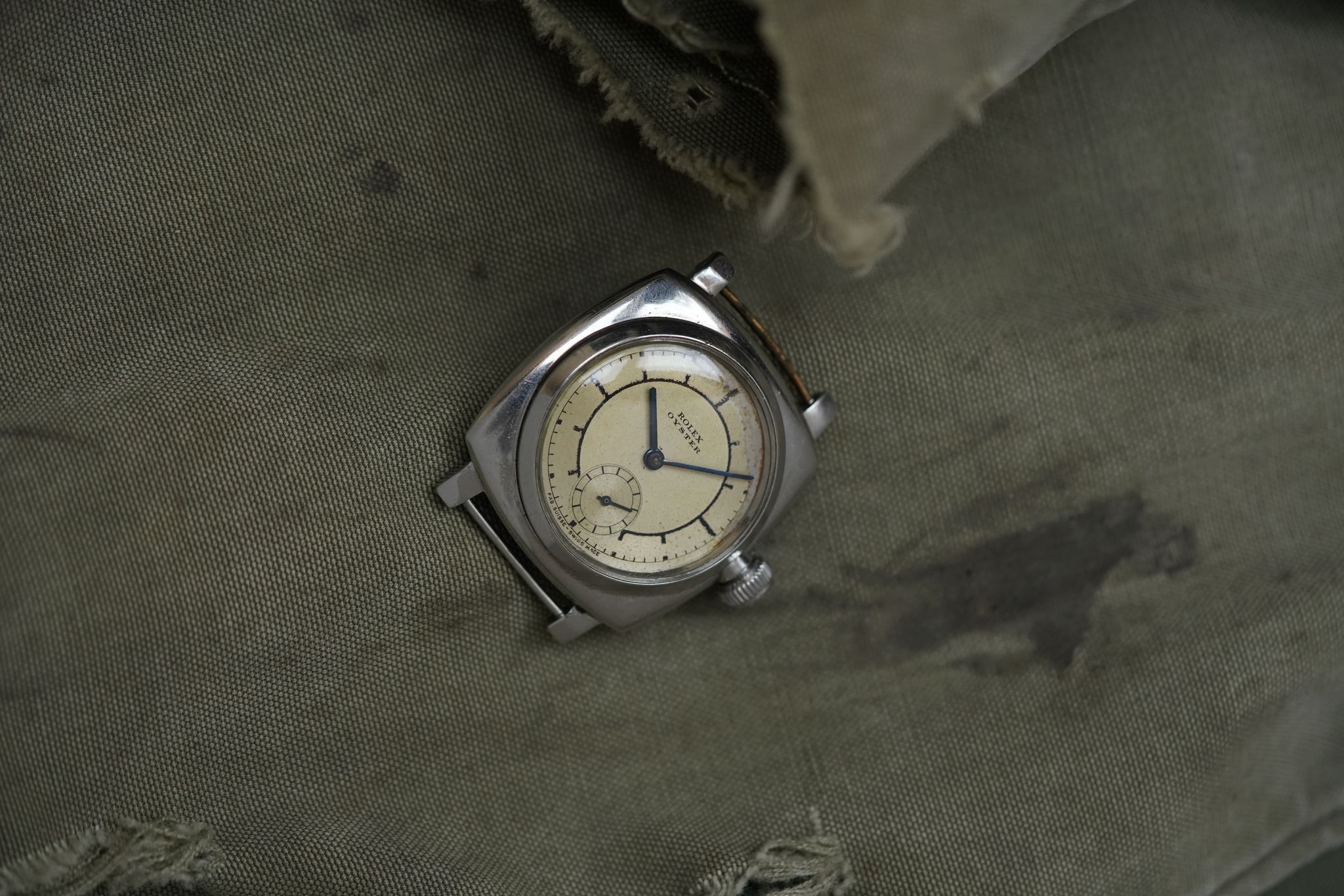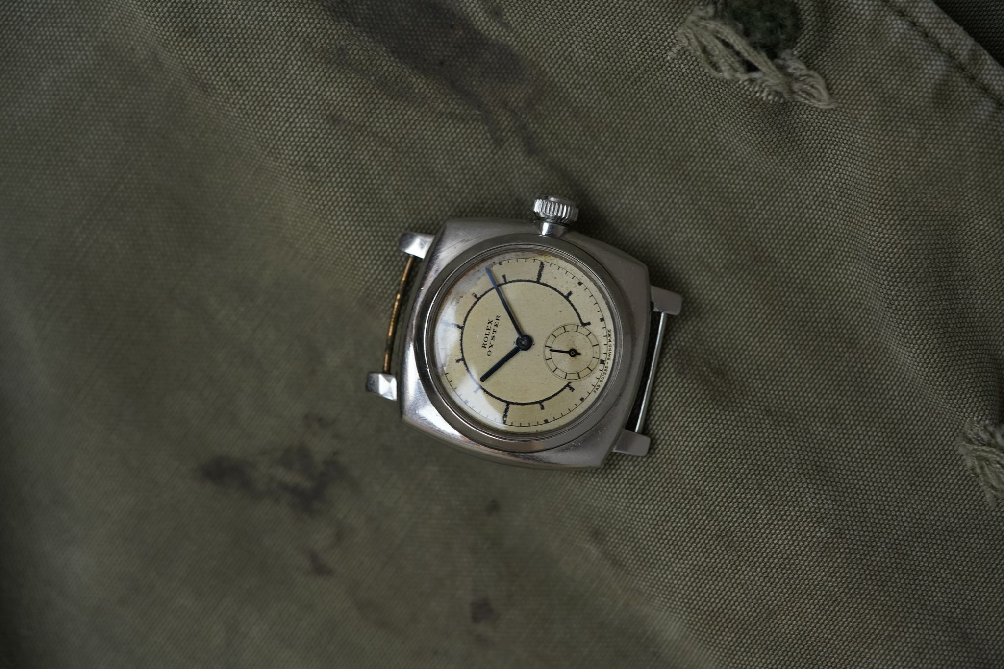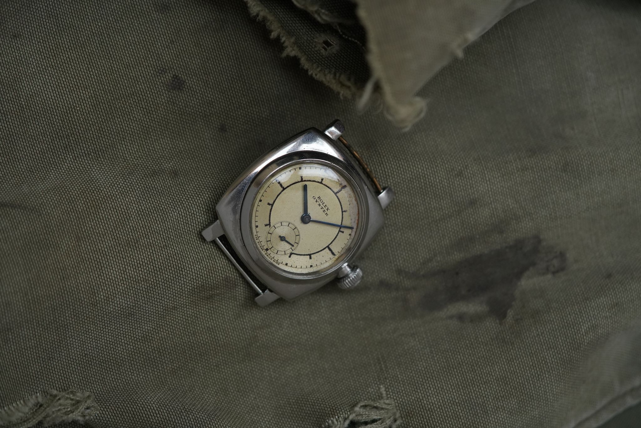 A most delightful design: a super rare cushion case Rolex Bubbleback with mesmerising large sector dial !
