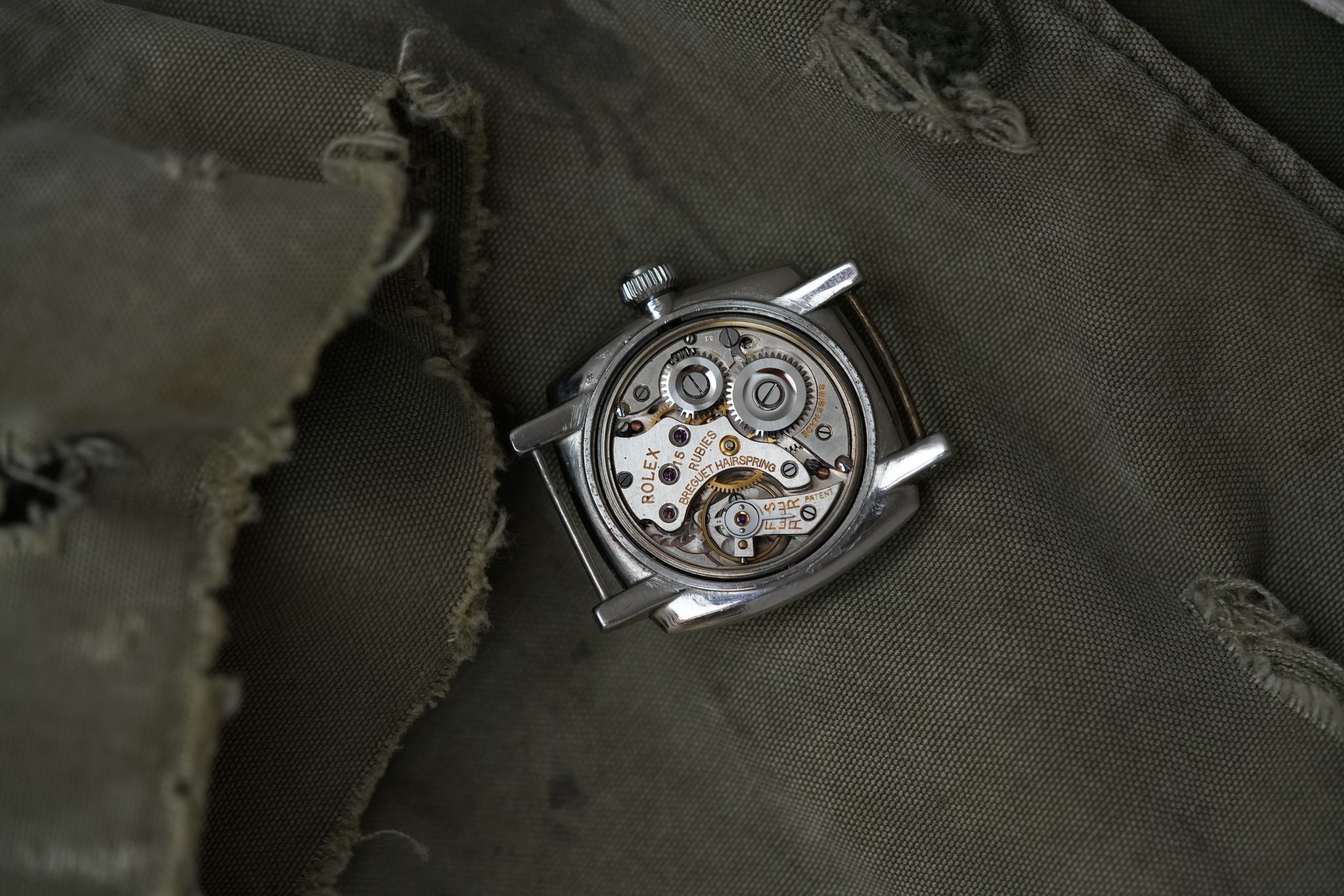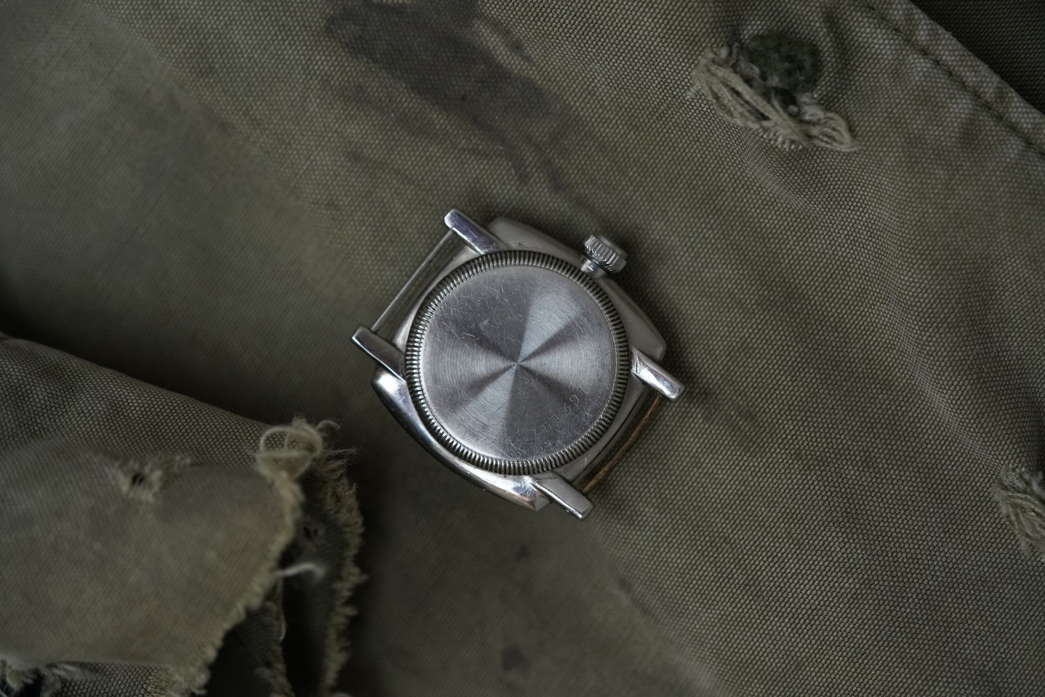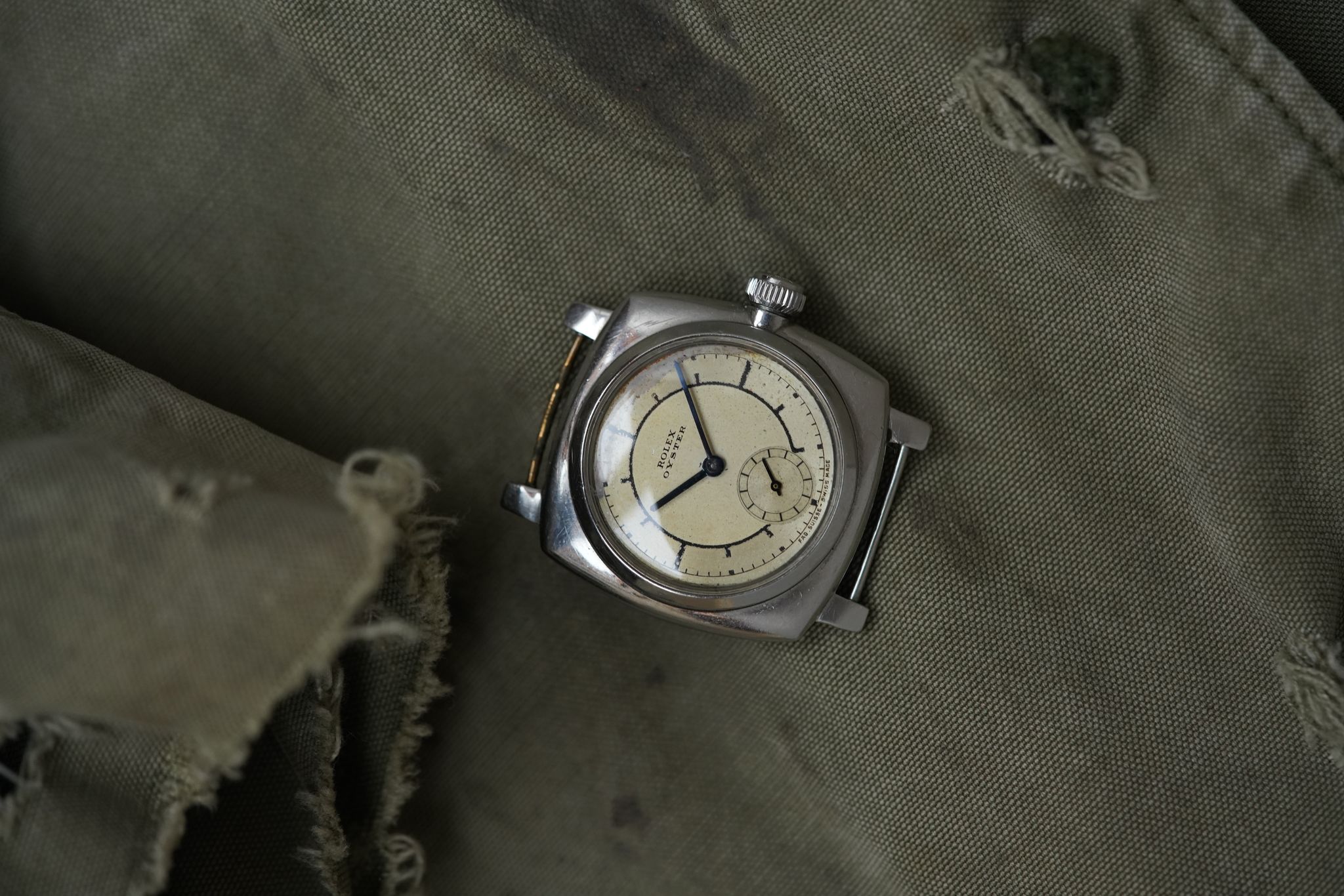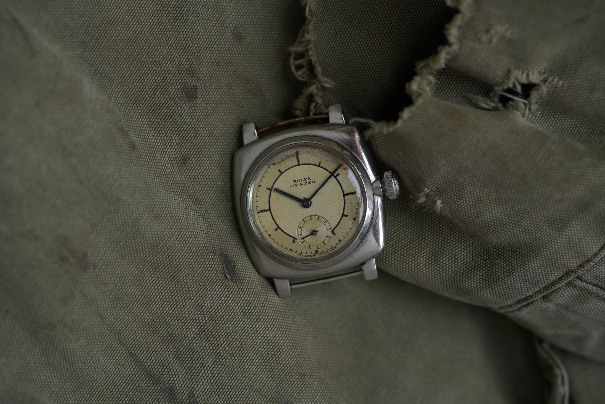 A most delightful design: a super rare cushion case Rolex Bubbleback with mesmerising large sector dial !