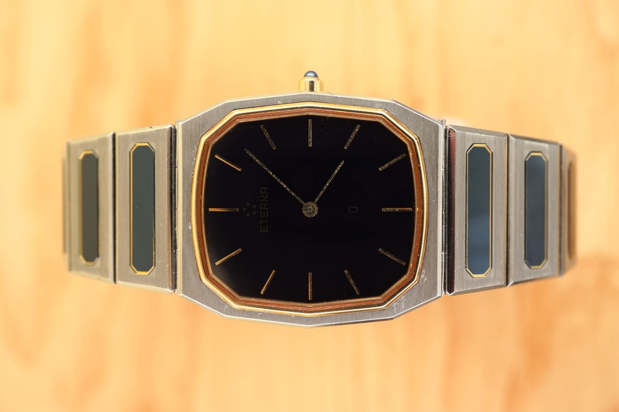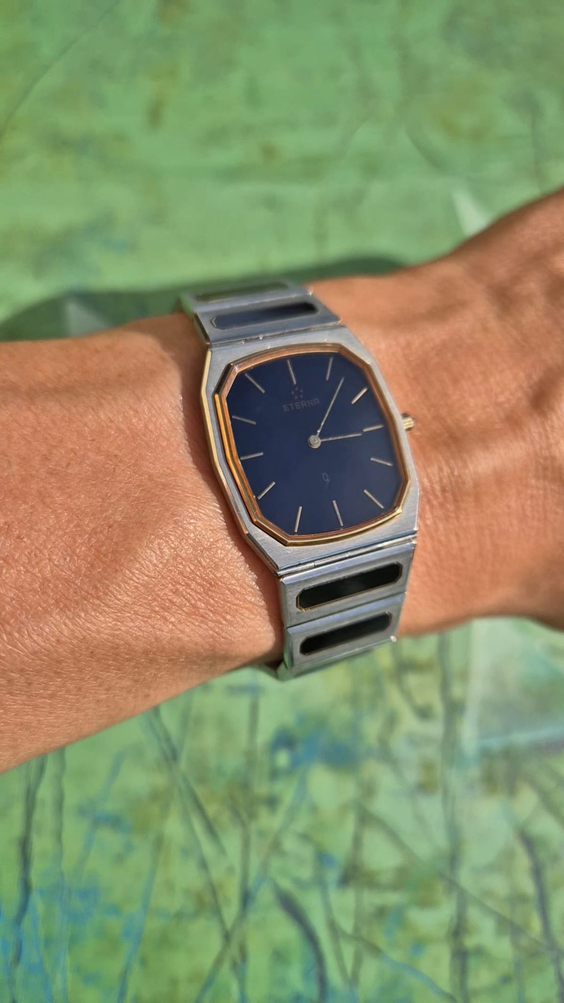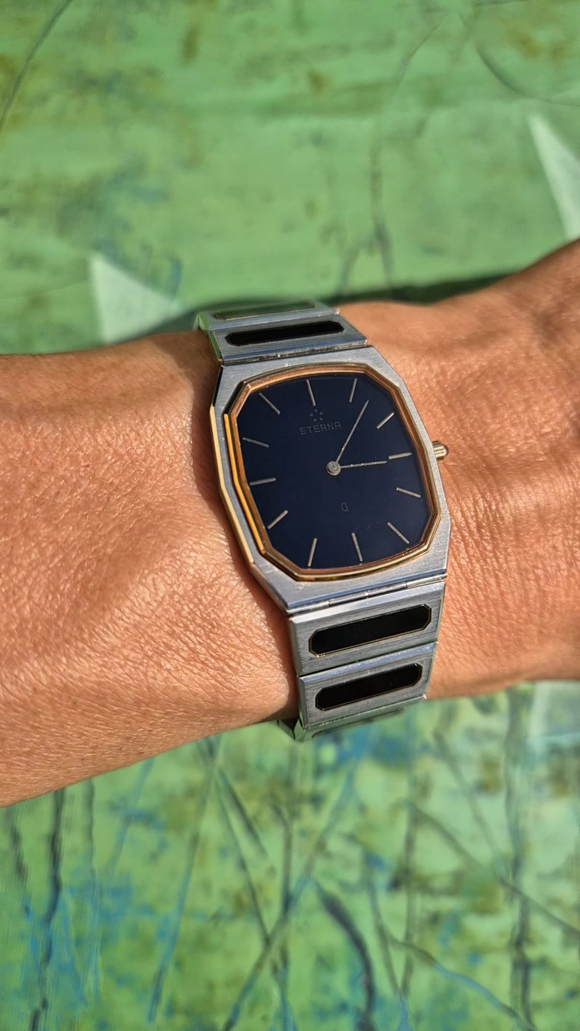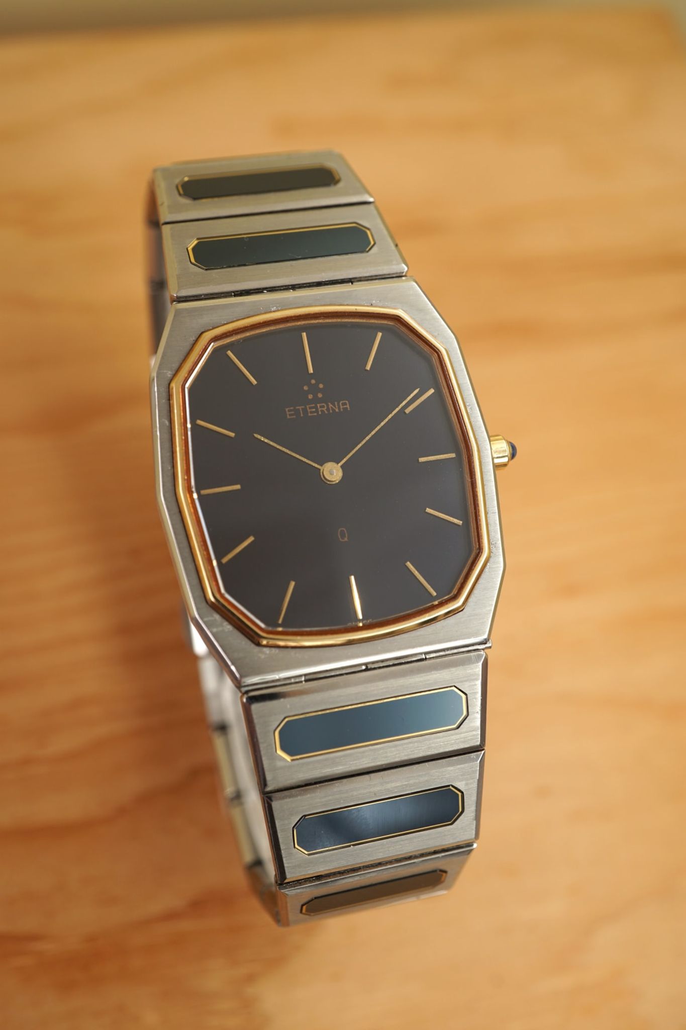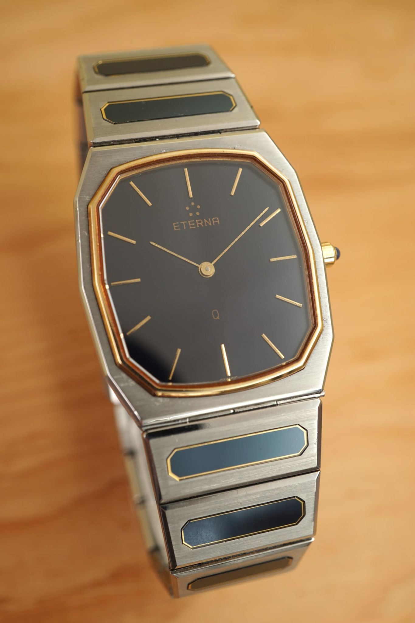 Silver-Gold-Blue in a slim and sharp thin case with a exalted integrated link-bracelet, housing a precise Eterna quartz-movement. Something sharp and on-time for the '80s Young Urban Professional (Yuppie) as an antidote to the late '70s Punk and his mechanical unprecise watch.