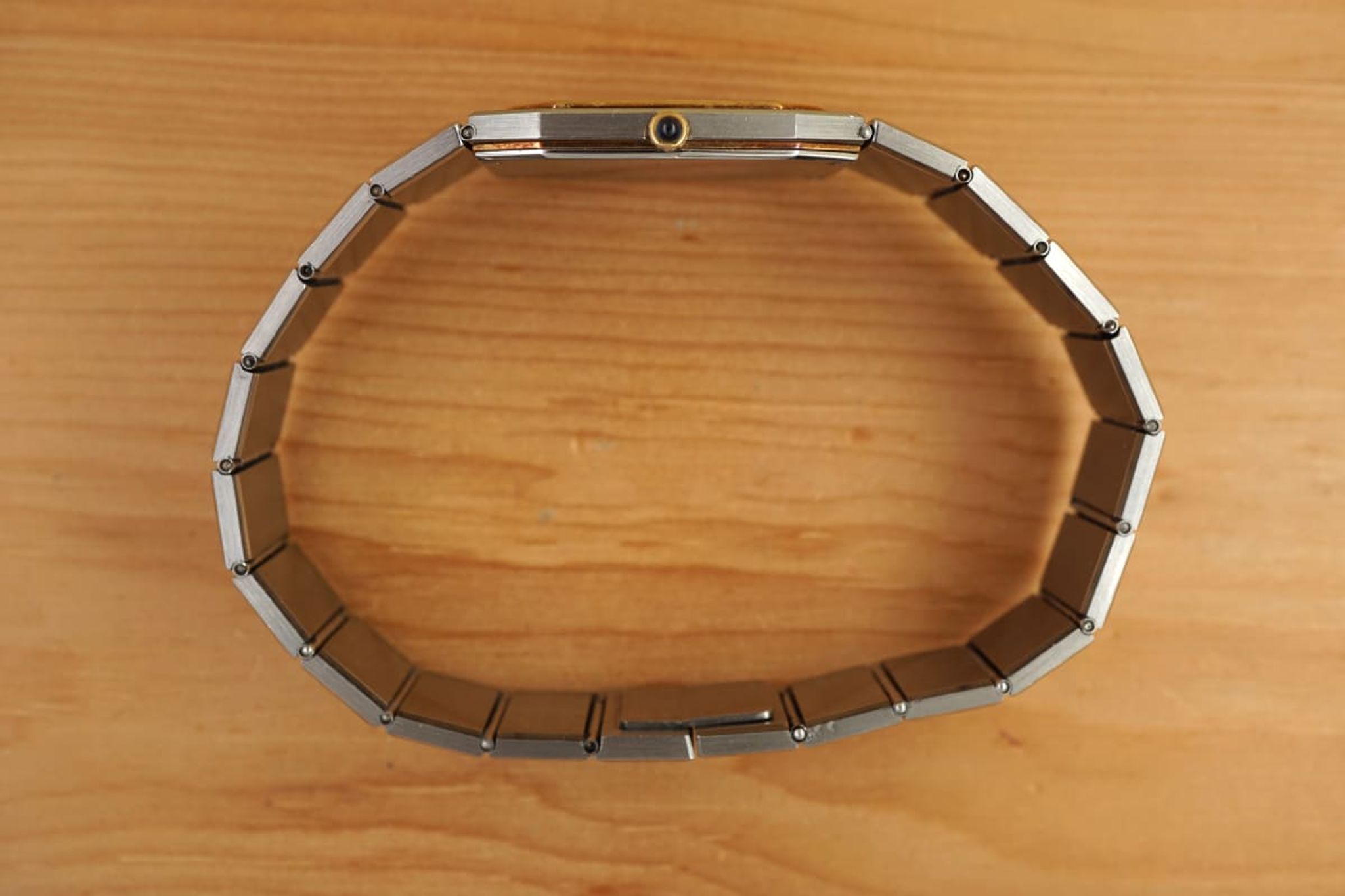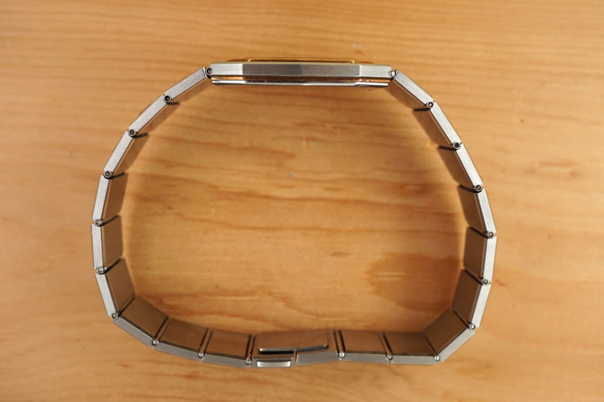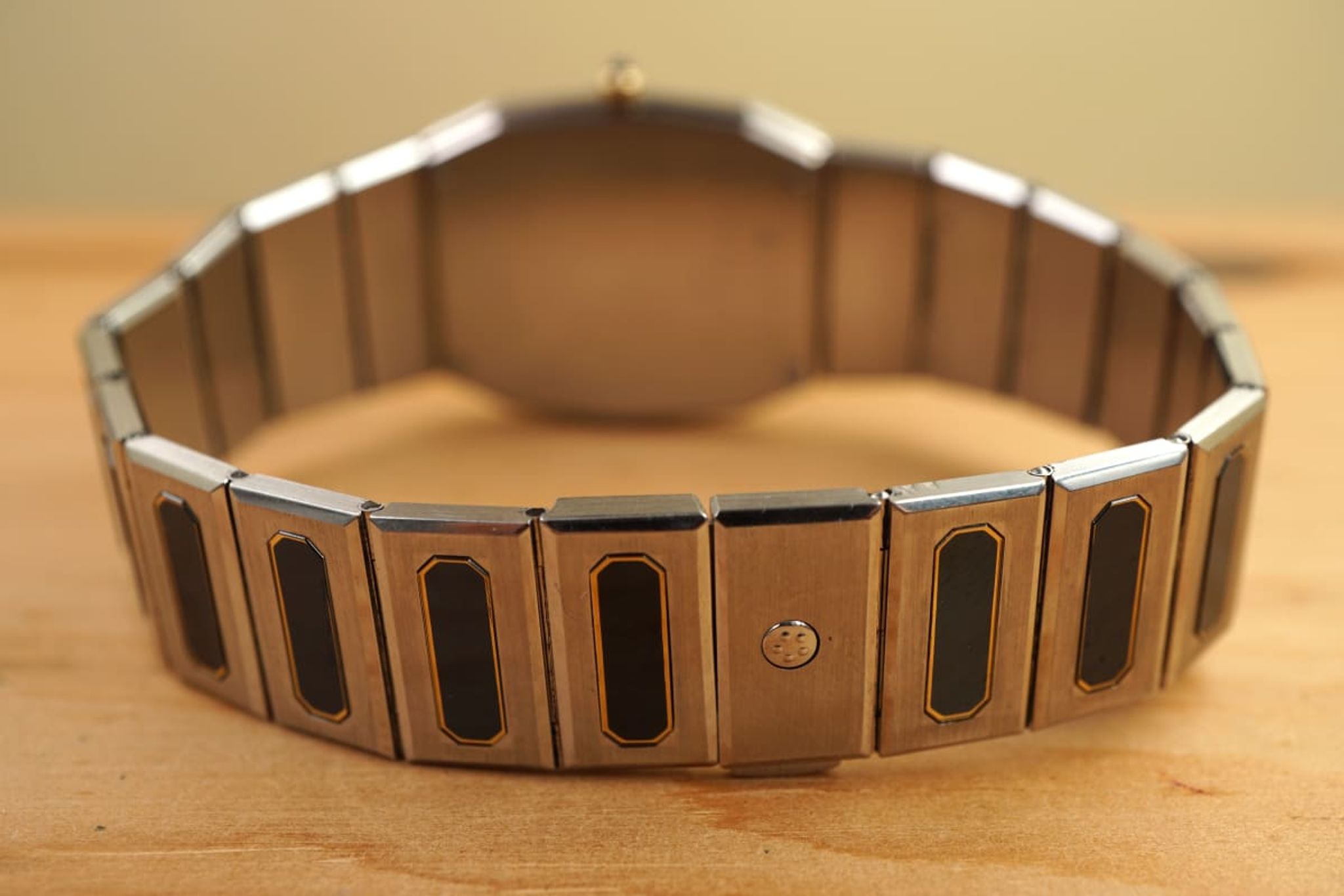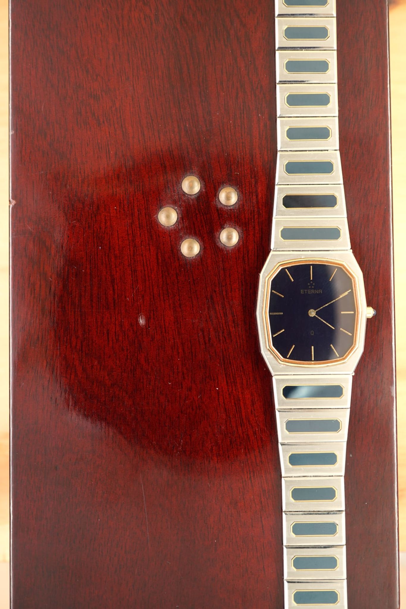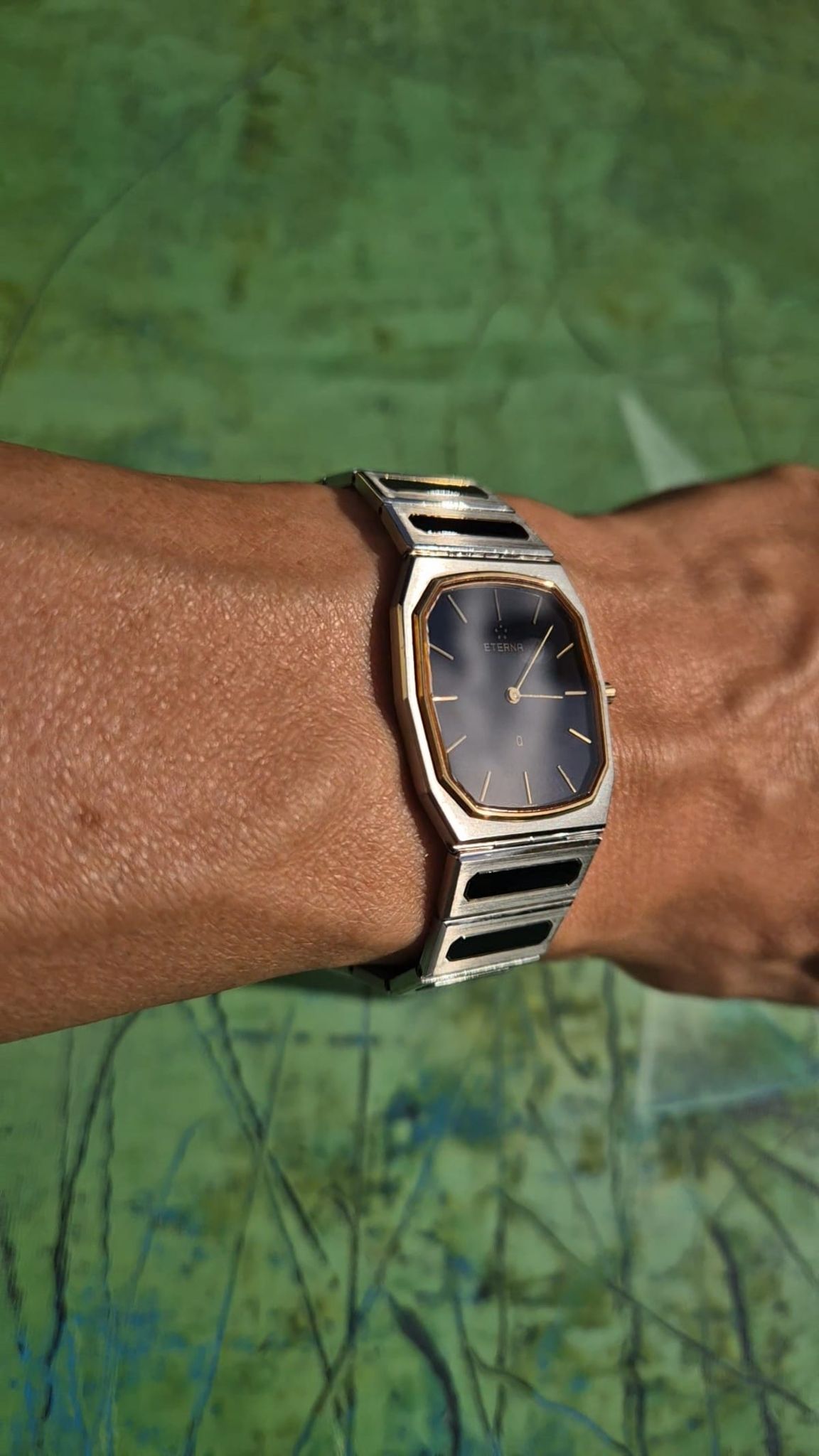 Silver-Gold-Blue in a slim and sharp thin case with a exalted integrated link-bracelet, housing a precise Eterna quartz-movement. Something sharp and on-time for the '80s Young Urban Professional (Yuppie) as an antidote to the late '70s Punk and his mechanical unprecise watch.