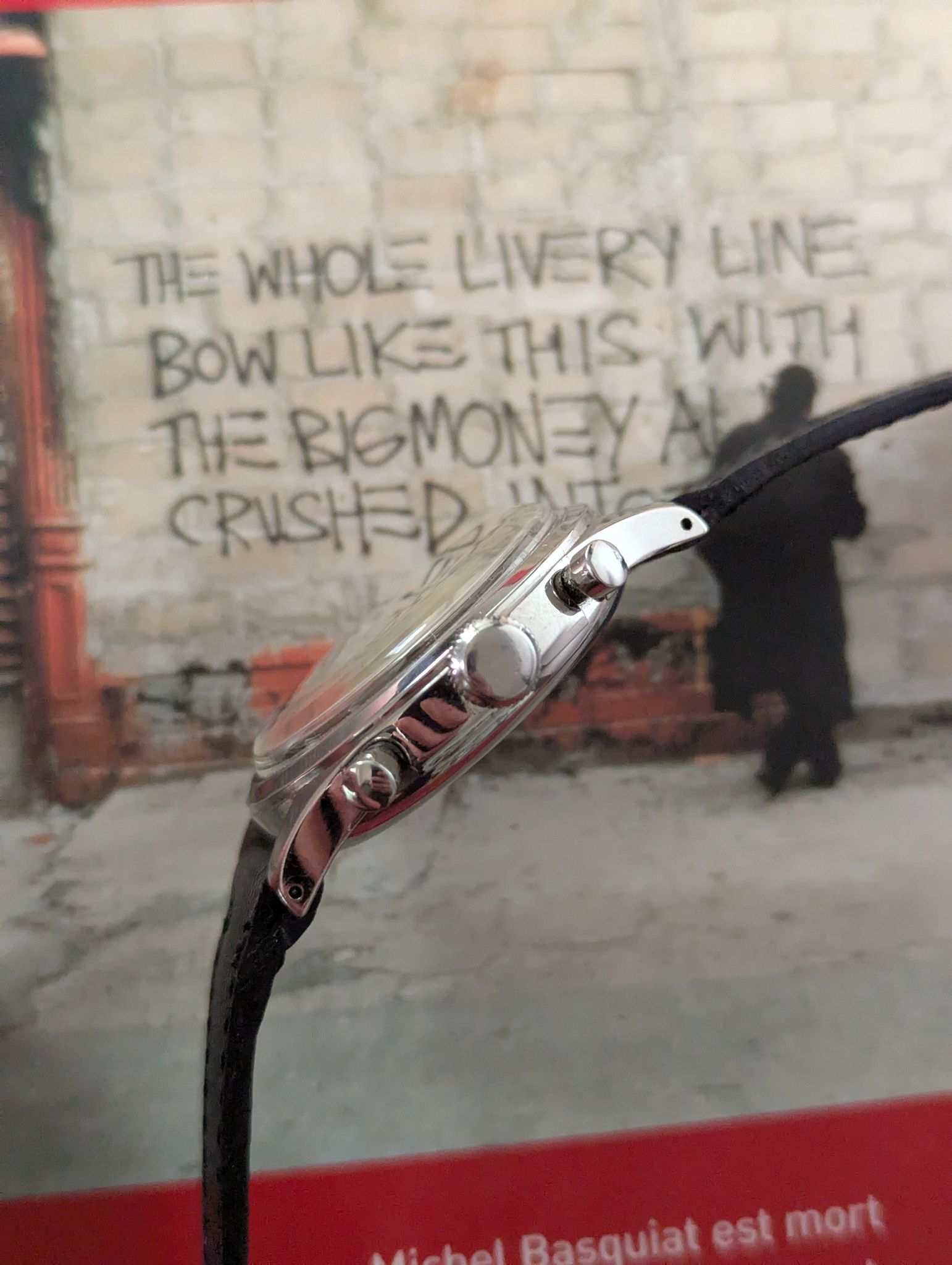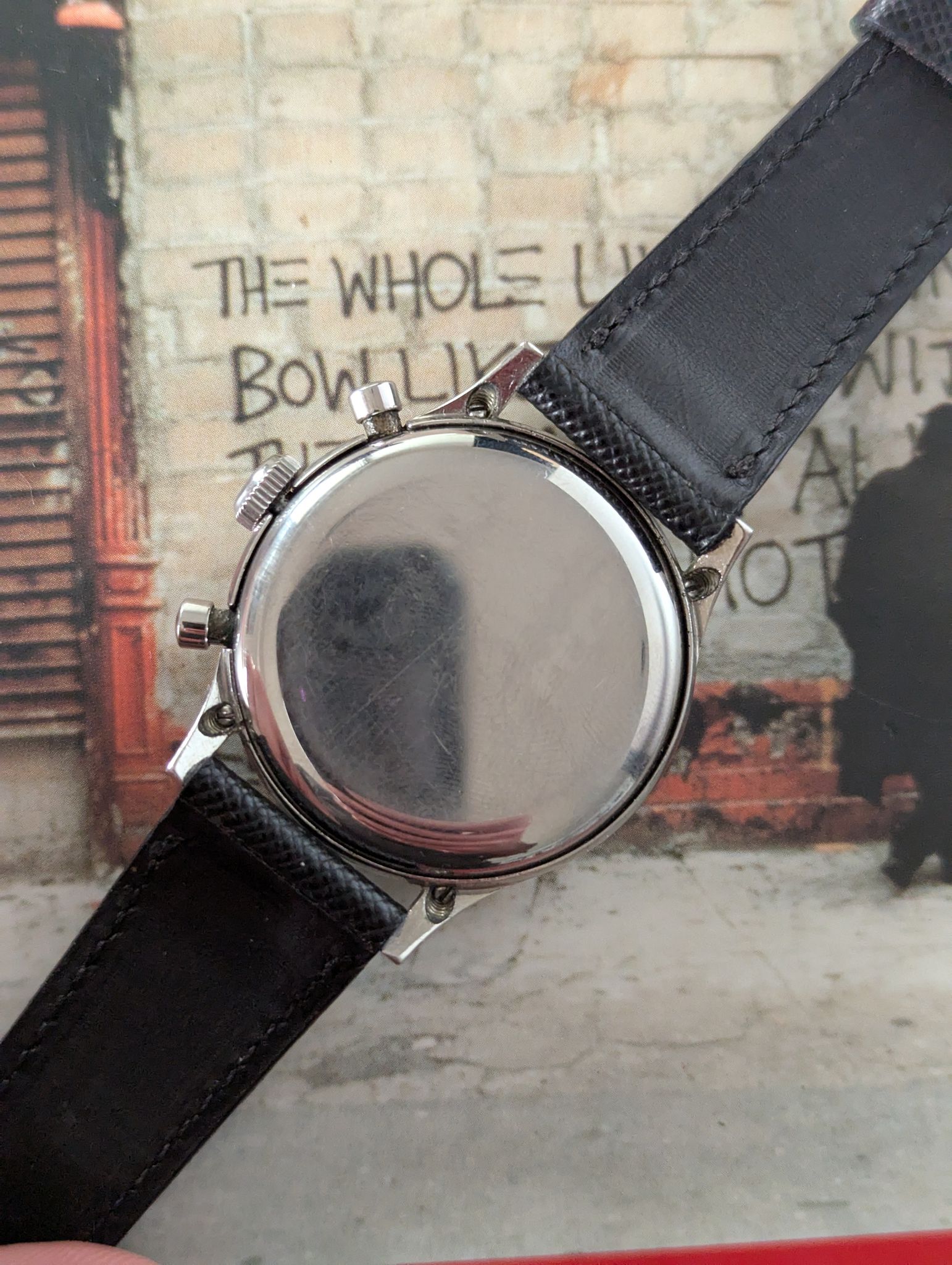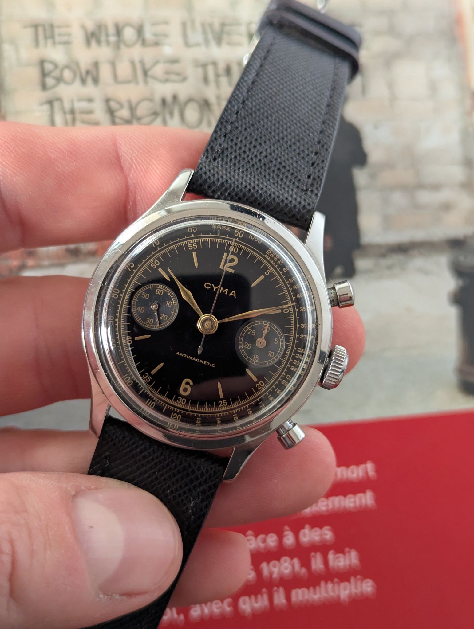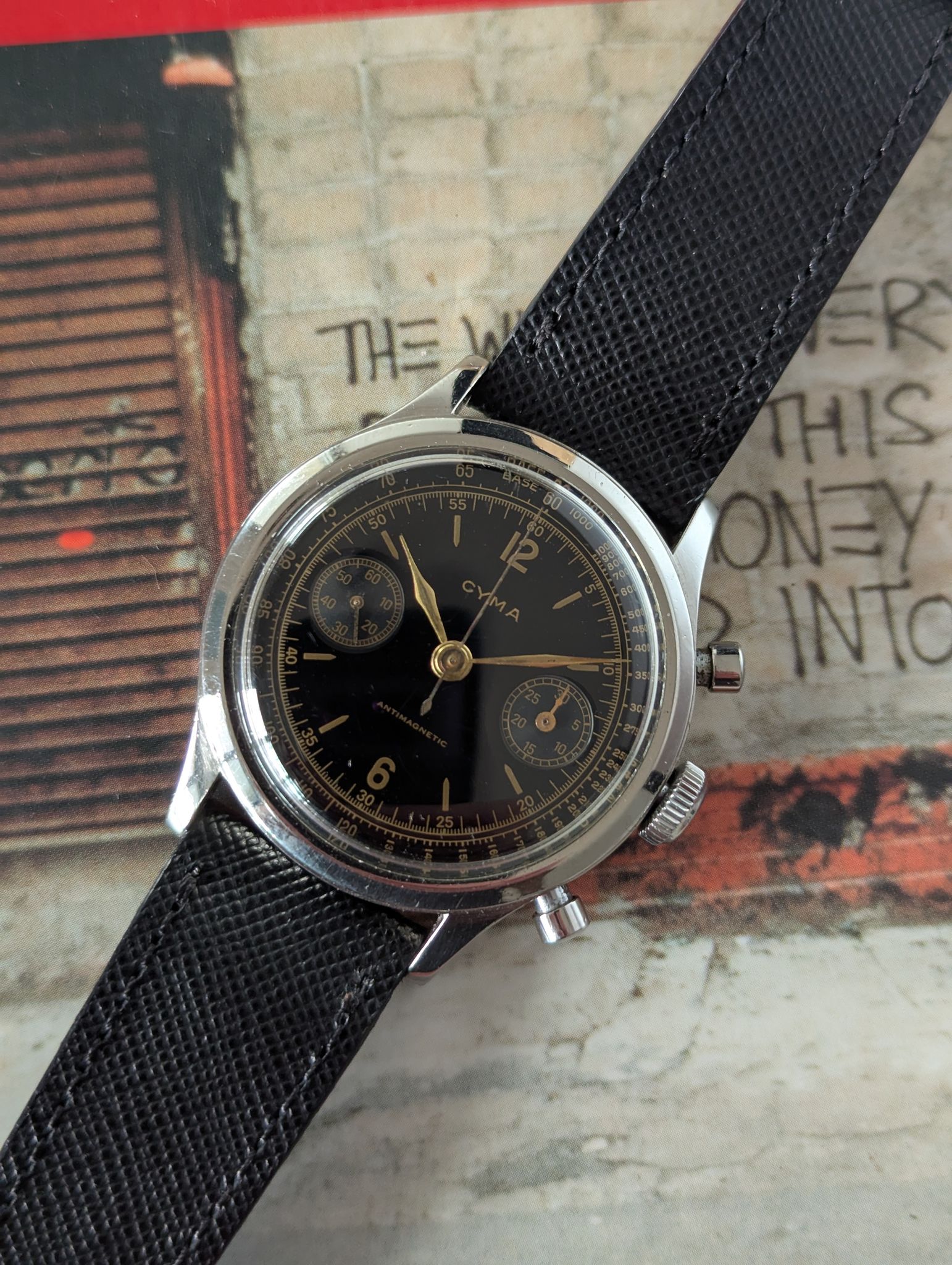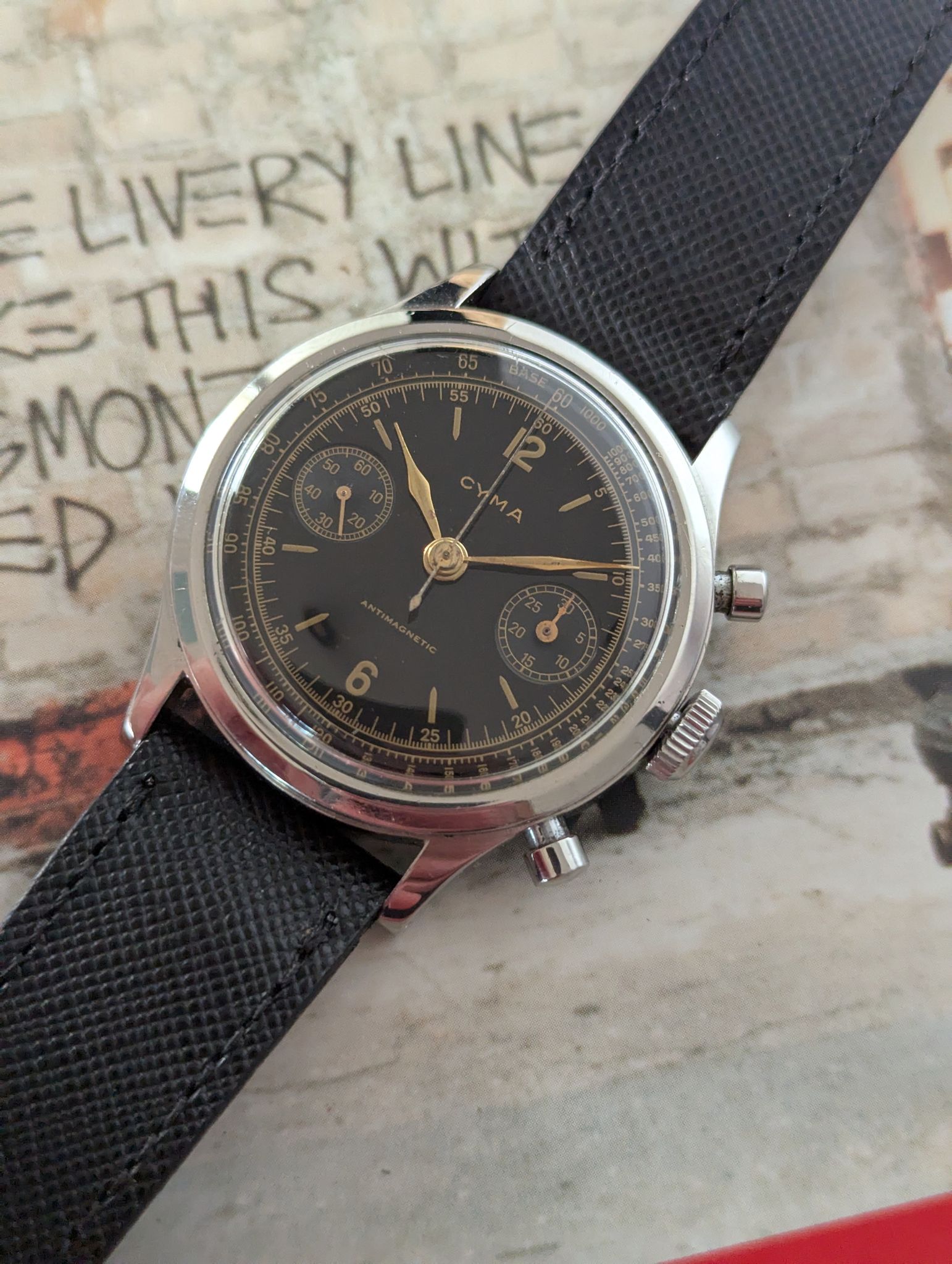 This 1950s Cyma oversized chronograph is a standout vintage timepiece, featuring a 38mm stainless steel clamshell case that offers both durability and a bold wrist presence. The black lacquered dial adds a touch of elegance and contrast, beautifully complemented by silver-tone sub-dials and gold accents, on the markings and minute track, and leaf hands.