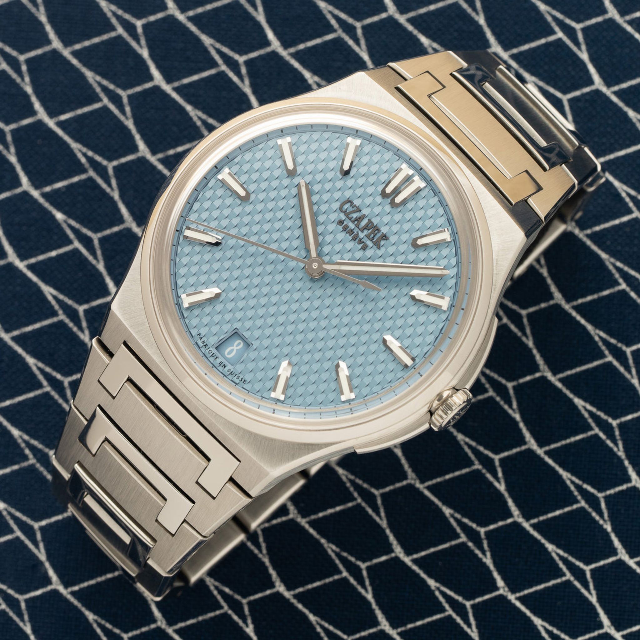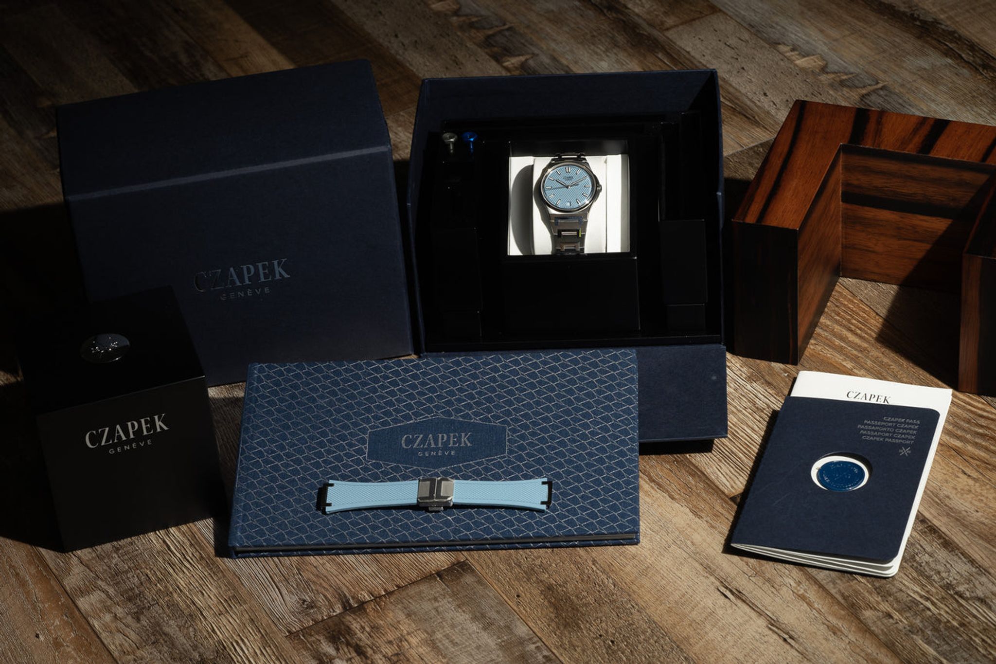 Accessories: Comes complete with inner and outer boxes, warranty papers, strap tool, extra rubber strap in light blue and a Czapek catalog.