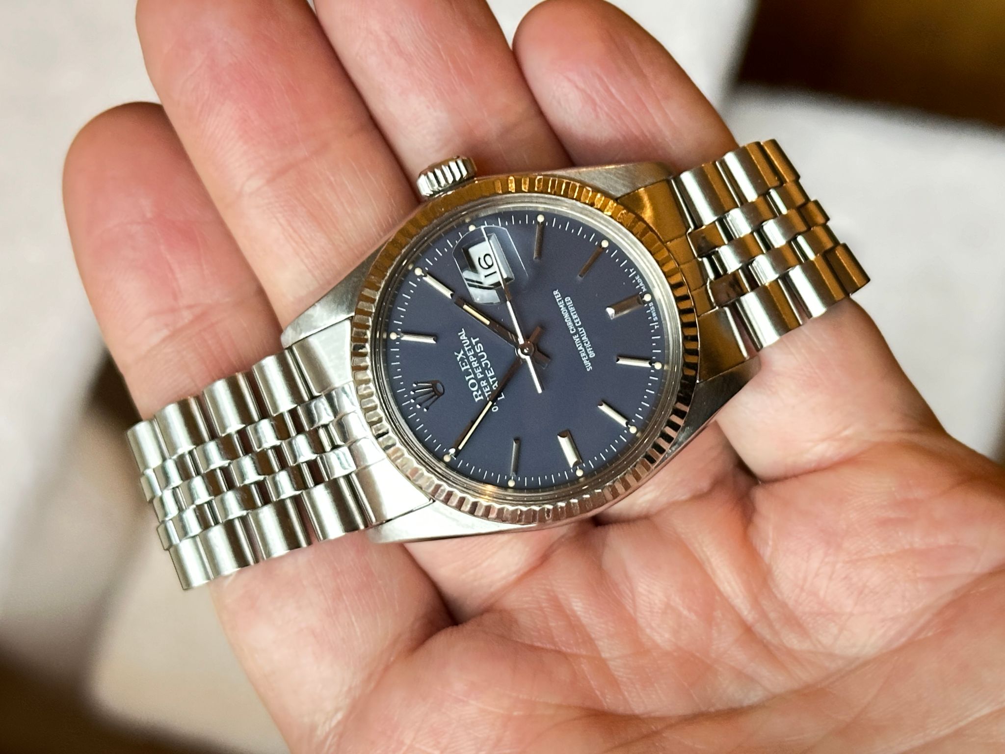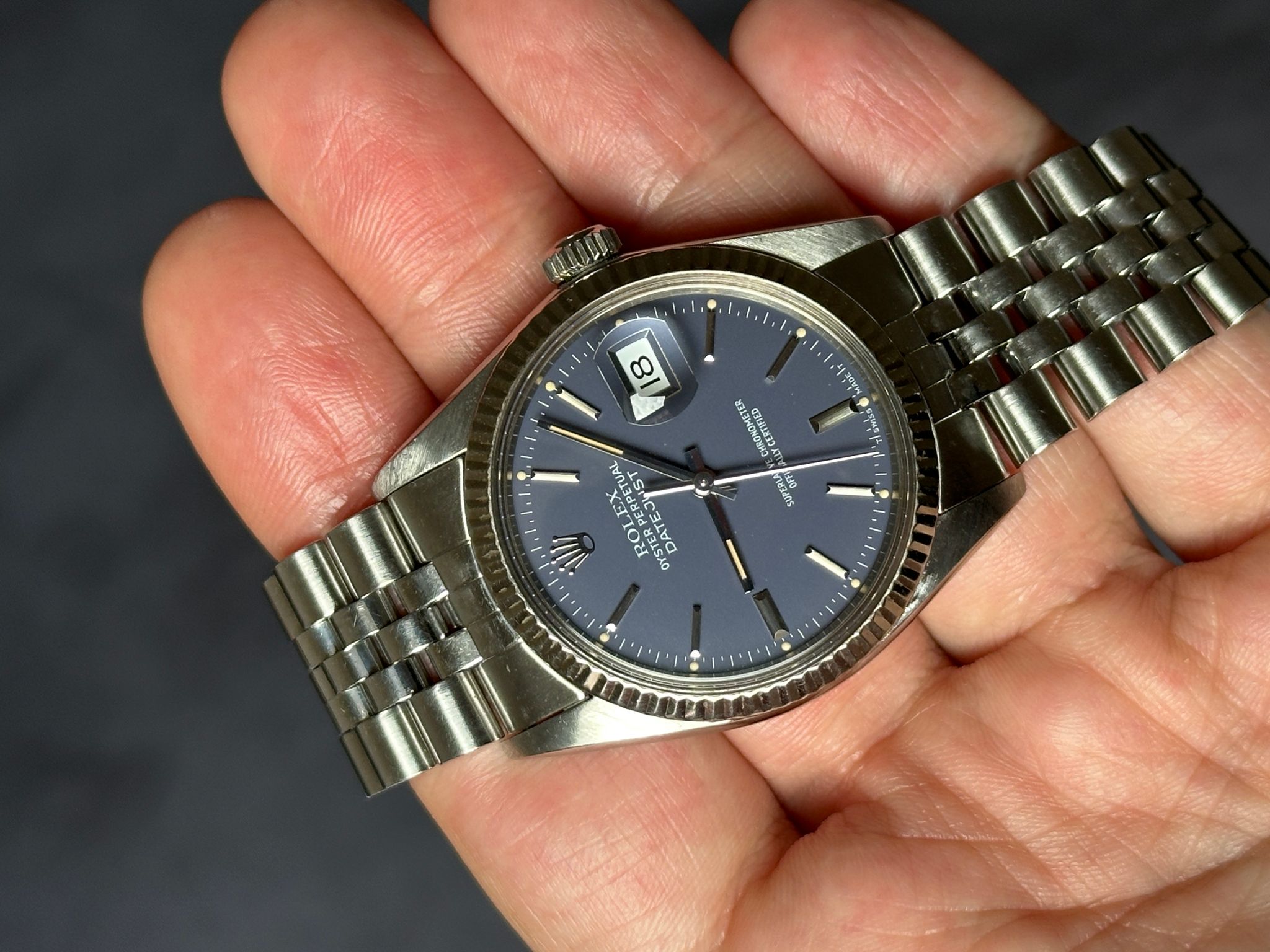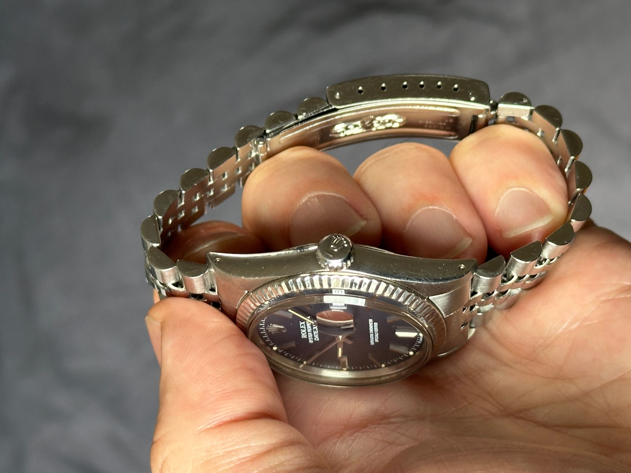 Stunning purple/blue Datejust reference 16014 from 1985. Perfect dial, lightly polished case with normal wear. Caseback even has remnants of caseback sticker.