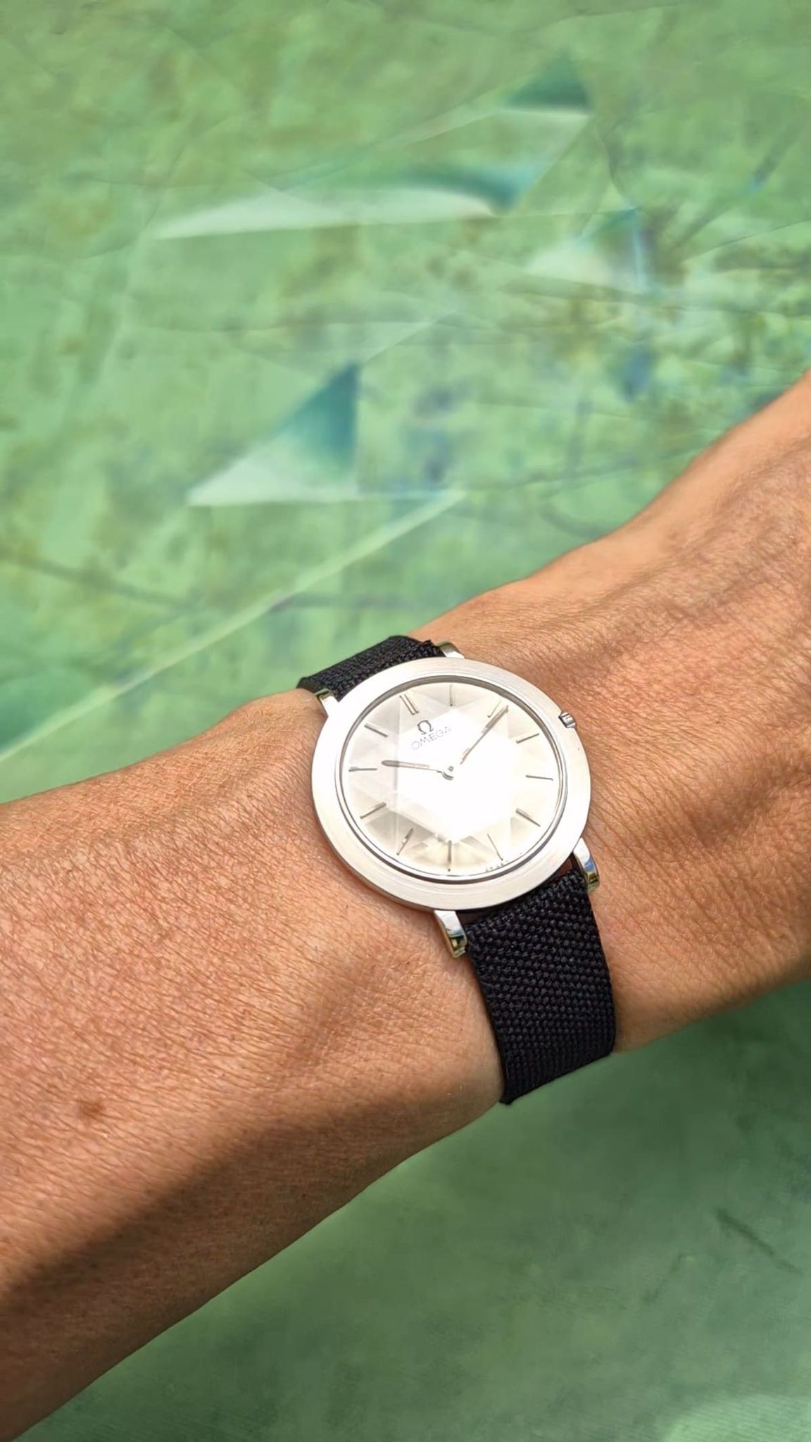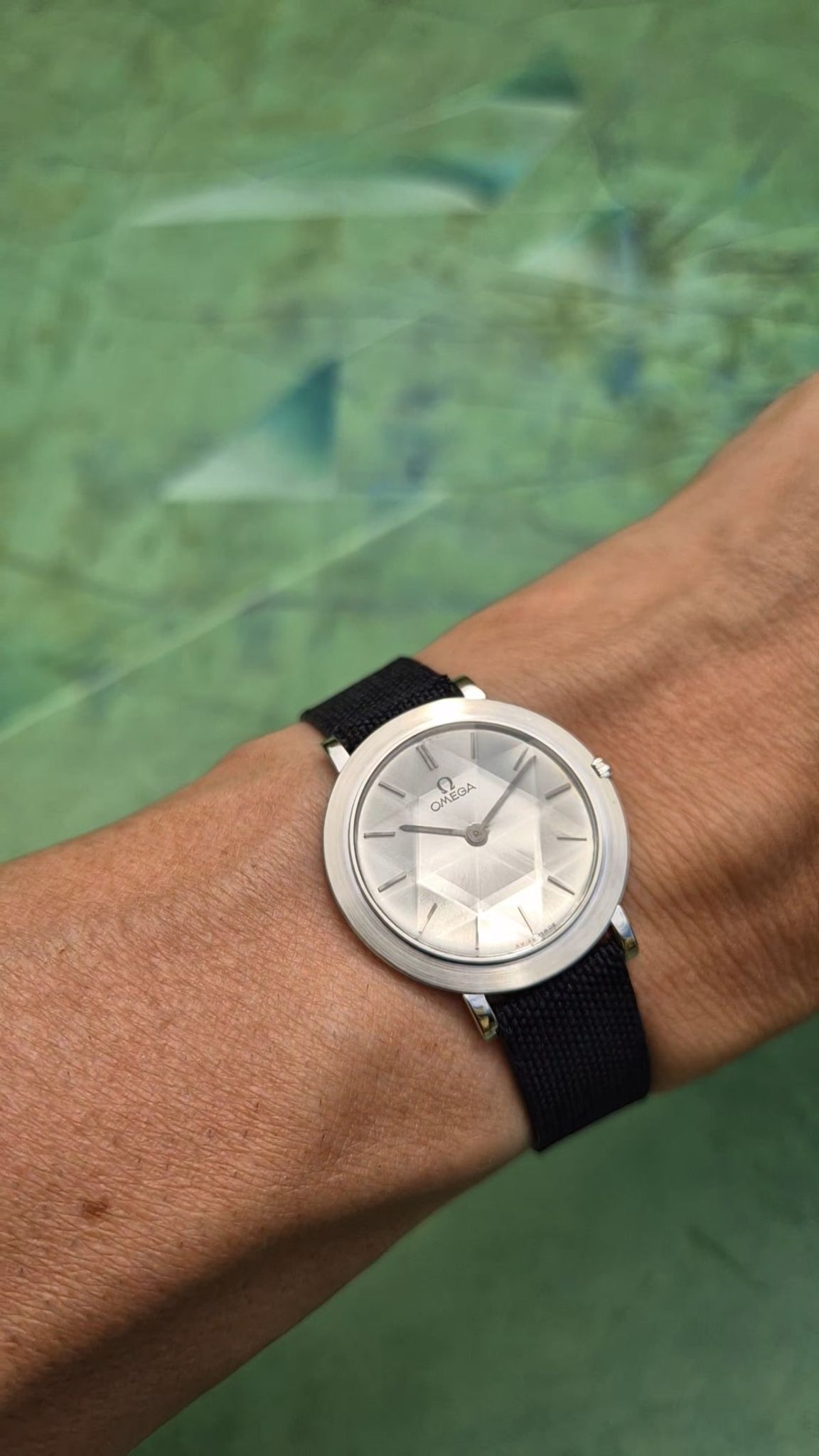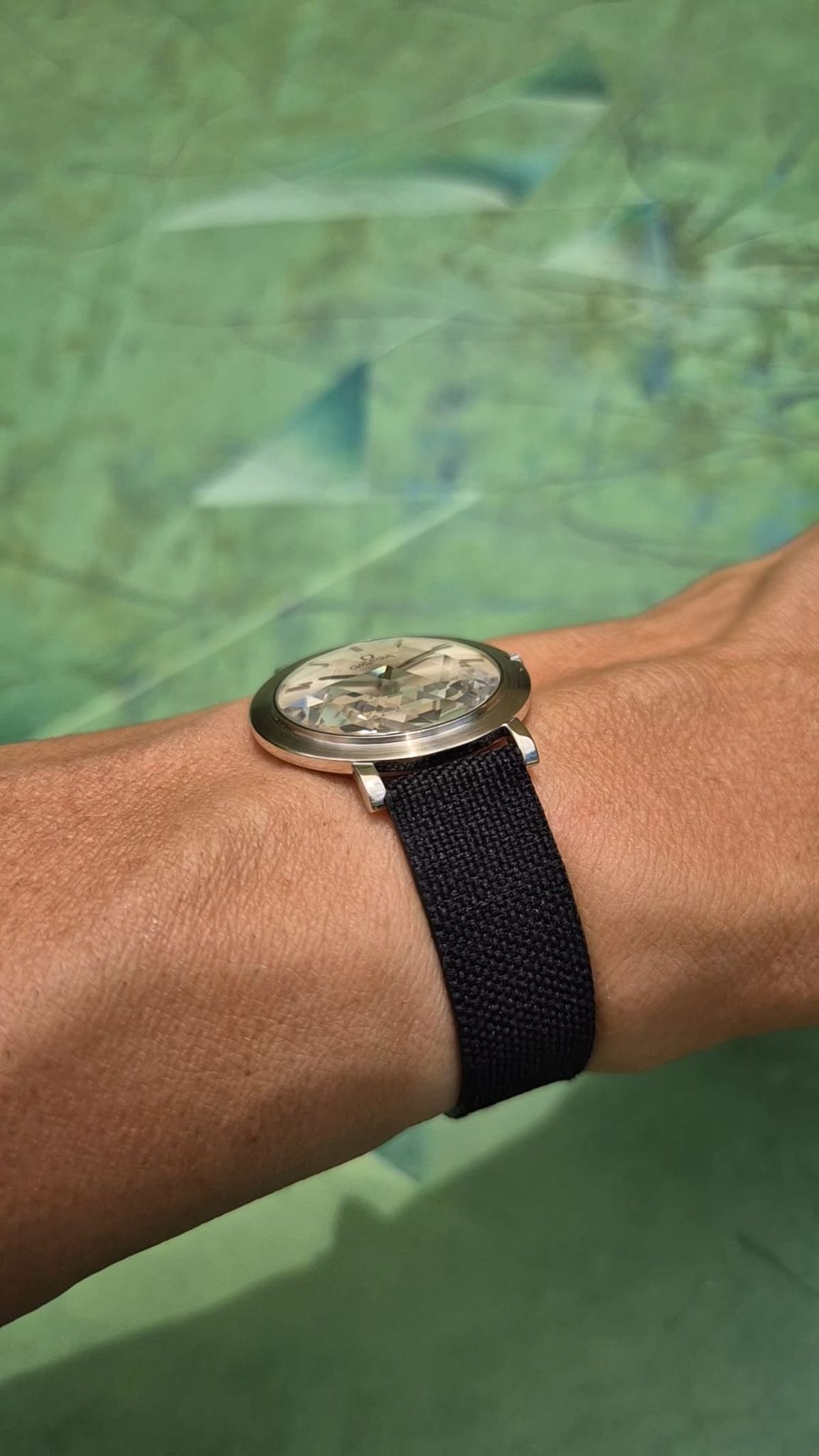 The original Damier was made by Omega for Marcus Neymann Jewelers in 1959 and from a >7ct diamond used as crystal. A piece unique and priced USD10'000 more than six decades ago. Yes, and in 1960 Omega proudly used sapphire-crystals for the very first time, achieving a close-to-a-diamond-hardness -- and they celebrated this innovative use with a replica of this piece unique. The Omega "Damier" -- not unique but back then and especially nowadays quite close to this. It is to my knowledge the first use of sapphire-crystal by Omega and it is diamond-like faceted and sparkles alike. Truly astonishing!