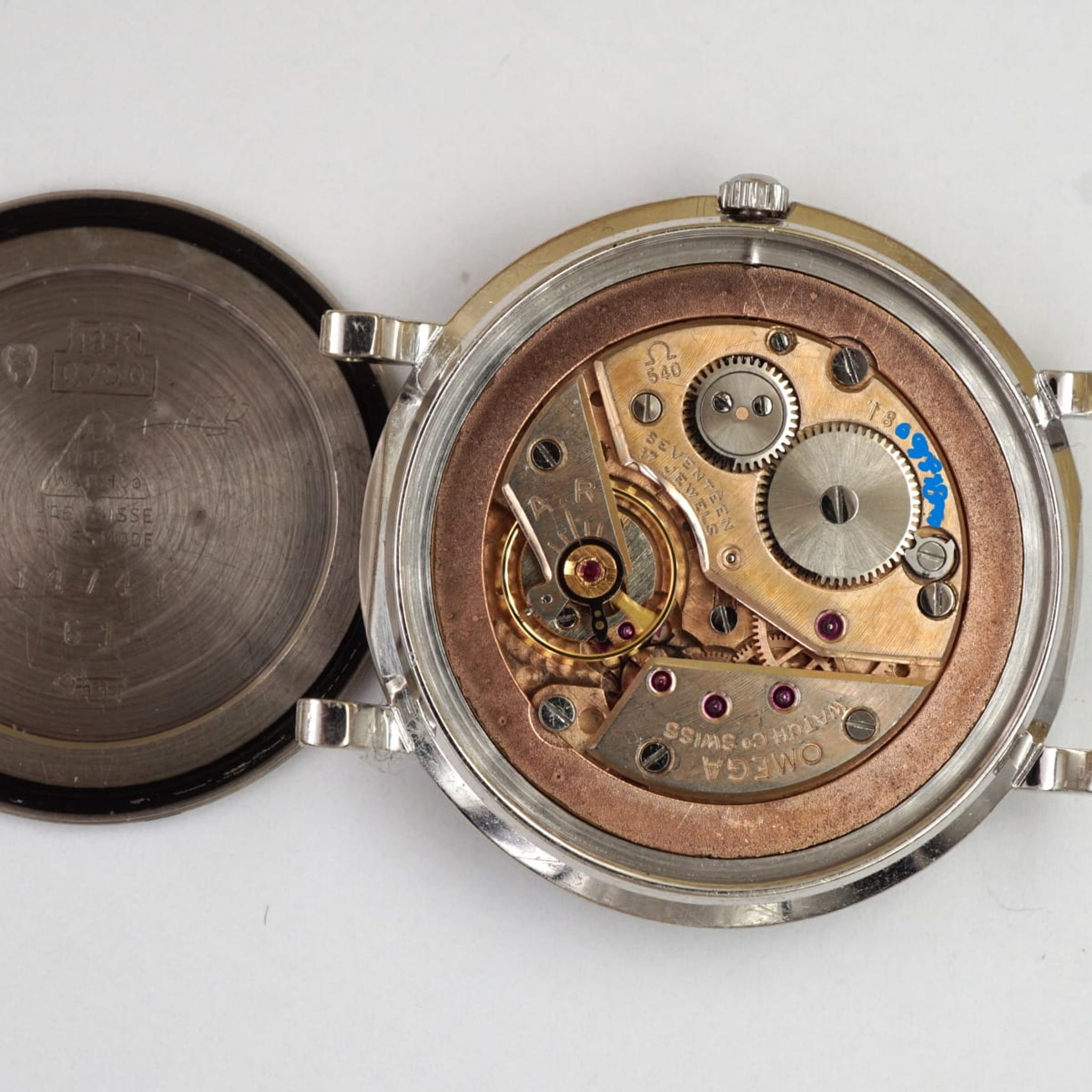 Below the crystal runs another horological milestone: the cal540 by Omega, which is basically the Piaget cal9P with slightly modified bridge-design. Developed in 1957 by Piaget and a sensational 2mm in thickness. A grand success in the most important horological complication: miniaturization.