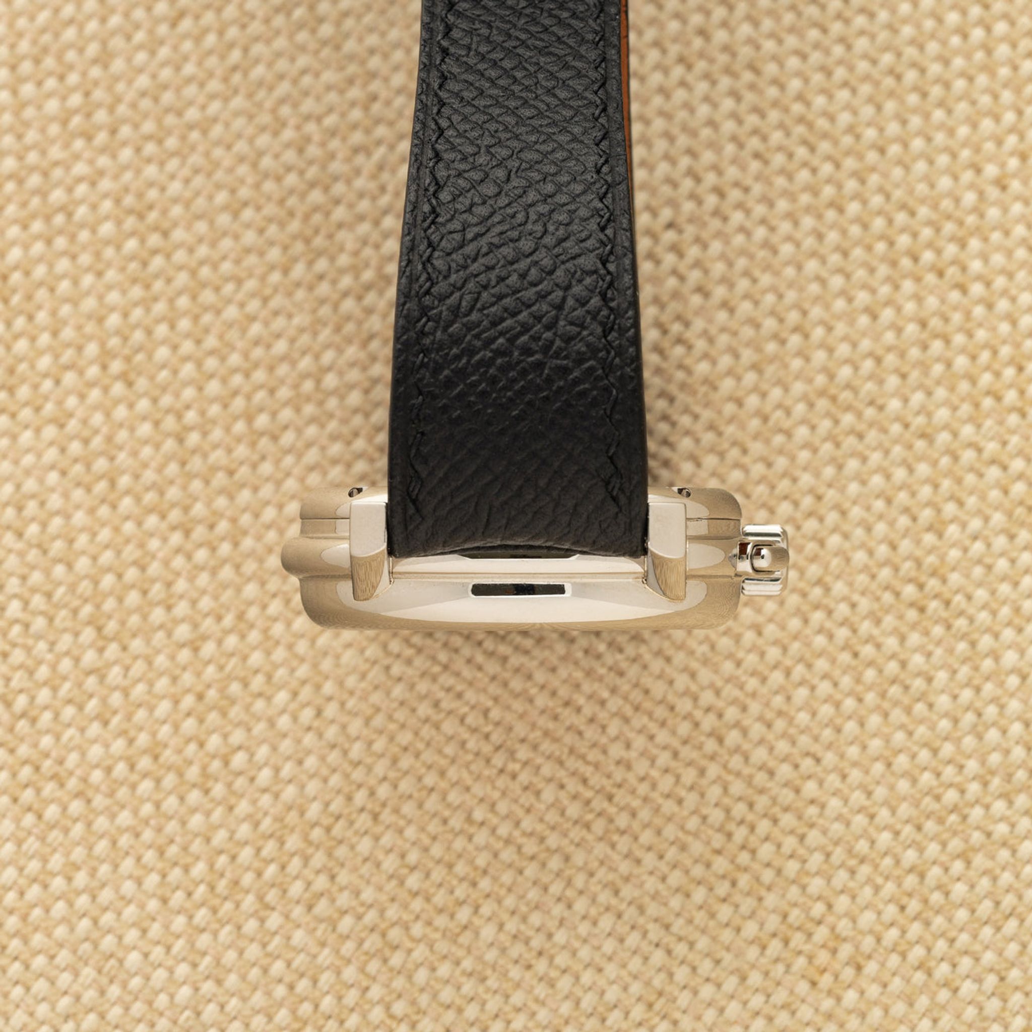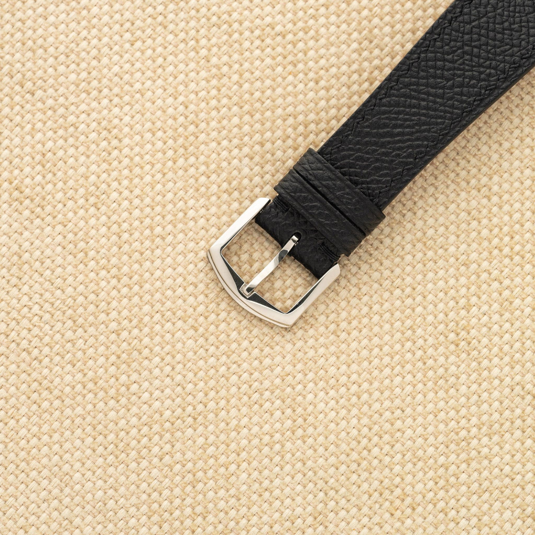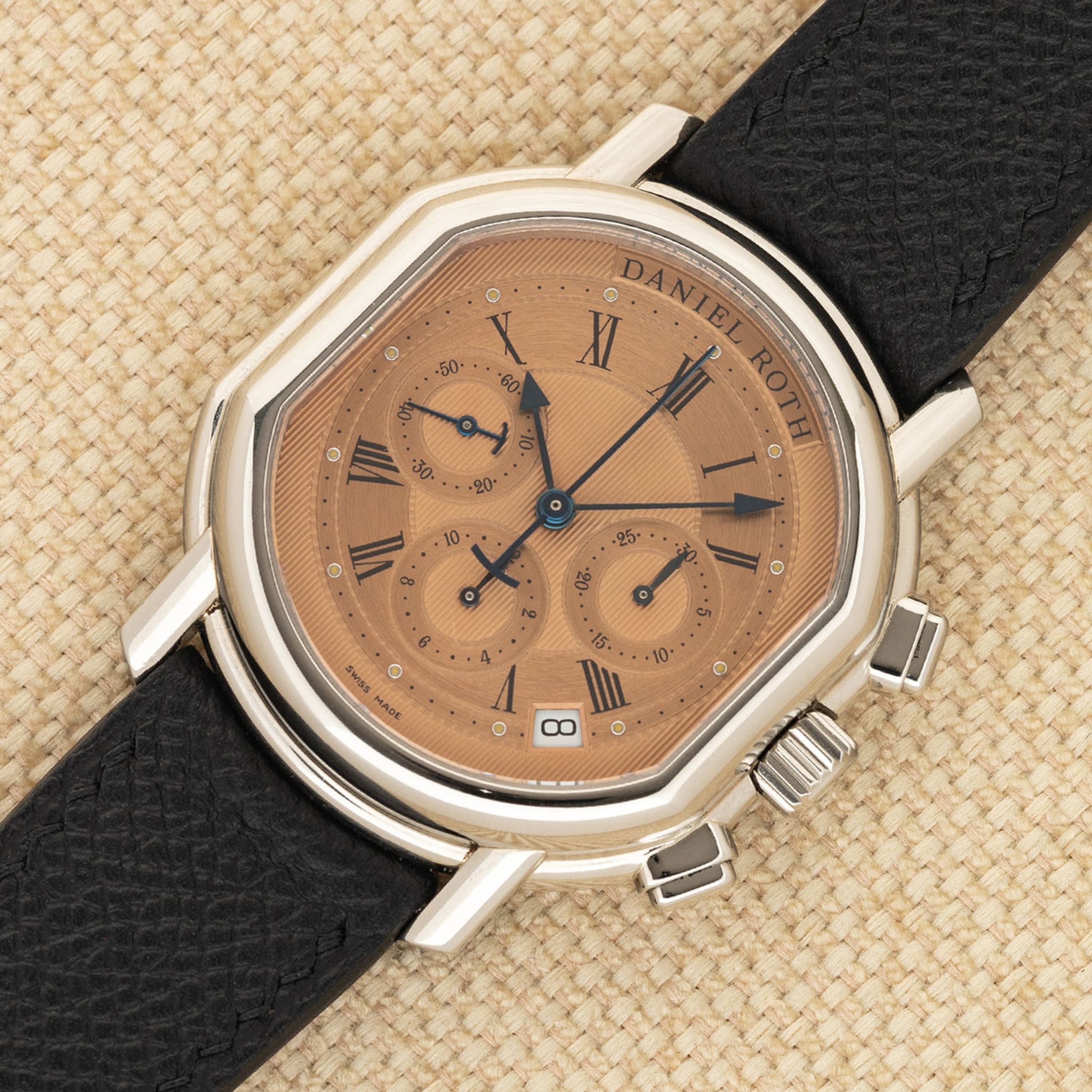 Bracelet: Two piece pebbled leather strap in black. Correct Daniel Roth buckle in steel.