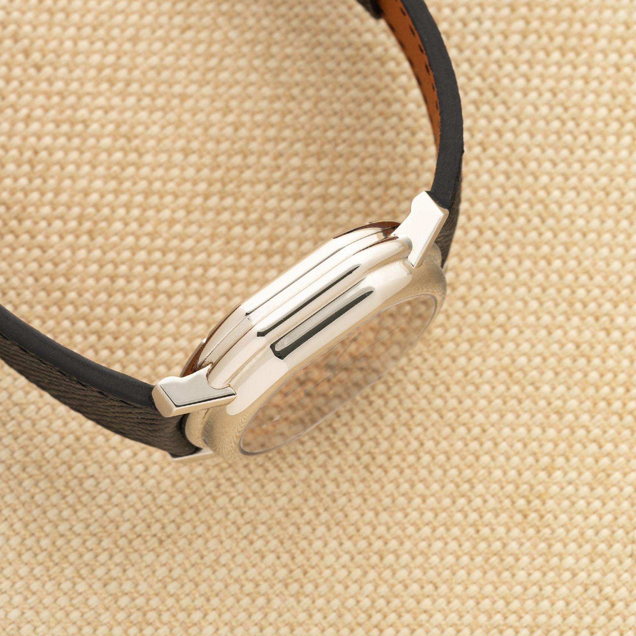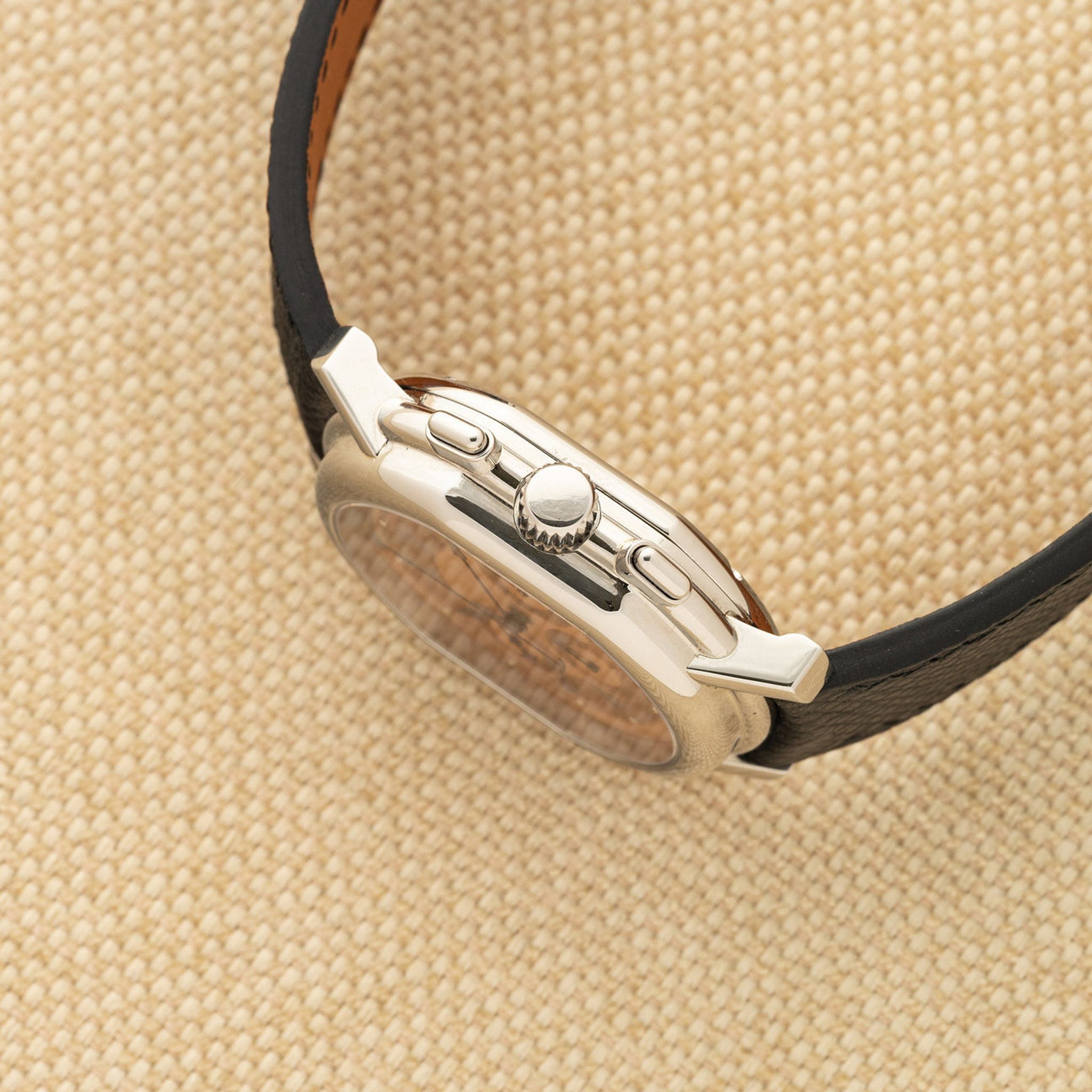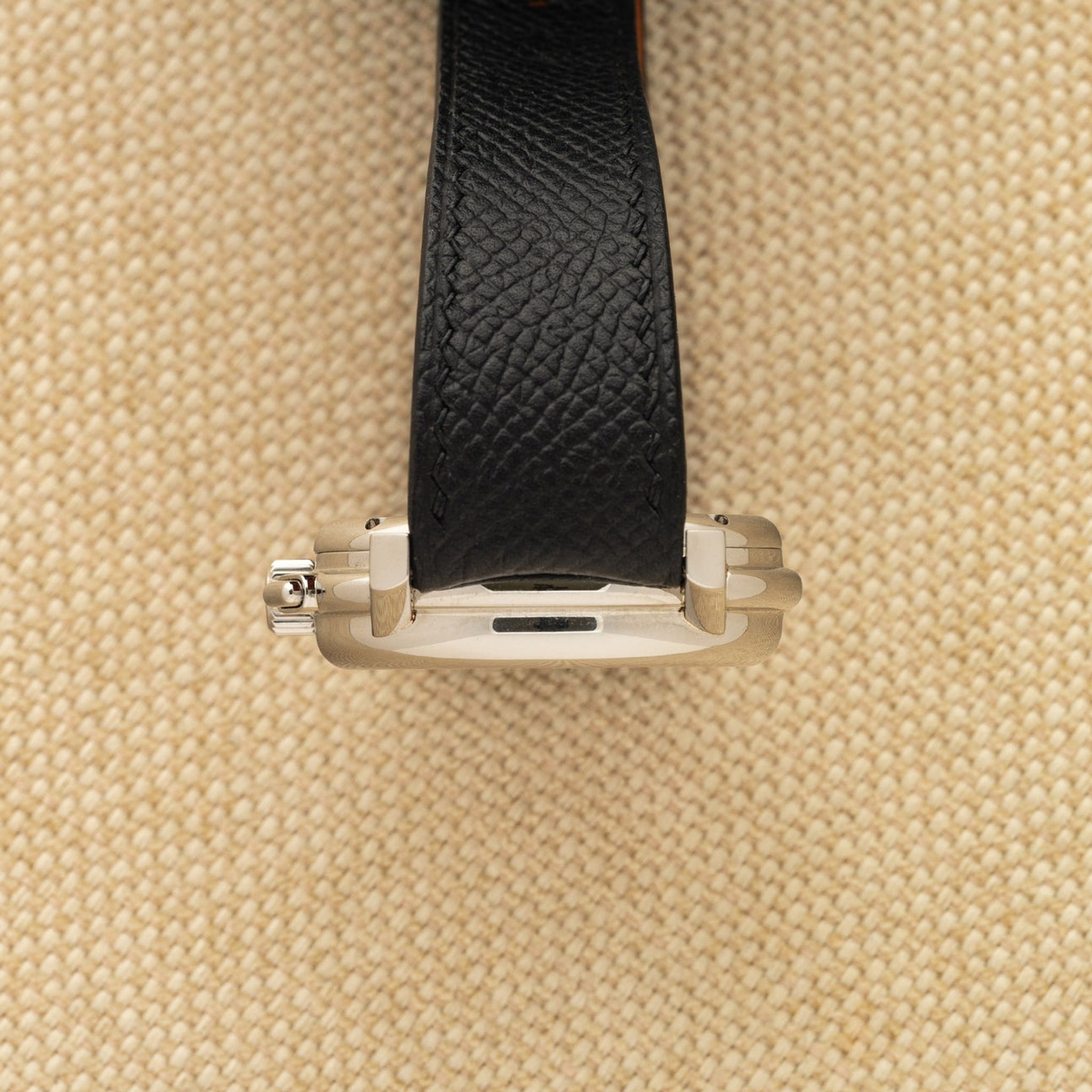 Bracelet: Two piece pebbled leather strap in black. Correct Daniel Roth buckle in steel.