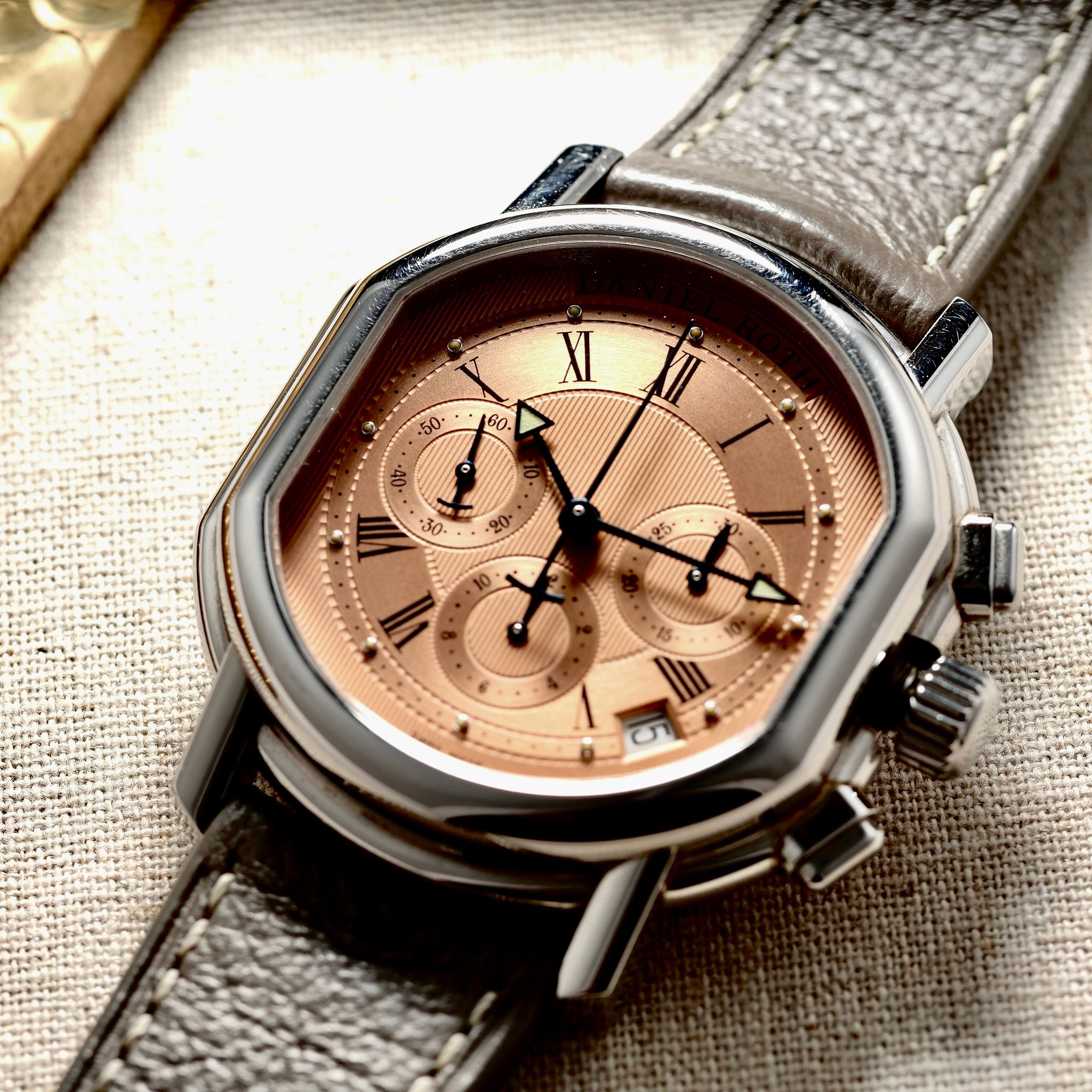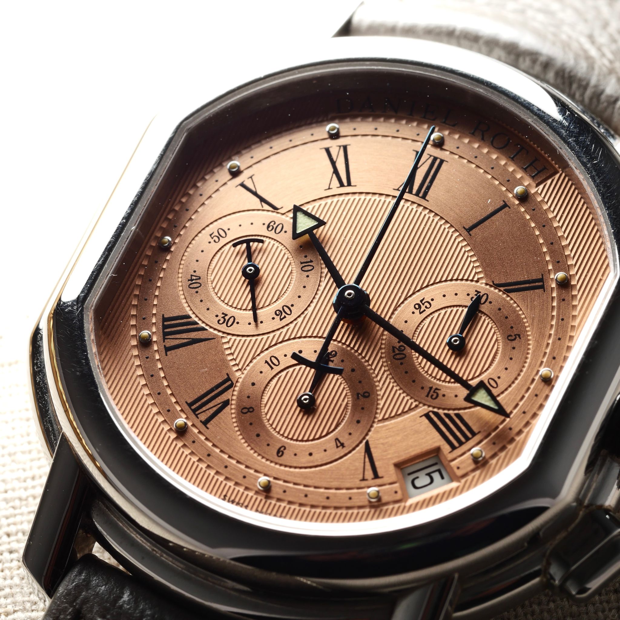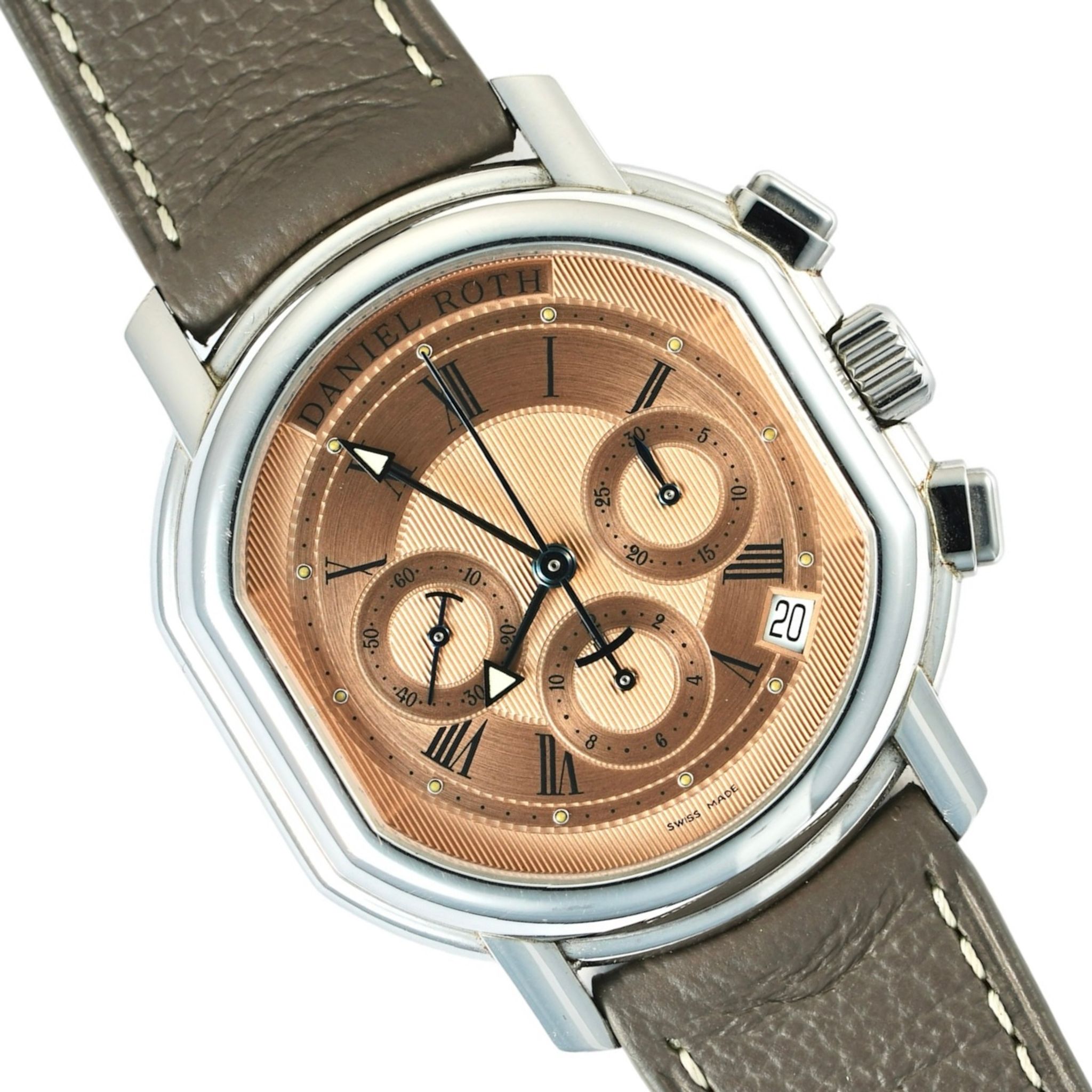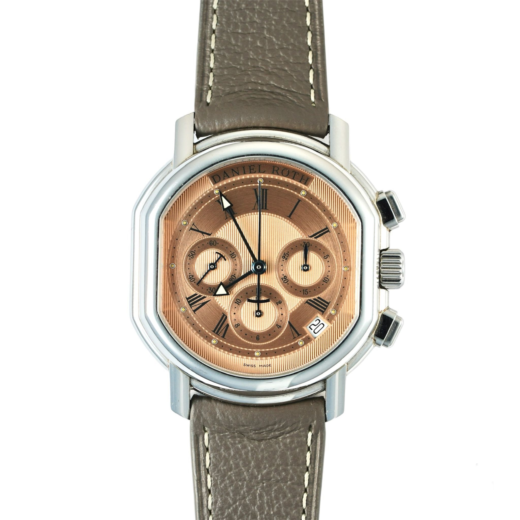 Presented here in excellent condition with the rare original salmon dial, this early second-generation Daniel Roth Chronograph comes equipped with a high-quality Zenith El Primero 400 movement, also used on the Rolex Daytona 16520s