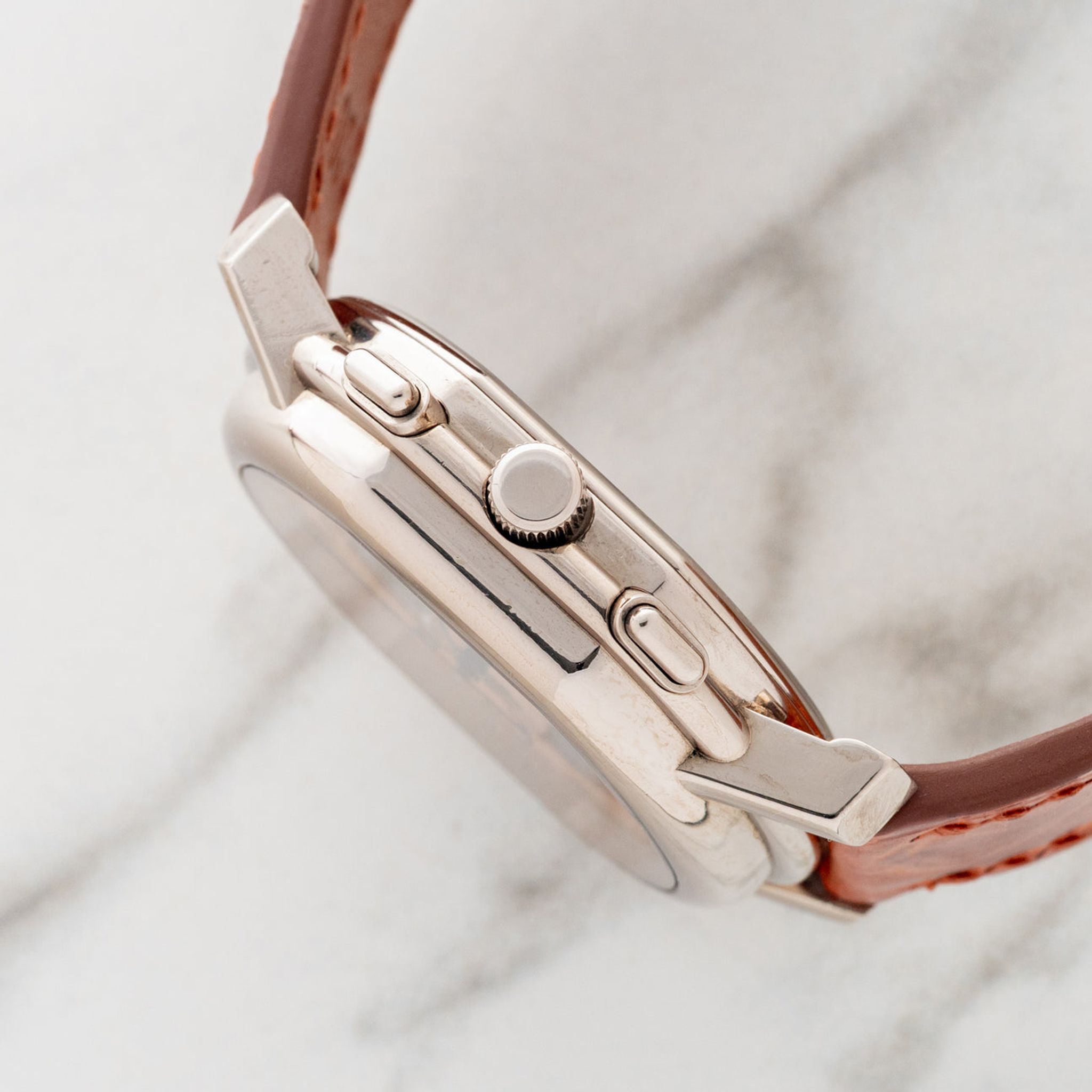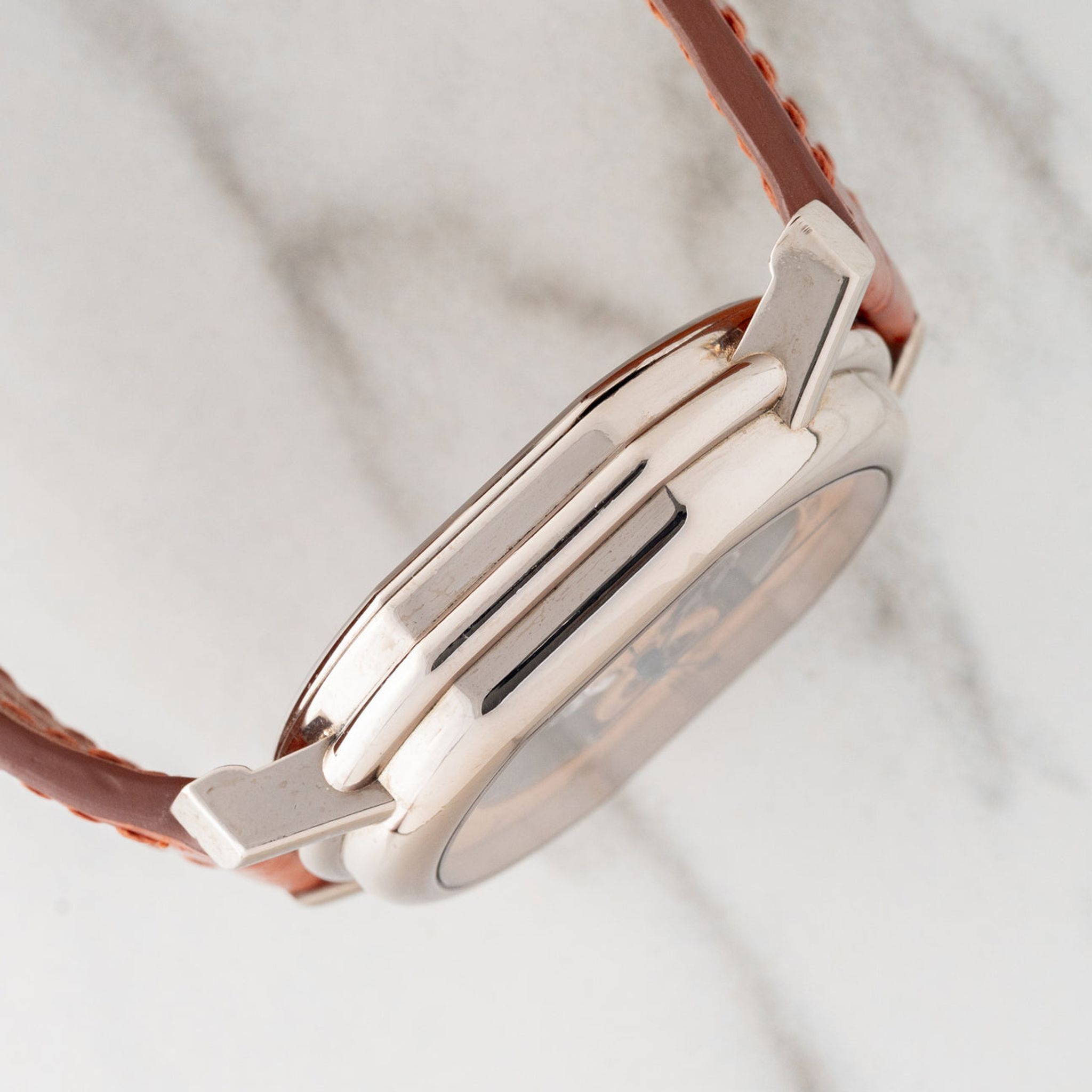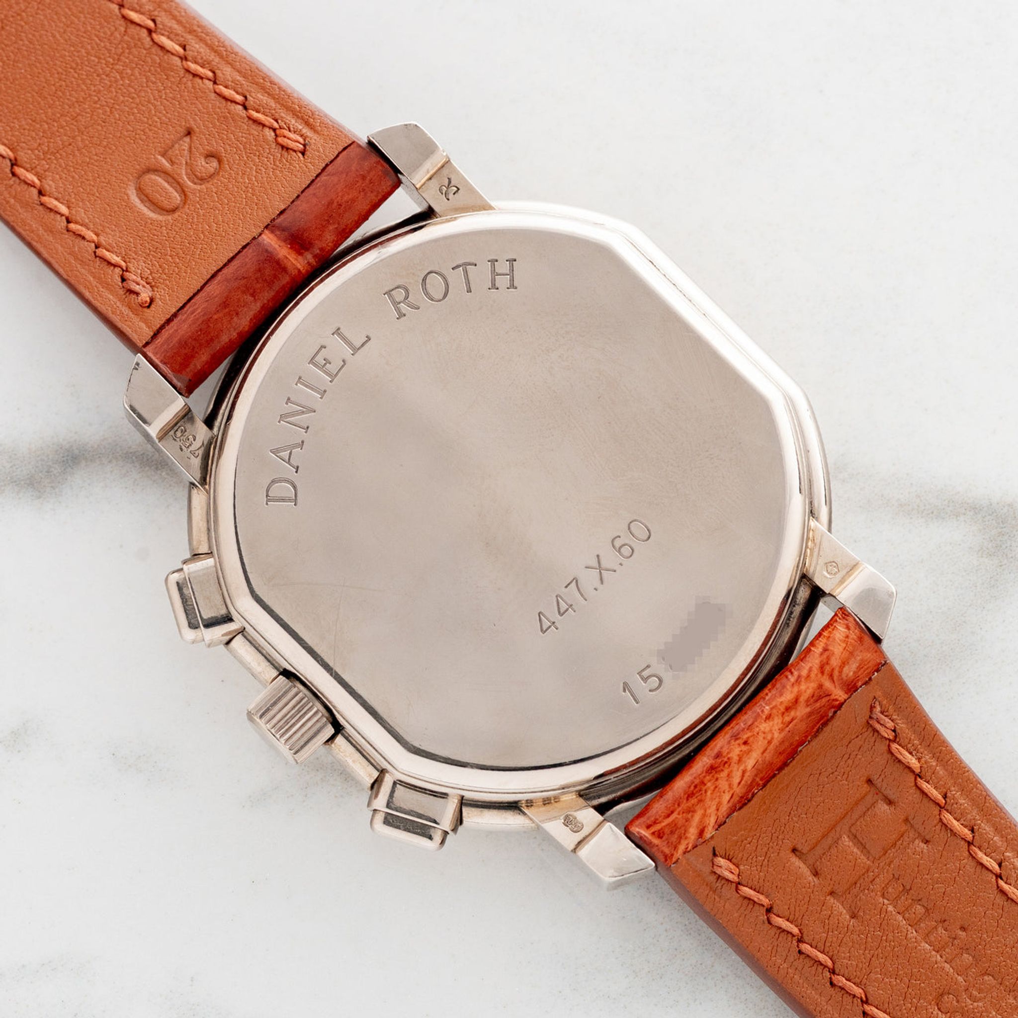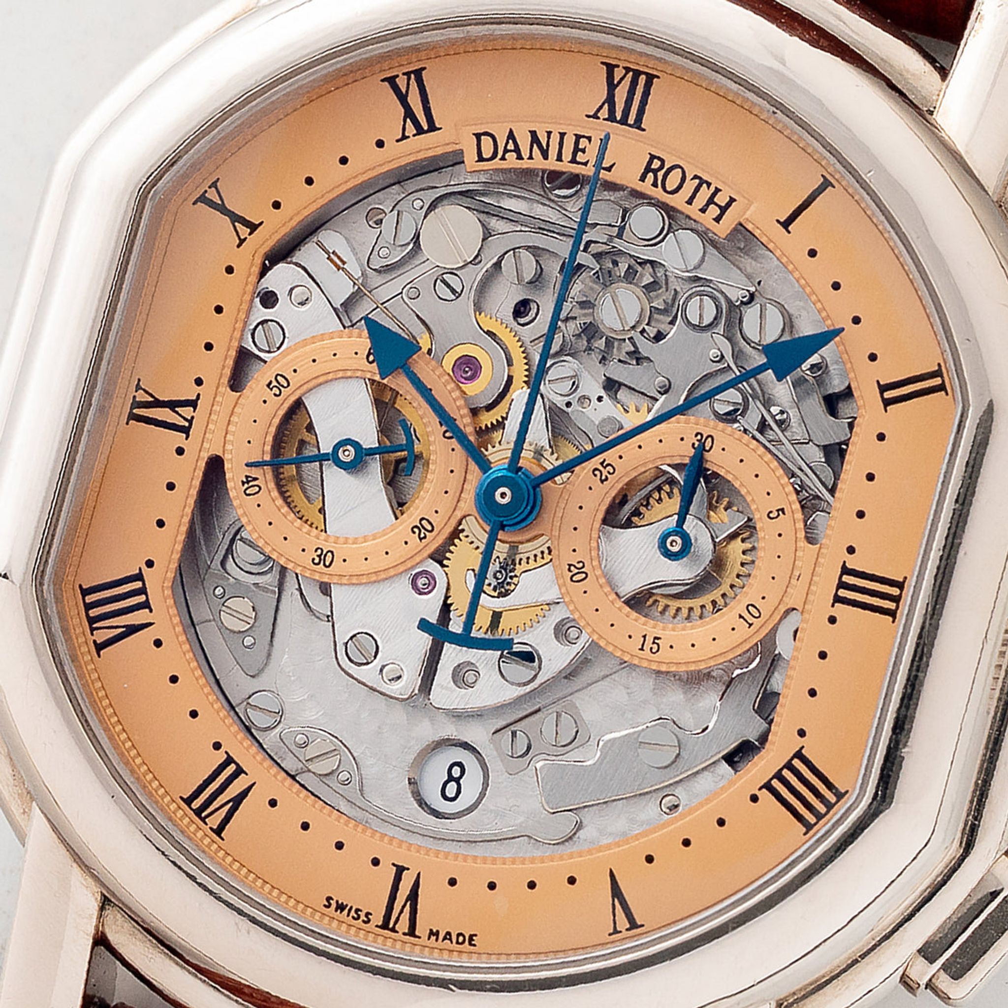 This particular Master chrono ref. 447.X.60 is a quintessential Roth design, featuring the unique Ellipsocurvex case which houses a desirable salmon/skeleton dial, making it a true work of art. This example has remained in fantastic neo-vintage condition displaying strong hallmarks on its 18k white gold case. It comes with its correct box, warranty papers and retains its correct 18k white gold DR signed pin buckle. If you've been looking for a unique independent neo-vintage timepiece this Roth is a fantastic conversation piece and fit collectors of any level.