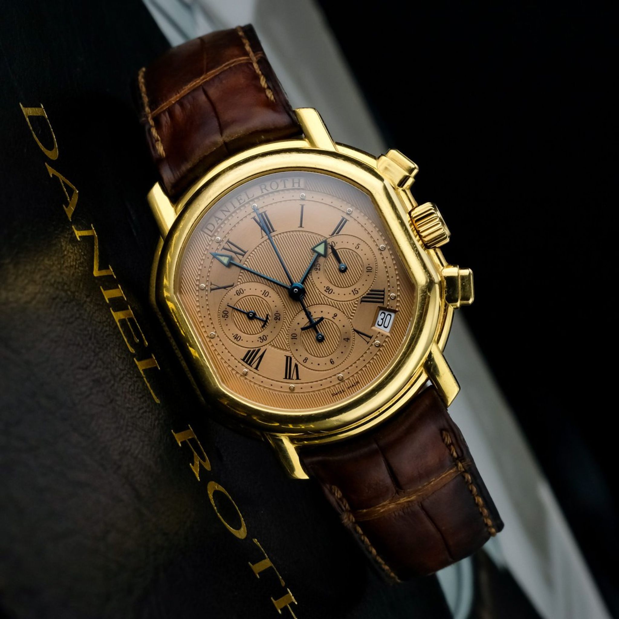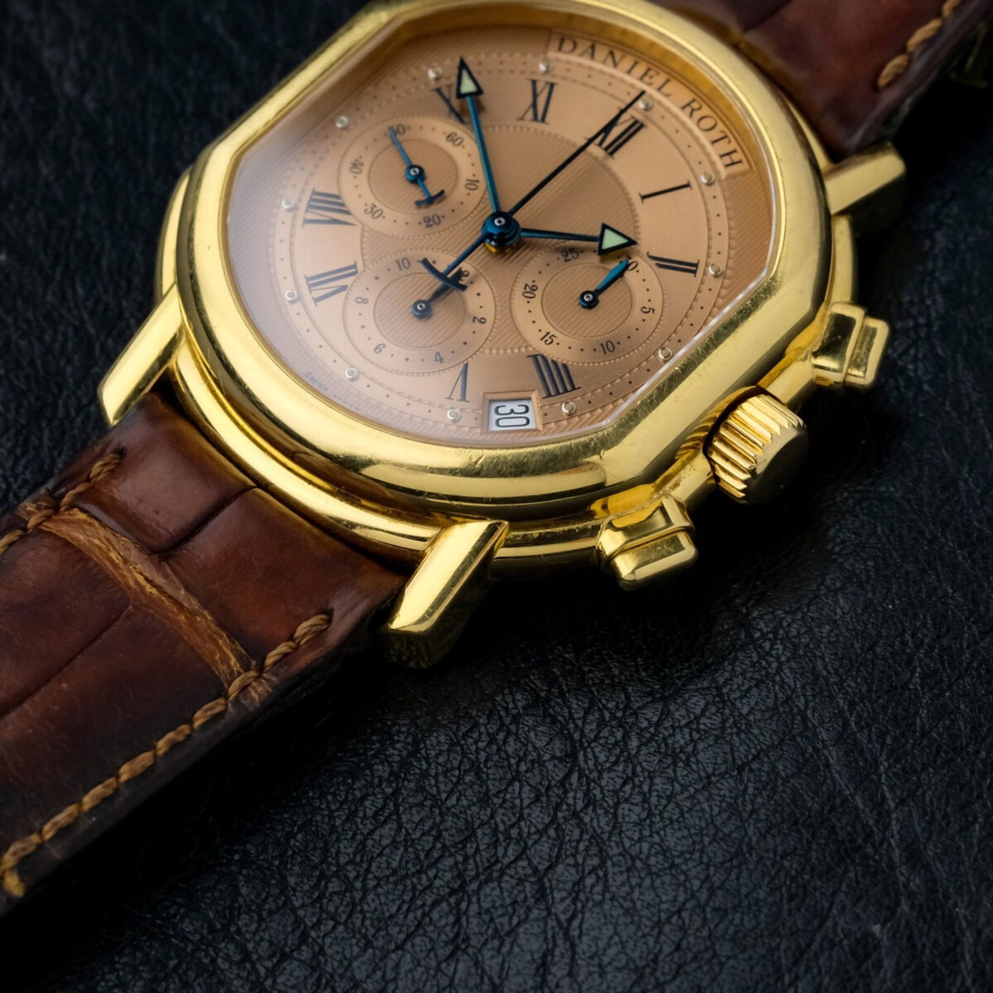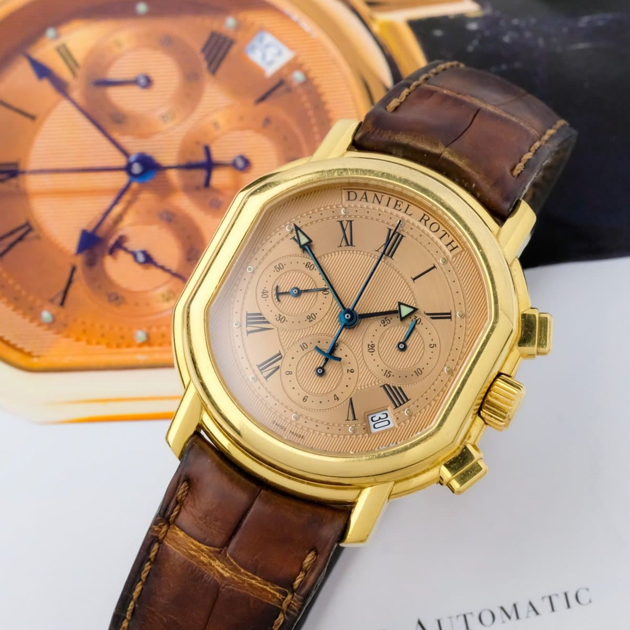 This Daniel Roth Chronograph reference S247 is a beautifully executed example of the independent watchmaker’s signature design language and craftsmanship. Housed in an 18k yellow gold double ellipse case measuring 38 by 41 millimeters, the watch combines classical proportions with the distinctive architectural form that defines Daniel Roth’s creations.