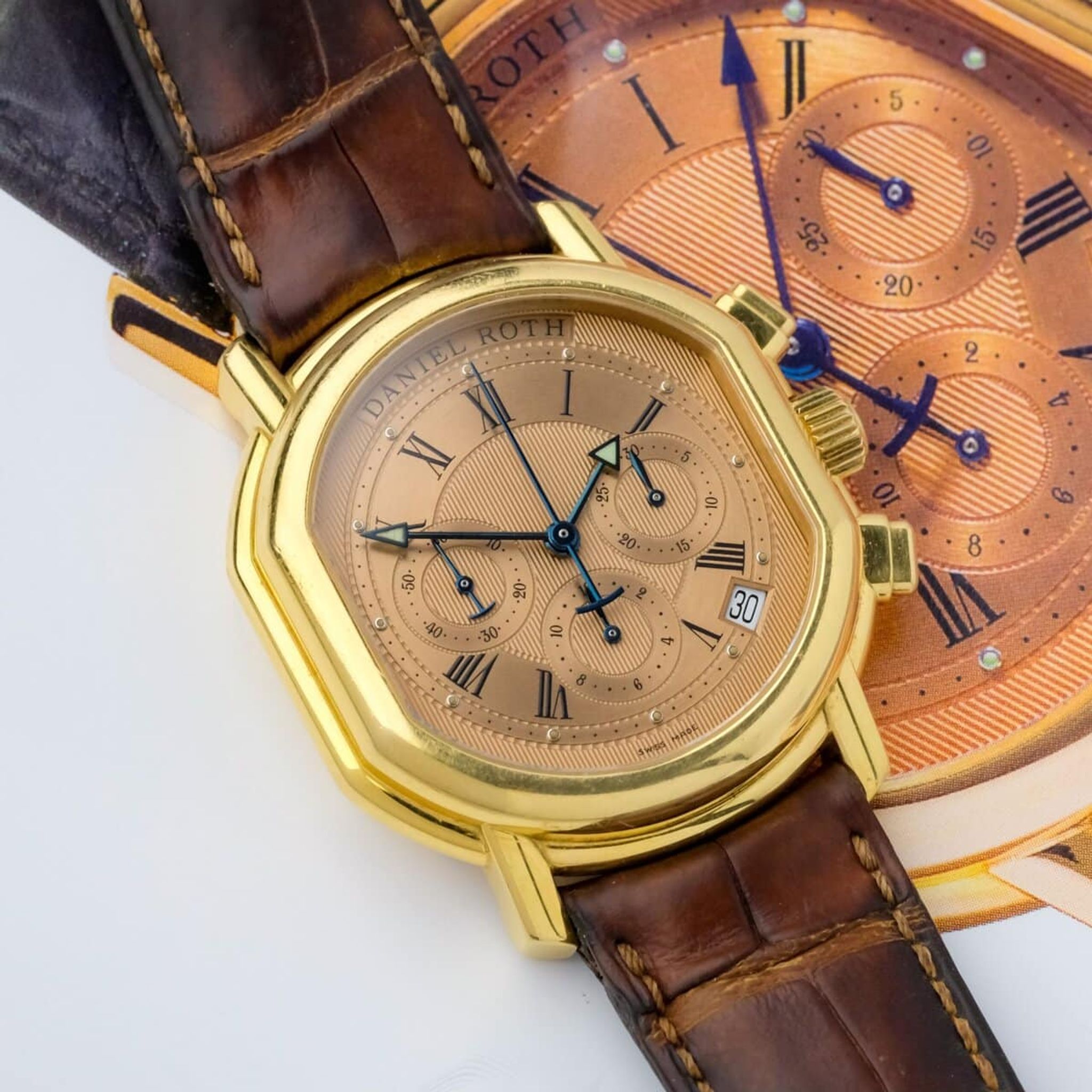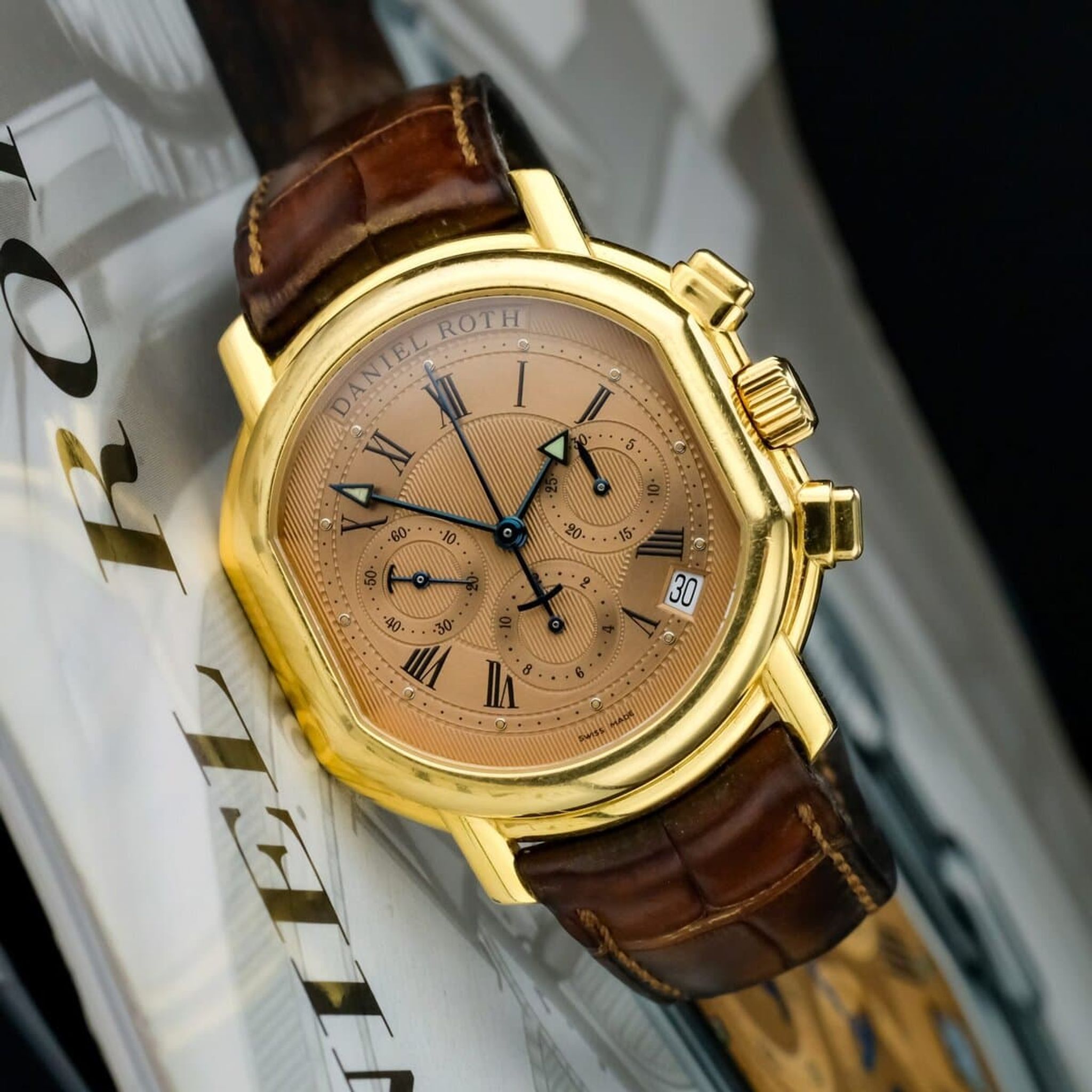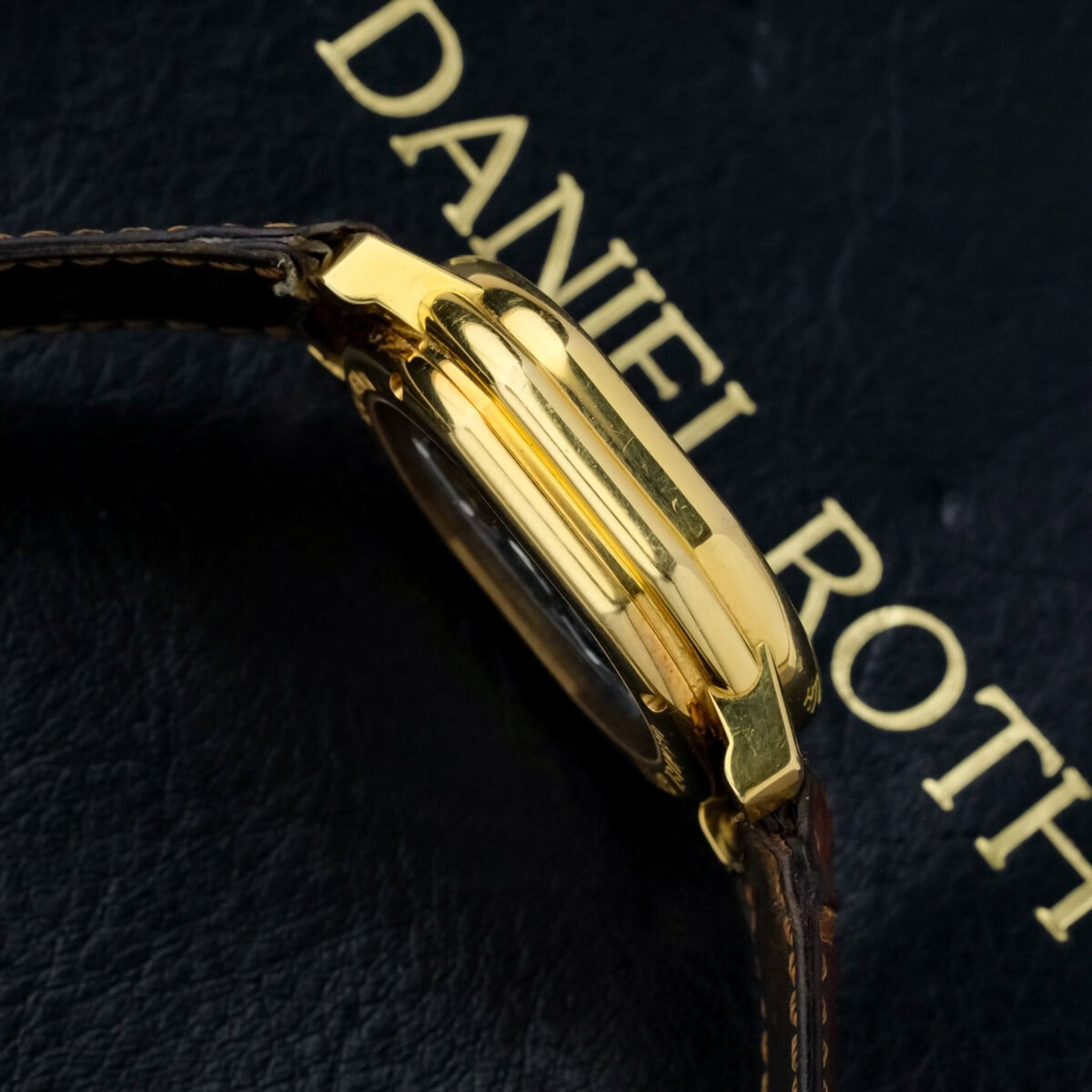 This Daniel Roth Chronograph reference S247 is a beautifully executed example of the independent watchmaker’s signature design language and craftsmanship. Housed in an 18k yellow gold double ellipse case measuring 38 by 41 millimeters, the watch combines classical proportions with the distinctive architectural form that defines Daniel Roth’s creations.