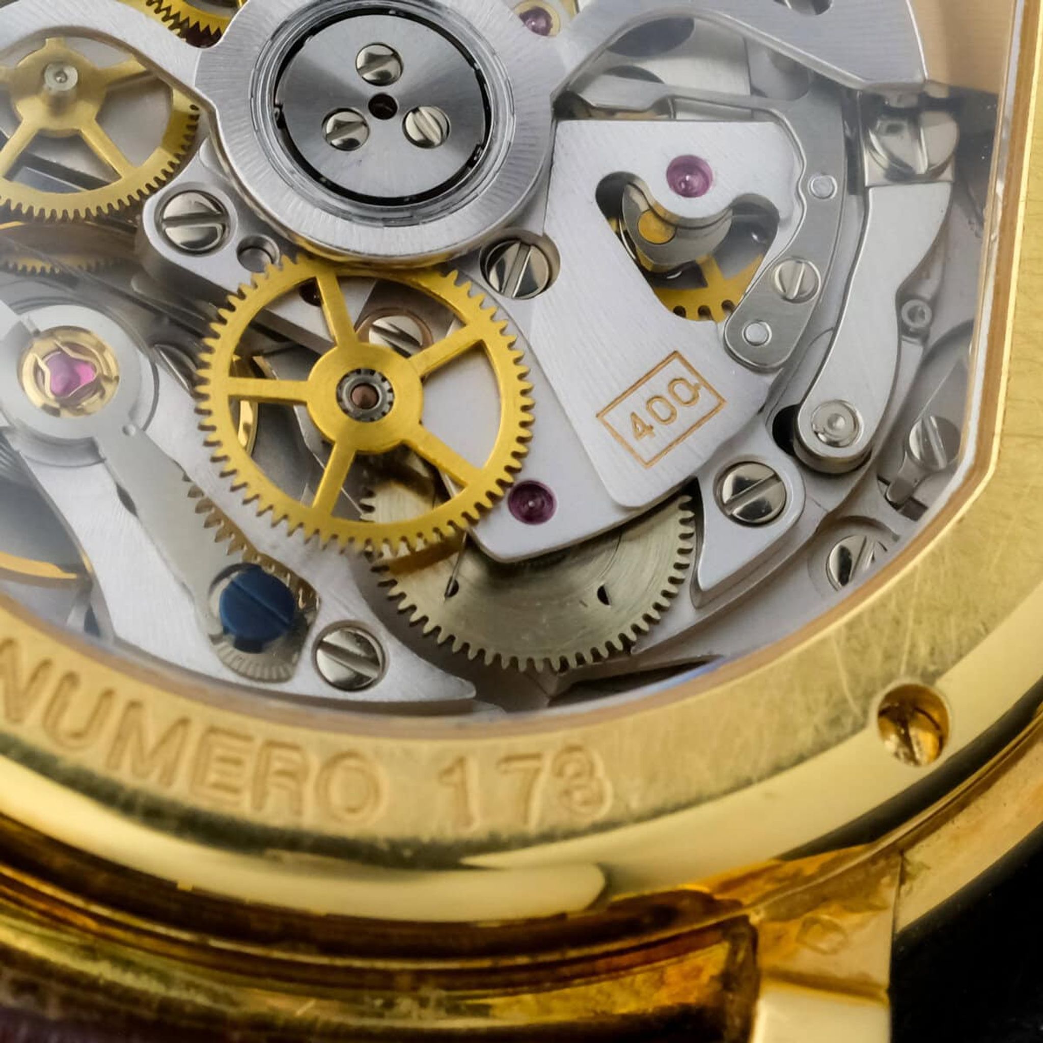 The salmon colored dial is elegantly detailed, featuring finely engraved guilloché, recessed subdials and blued steel hands that provide a perfect contrast against the warm tone of the gold case. The automatic chronograph movement is visible through the sapphire caseback, showcasing exceptional finishing and mechanical sophistication.