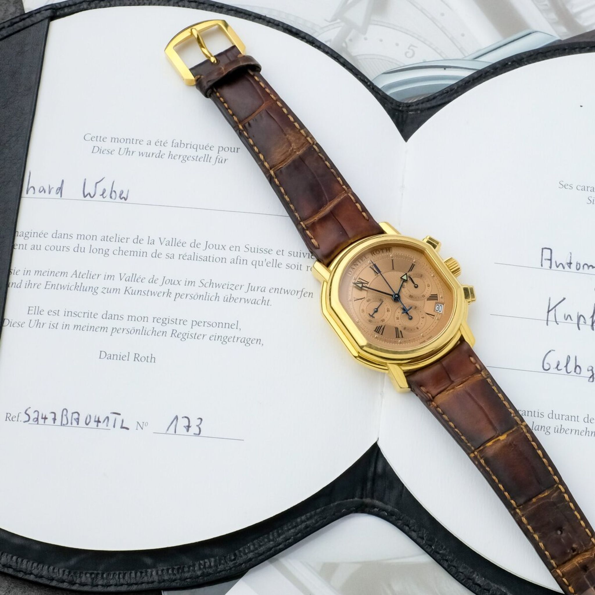 Fitted with its original 18k yellow gold Daniel Roth pin buckle and accompanied by its original papers, this example is preserved in very good overall condition with only light signs of wear. The S247 stands as a refined and collectible chronograph that captures the spirit of independent haute horlogerie from one of the most respected watchmakers of his generation.