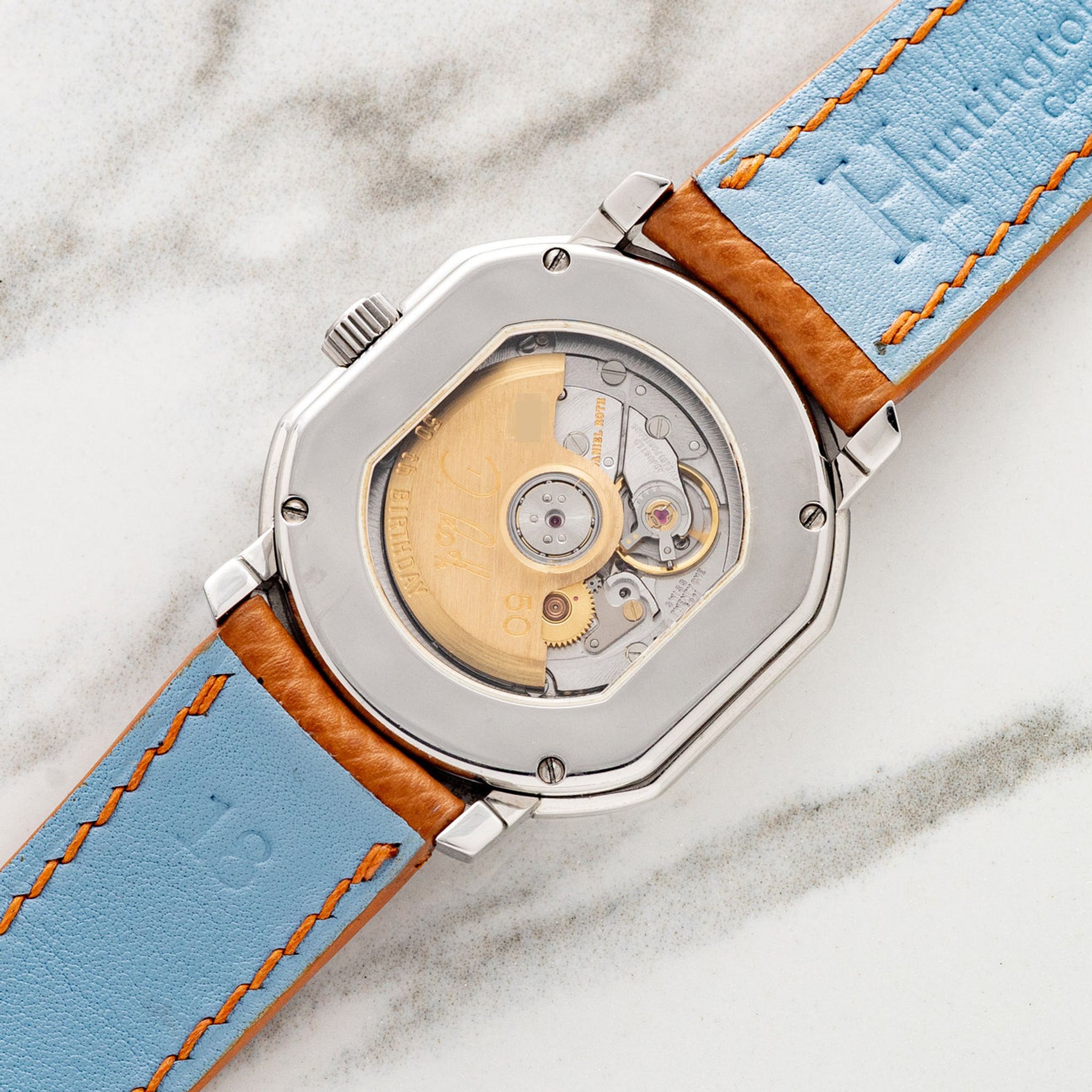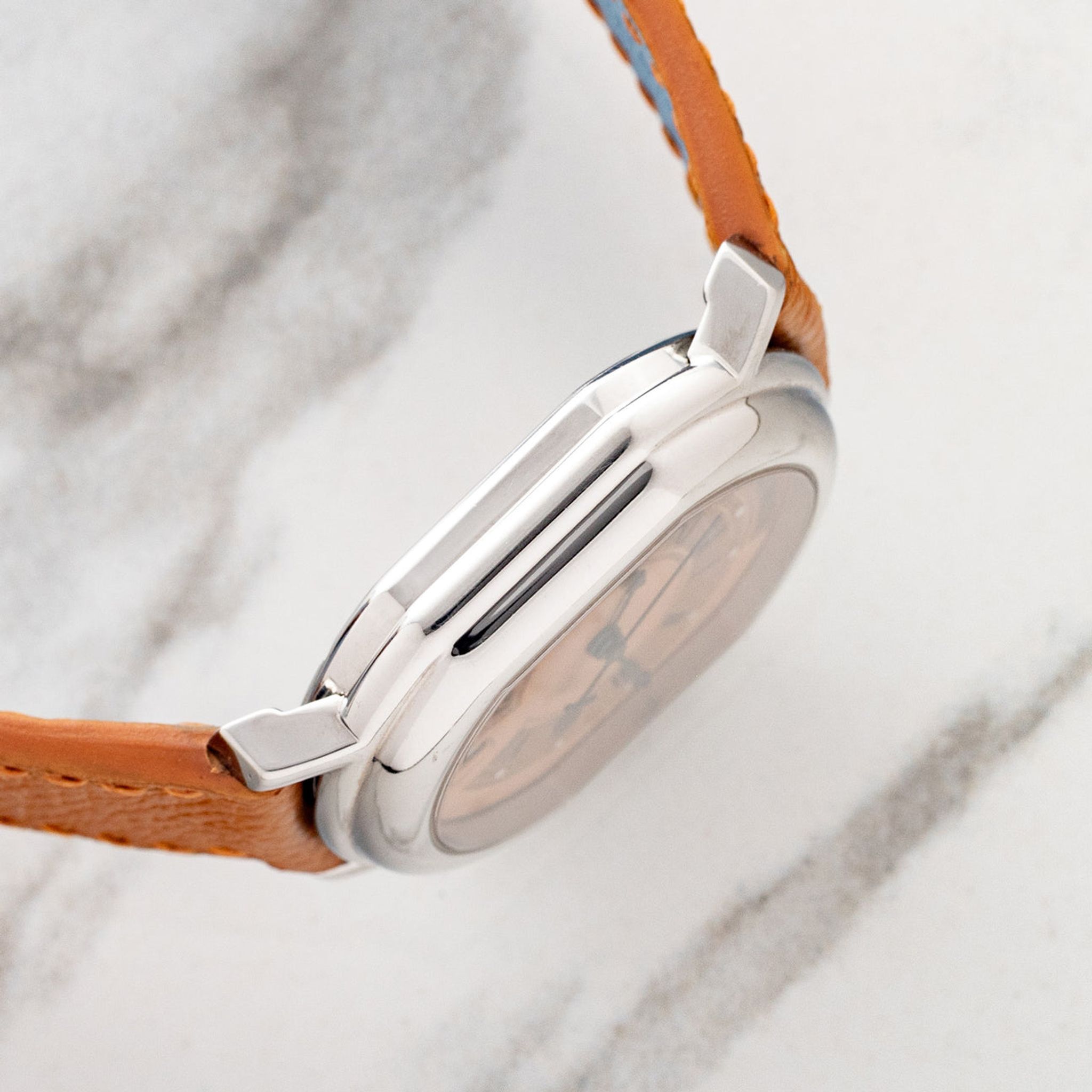 Daniel Roth released this timepiece to mark the occasion of his 50th birthday, limited to just 50 pieces. This watch perhaps represents the “platonic ideal” of what has made the watchmaker’s eponymous brand desirable today. His signature elliptical case harmonizes with the hand-done guilloché dial, blued hands and numerals in a semi-circular chapter ring with a stunningly beautiful salmon dial. The limited run by Roth can be interpreted only with intentionality as the “50 for 50 edition” is apropos of the horological history for such an important watchmaker. We would also note that the 31 x 36mm dimensions of this example are easily our favorite DR example adding to its elegance on wrist. This piece has just come back from a complete overhaul from the high-grade service center WatchCheck. It is in impeccable condition and will surely make a fitting home in the collection of any discerning eye.