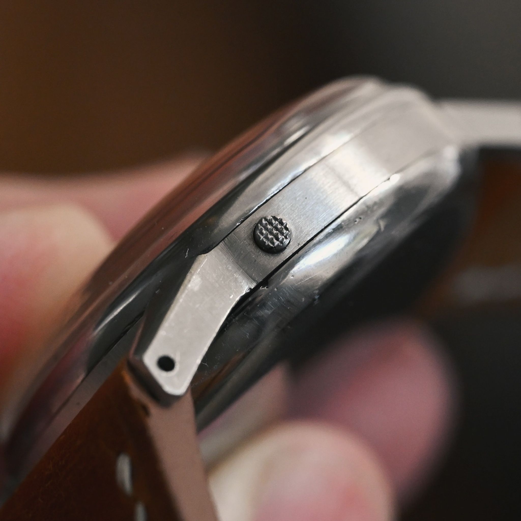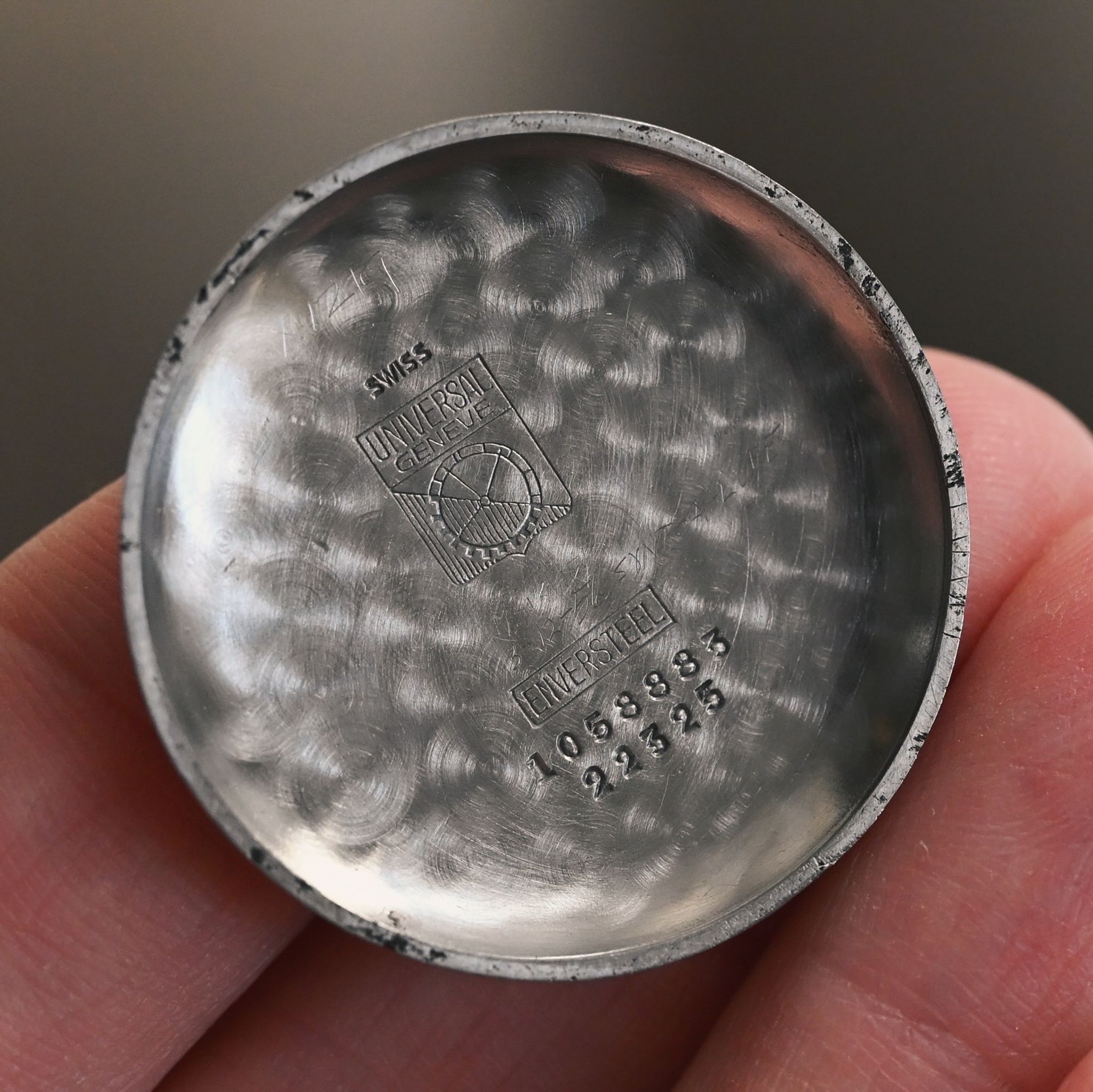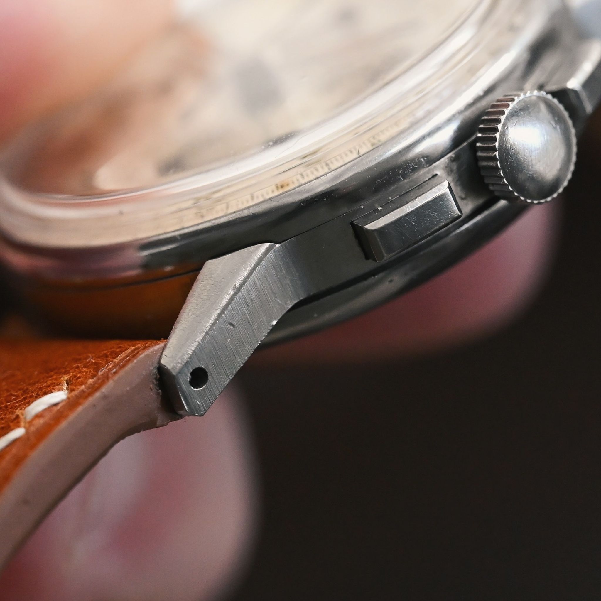A charming & rare Universal Geneve Dato-Compax ref. 22325 dating to 1944. This watch is all original and features a 34mm stainless steel case, luminous Arabic dial and in-house caliber 283 manually wound column wheel chronograph movement. What makes this model special is its date indicator at 12 o’clock with a subtle quick set push button located on the top left side of the case. This function was not commonly found on chronographs in this period and is a testament to Universal’s standing as serious watch manufacturer. This watch appears to have never been polished, the original dial shows warm patina and light spotting, the movement is extremely clean especially for an 80 year old watch.