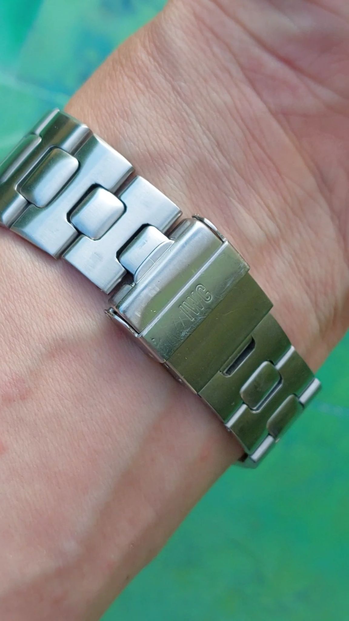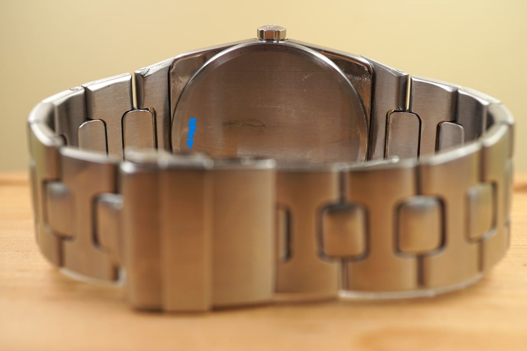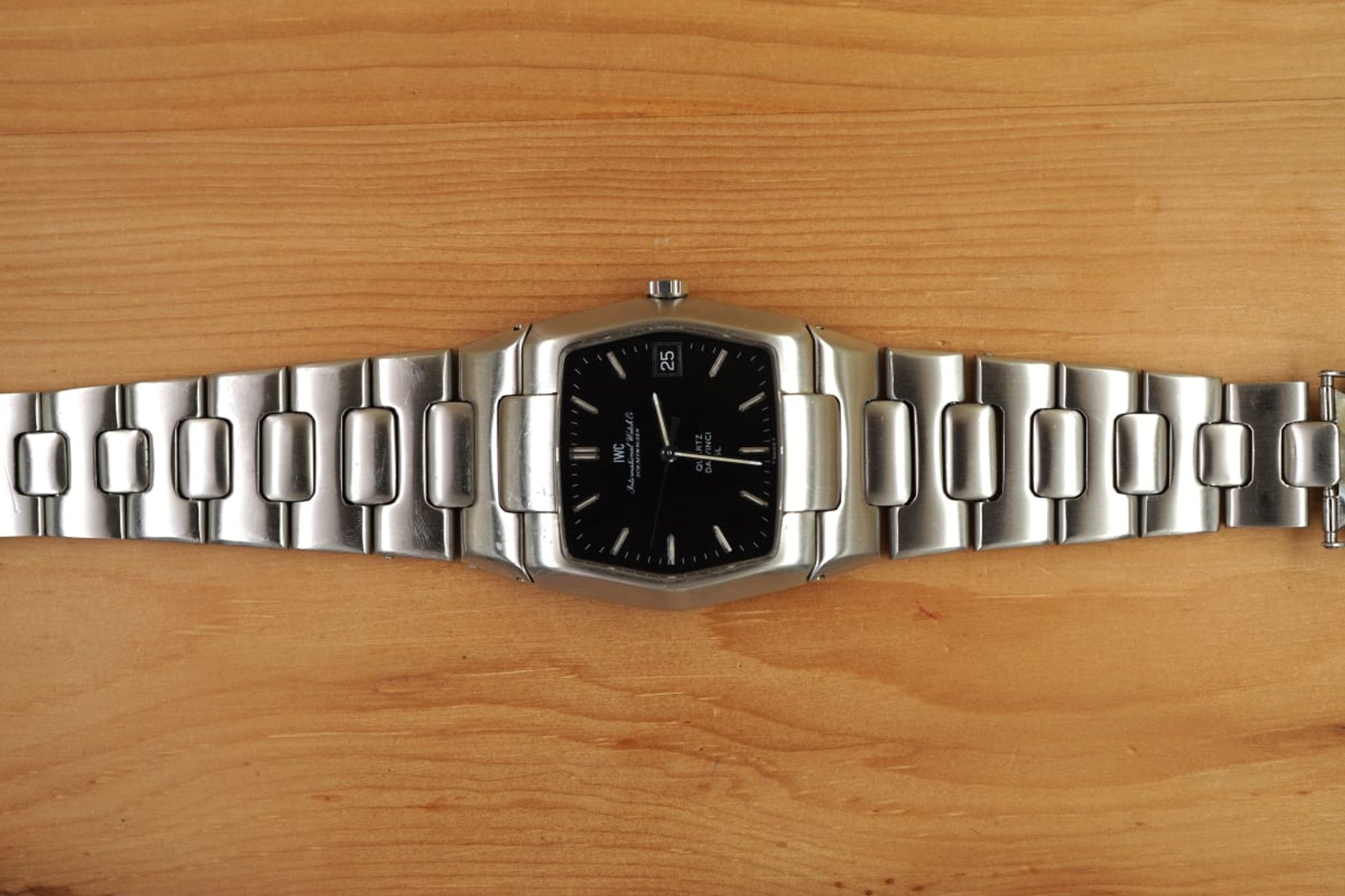 The condition of the watch case is good although it was pretty sure polished and the bracelet -- next to the inaccuracies from early CNC products -- has some stretch. The glass and dial are in well preserved condition, as is the precise and reliable working cal2405 movement -- by the way the same IWC quartz-movement that was used in the Jumbo Ingenieur designed by Genta as well.