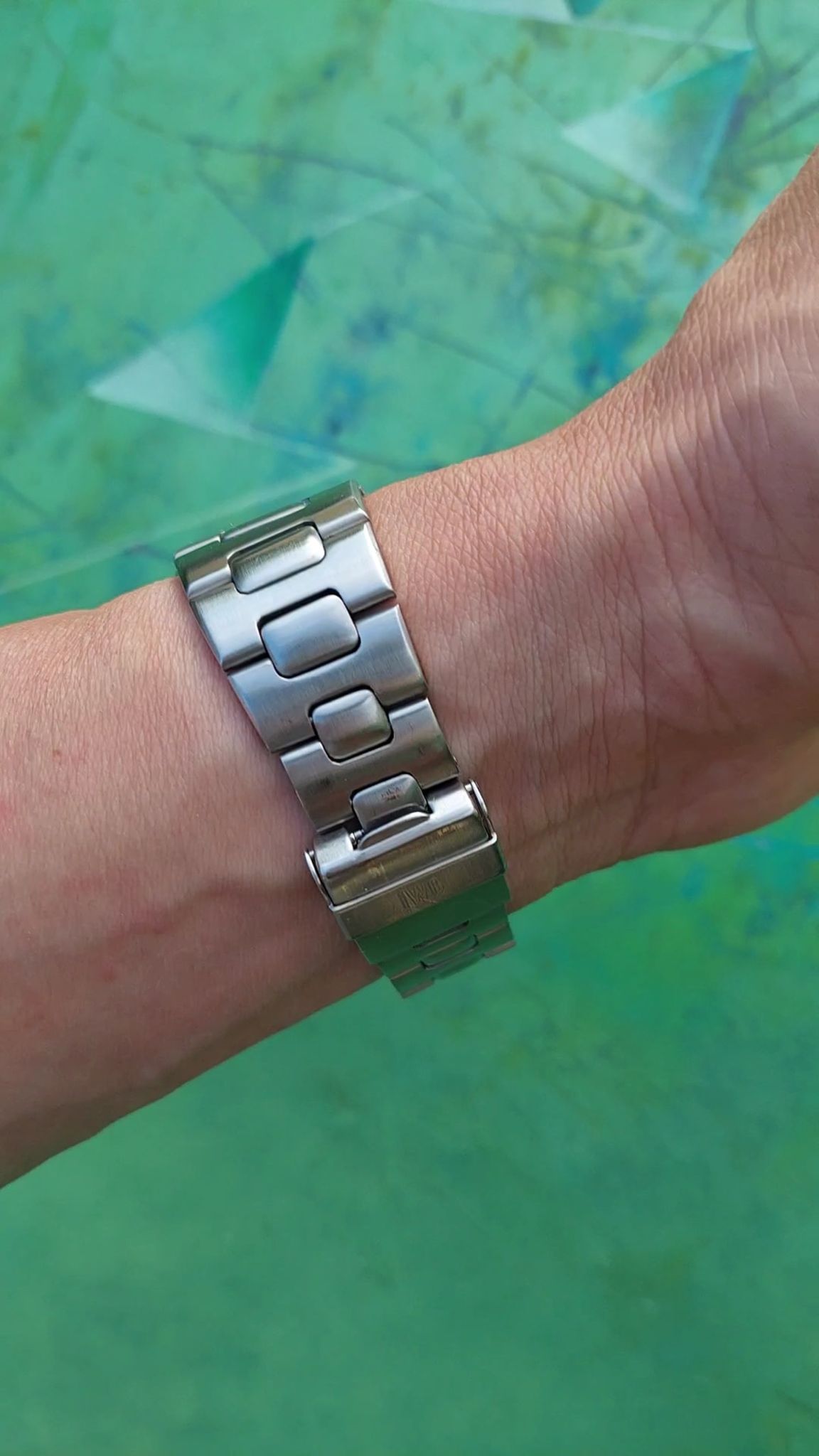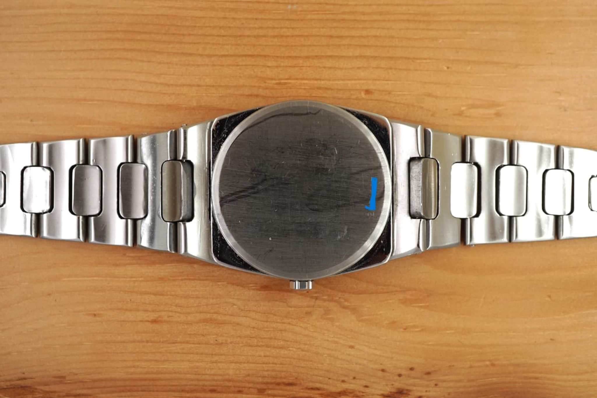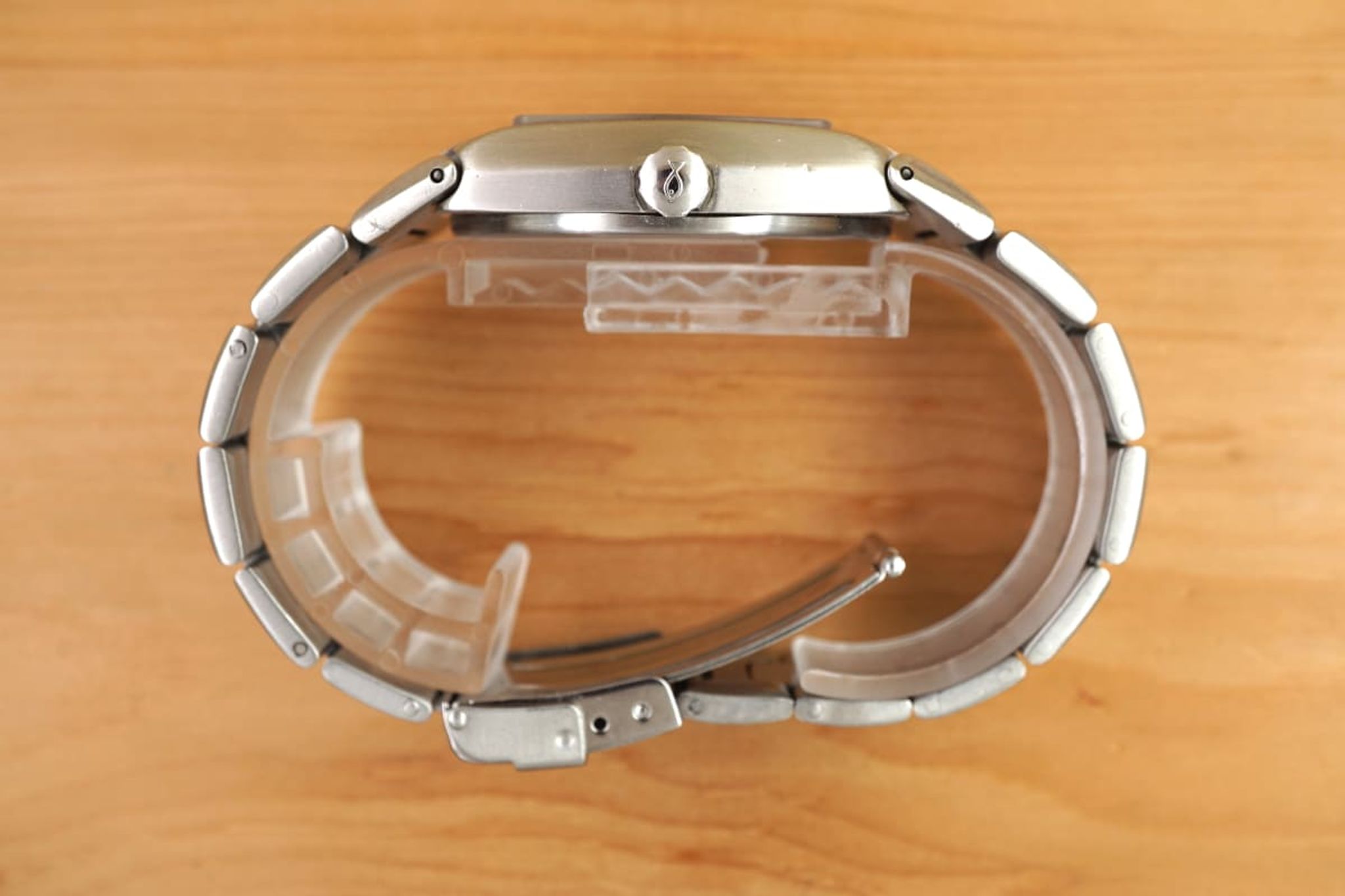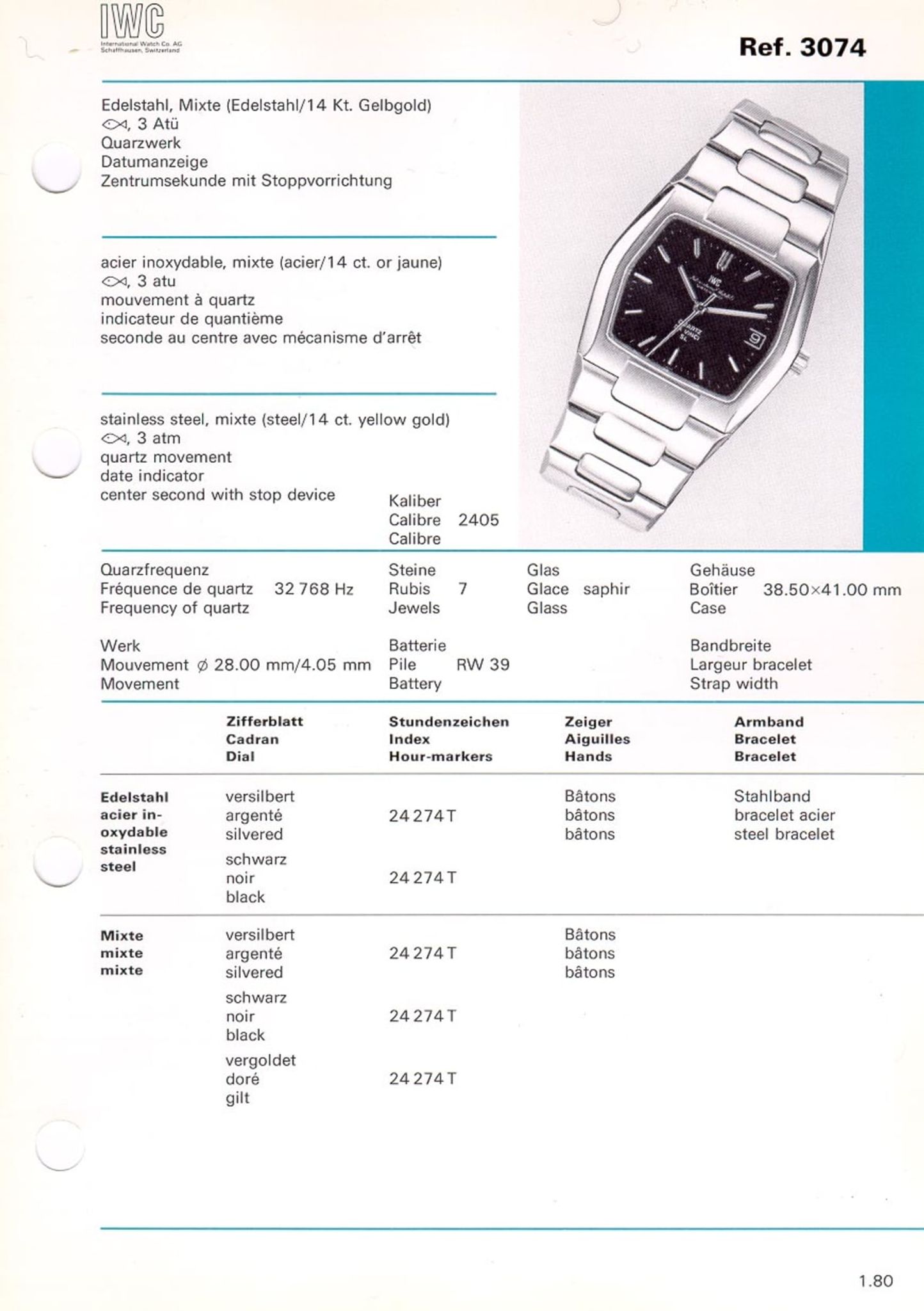 The condition of the watch case is good although it was pretty sure polished and the bracelet -- next to the inaccuracies from early CNC products -- has some stretch. The glass and dial are in well preserved condition, as is the precise and reliable working cal2405 movement -- by the way the same IWC quartz-movement that was used in the Jumbo Ingenieur designed by Genta as well.