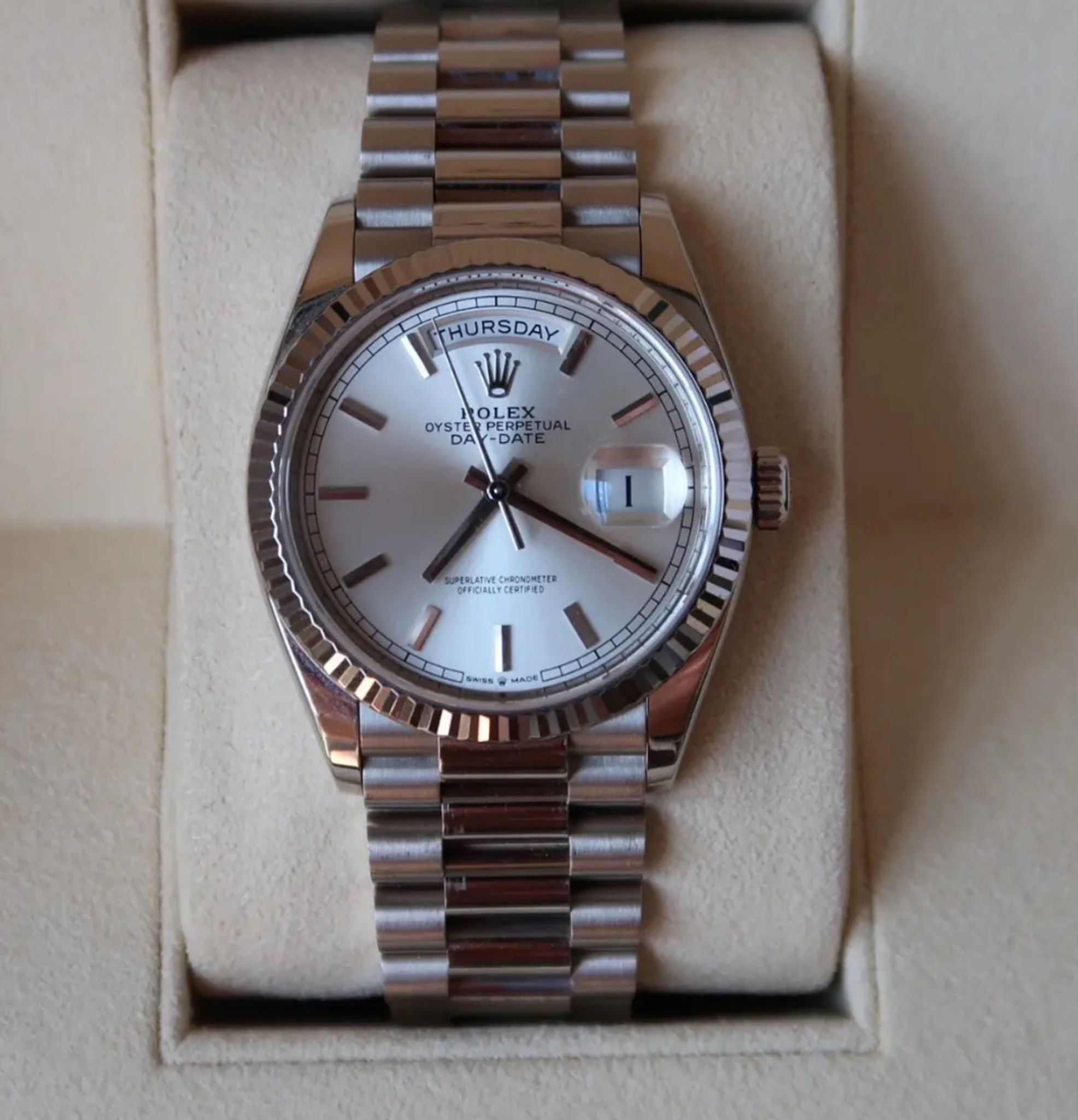 Beautiful white gold Day-Date 36, complete set 2021. Light hairlines on case and bracelet.