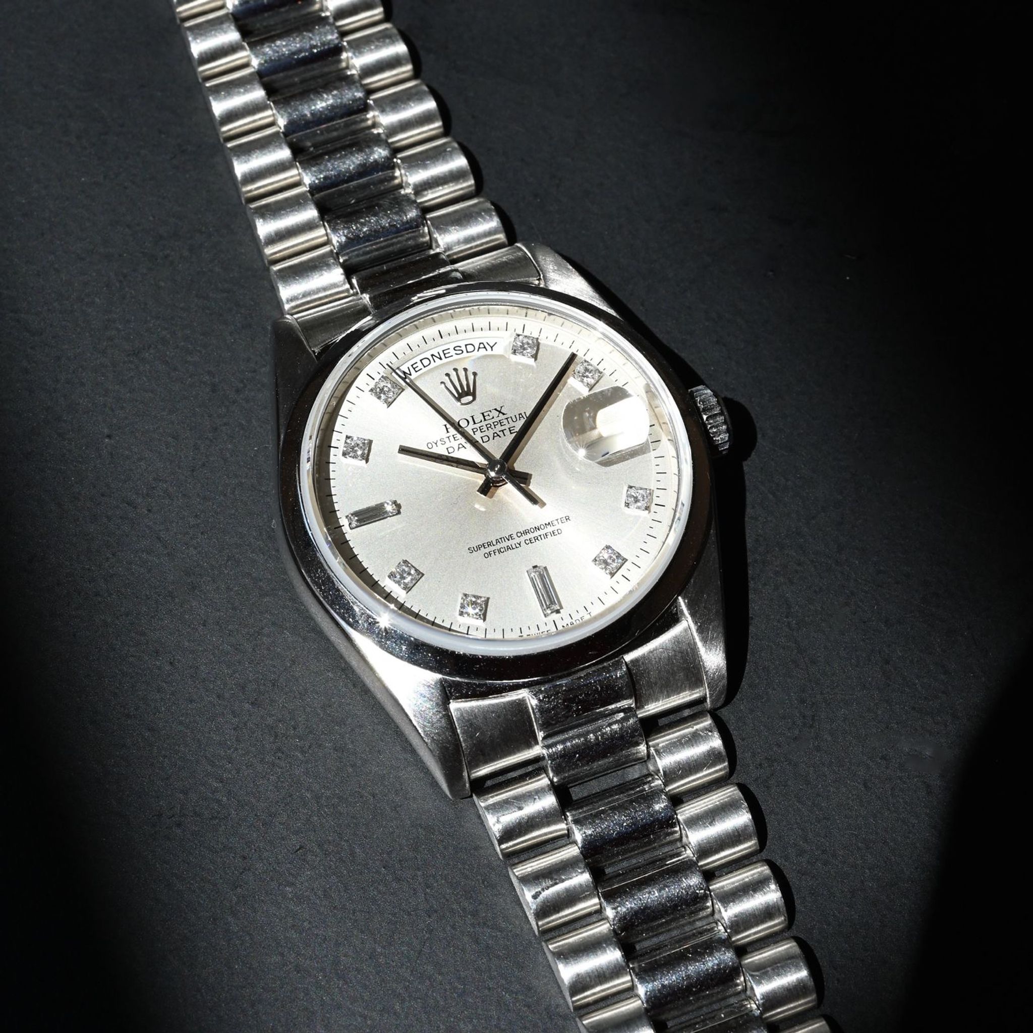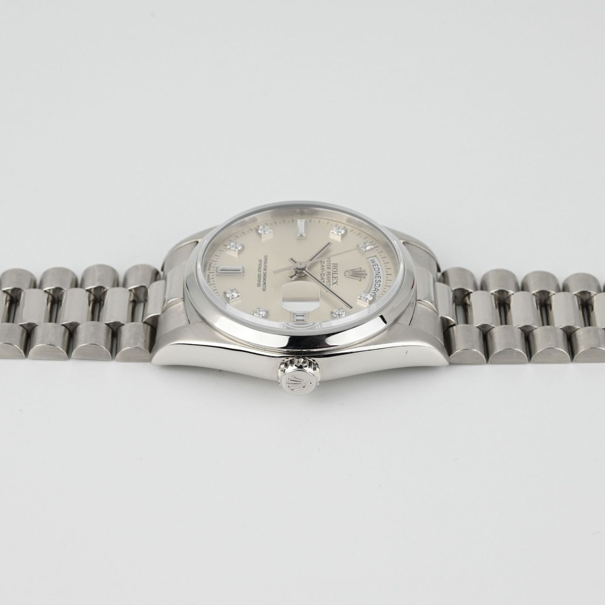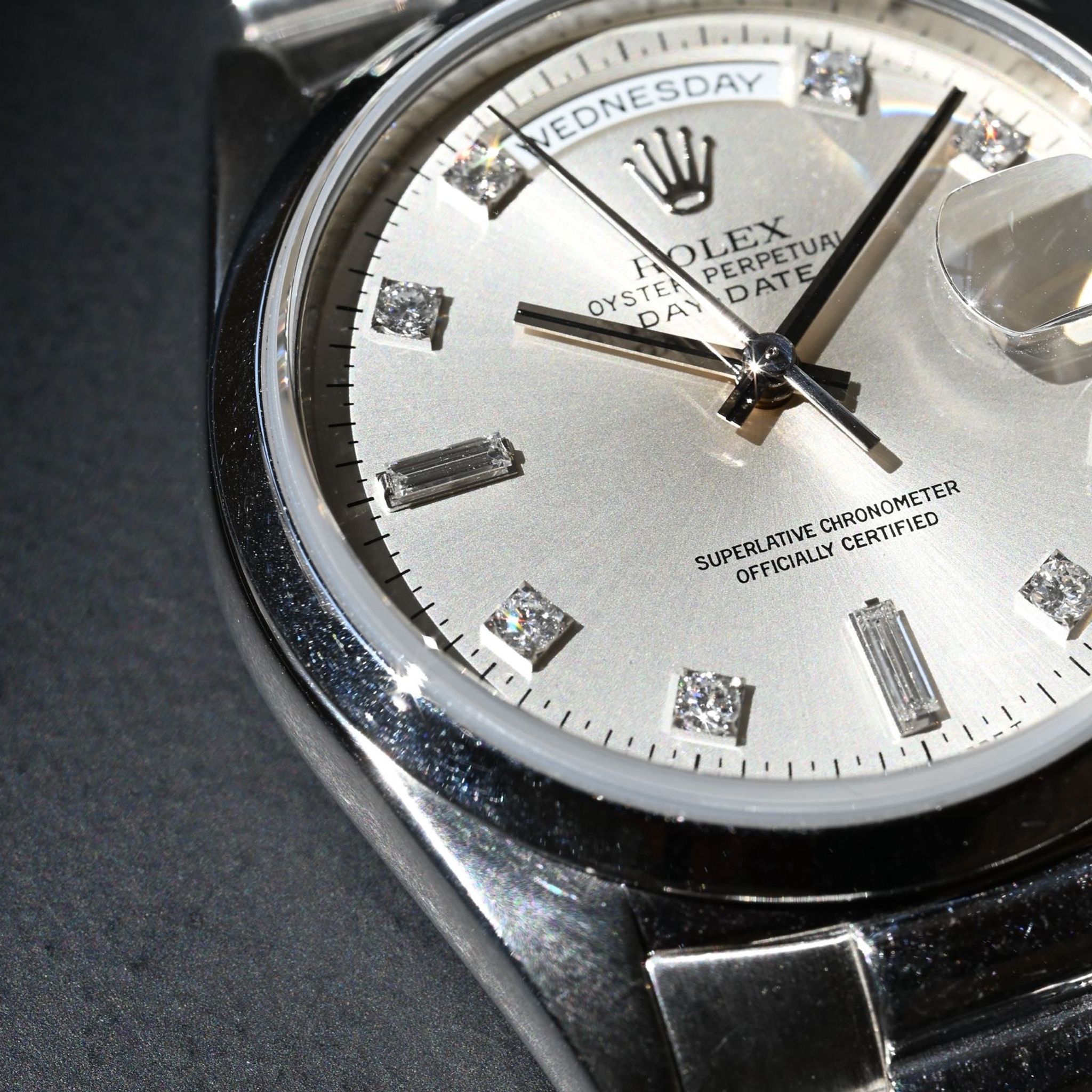 The dial of this model may vary from version to version, but it is often offered with precious finishes: diamond hour markers, mother-of-pearl or fine stone dials, and day displays available in several languages, in keeping with Day-Date tradition. This particular model features a dial with diamond hour-markers. Note that dials for platinum models feature larger diamonds than those for gold models. The day display is in English, the most commonly chosen language worldwide.