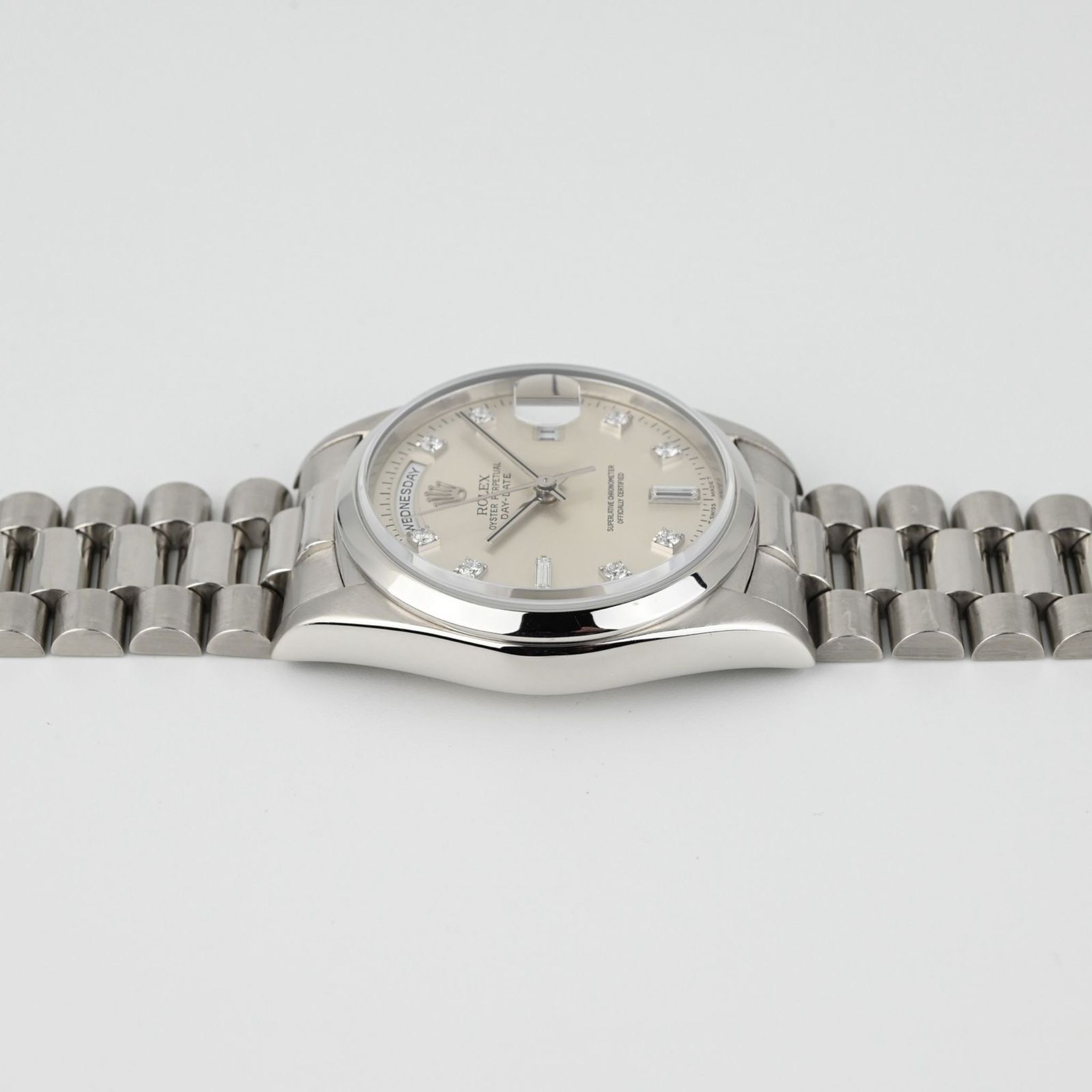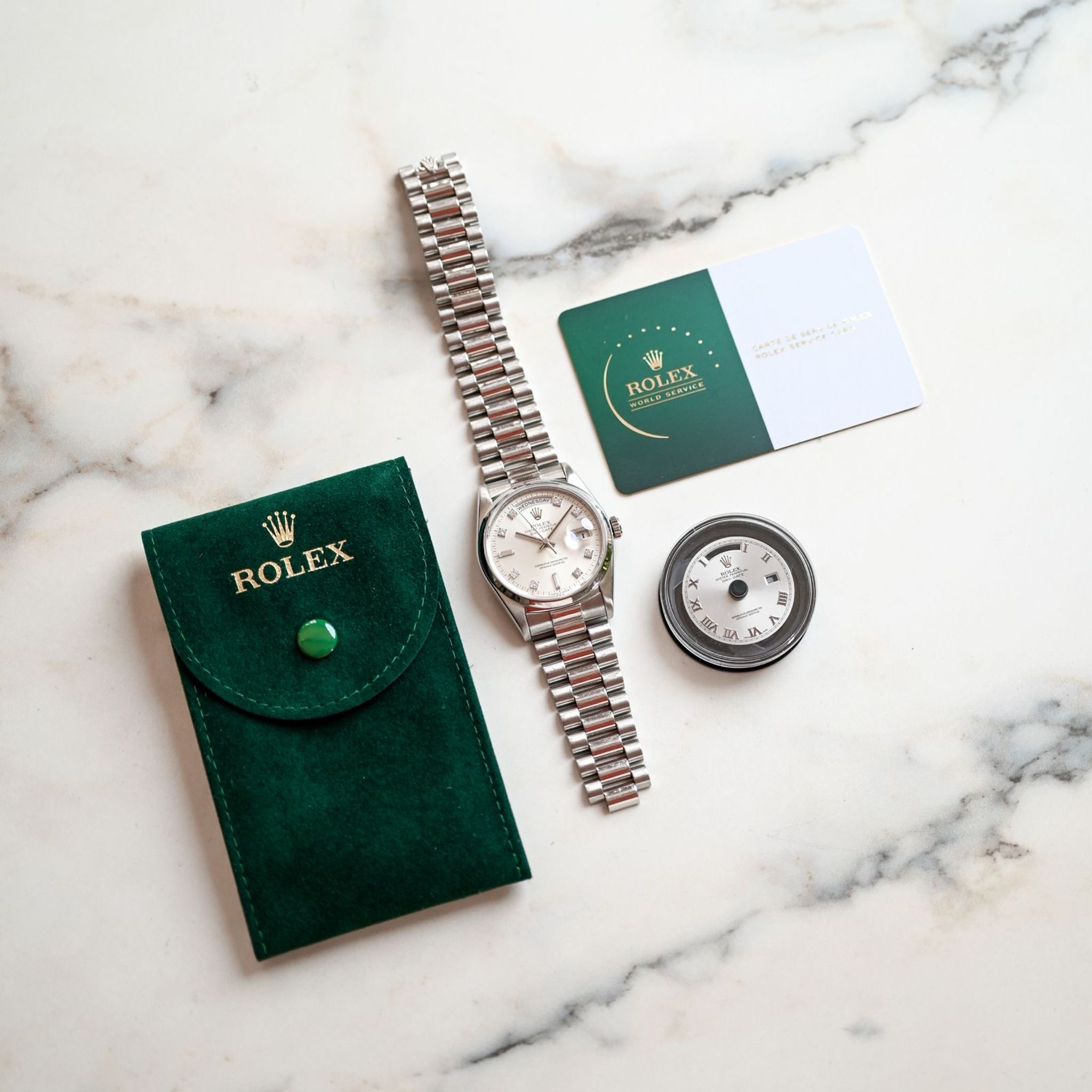 Reference 18206, produced from 1989 onwards, represents one of the most prestigious variations of the Day-Date, made exclusively in platinum. With a diameter of 36 mm, it features a smooth bezel - a discreet element that contrasts with the luxurious, exclusive character of platinum.