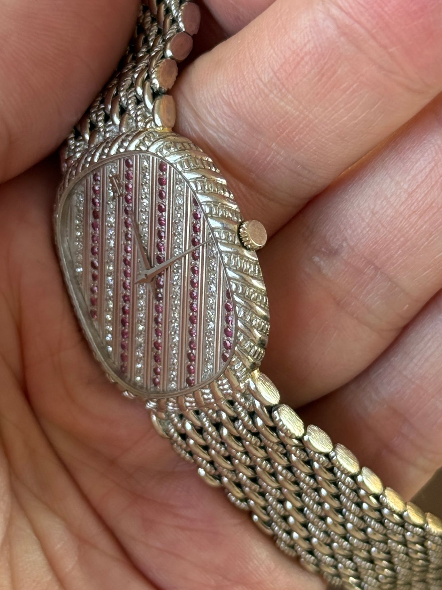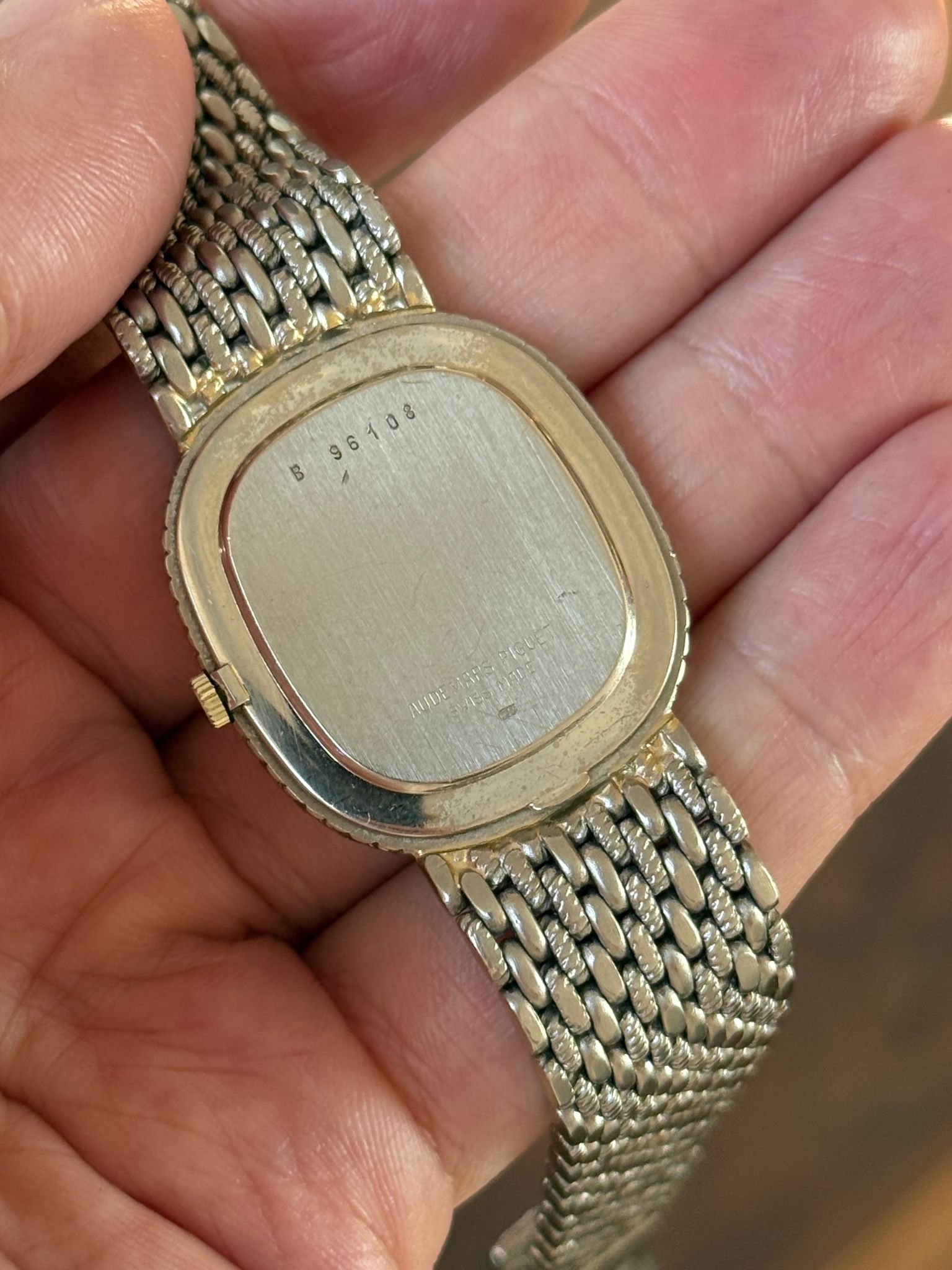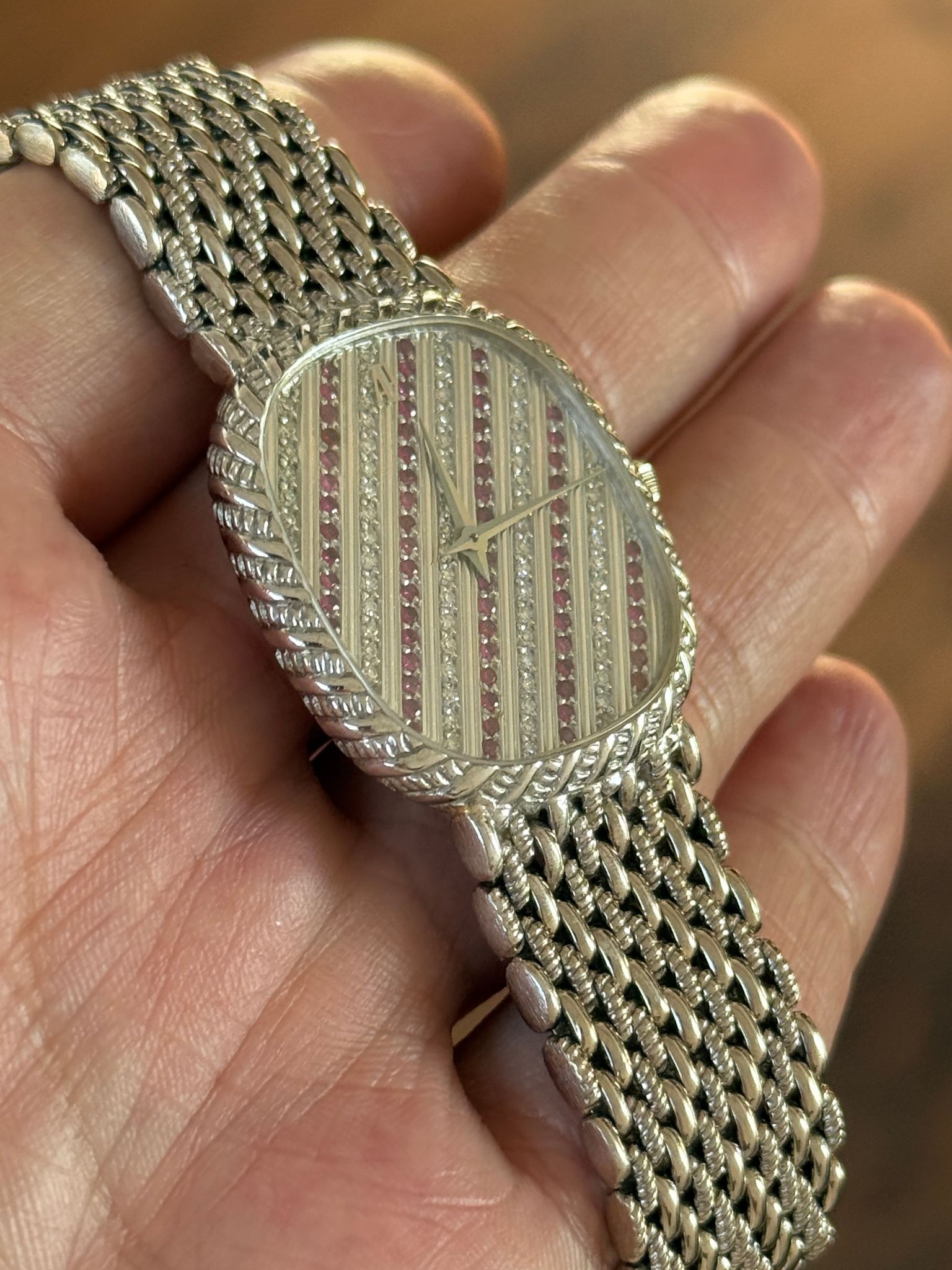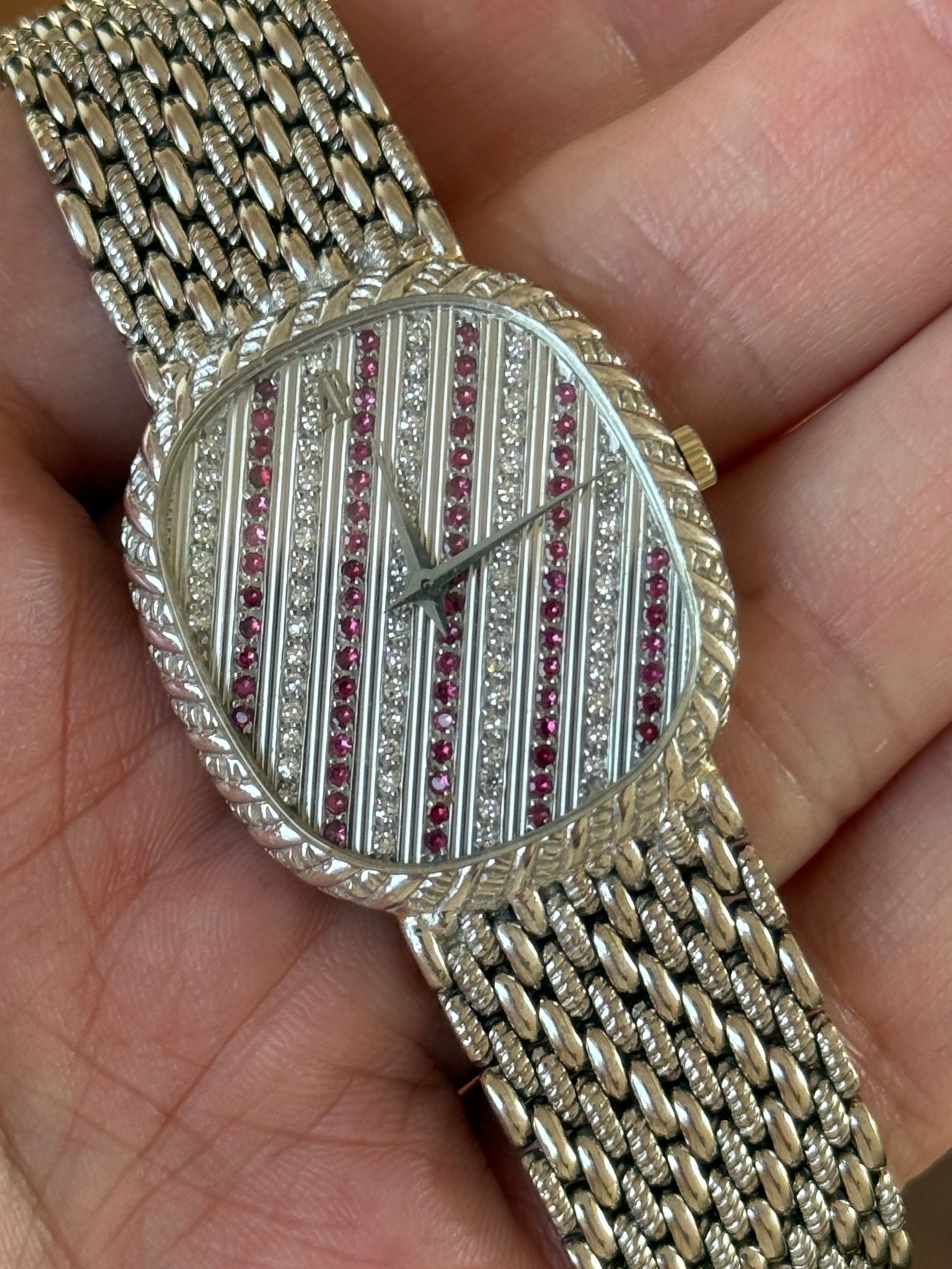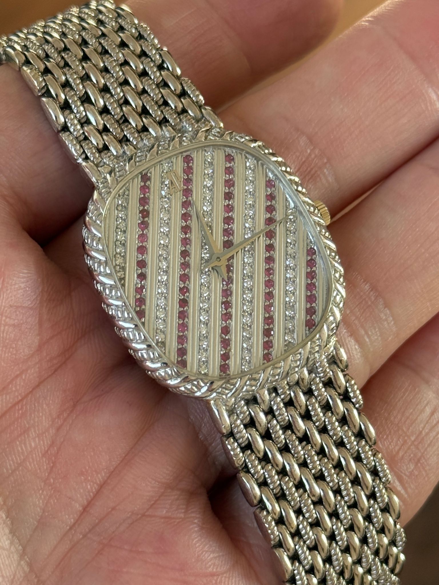 Stunningly beautiful 1970s white gold AP “Ellipse”, very similar look to the “Mini Cobra”. It measures roughly 30x33mm and has an extremely long bracelet which should at least an 8” wrist. Dial consists of a pattern of diamonds and rubies. Lovingly worn and well kept, it remains in likely unpolished condition.