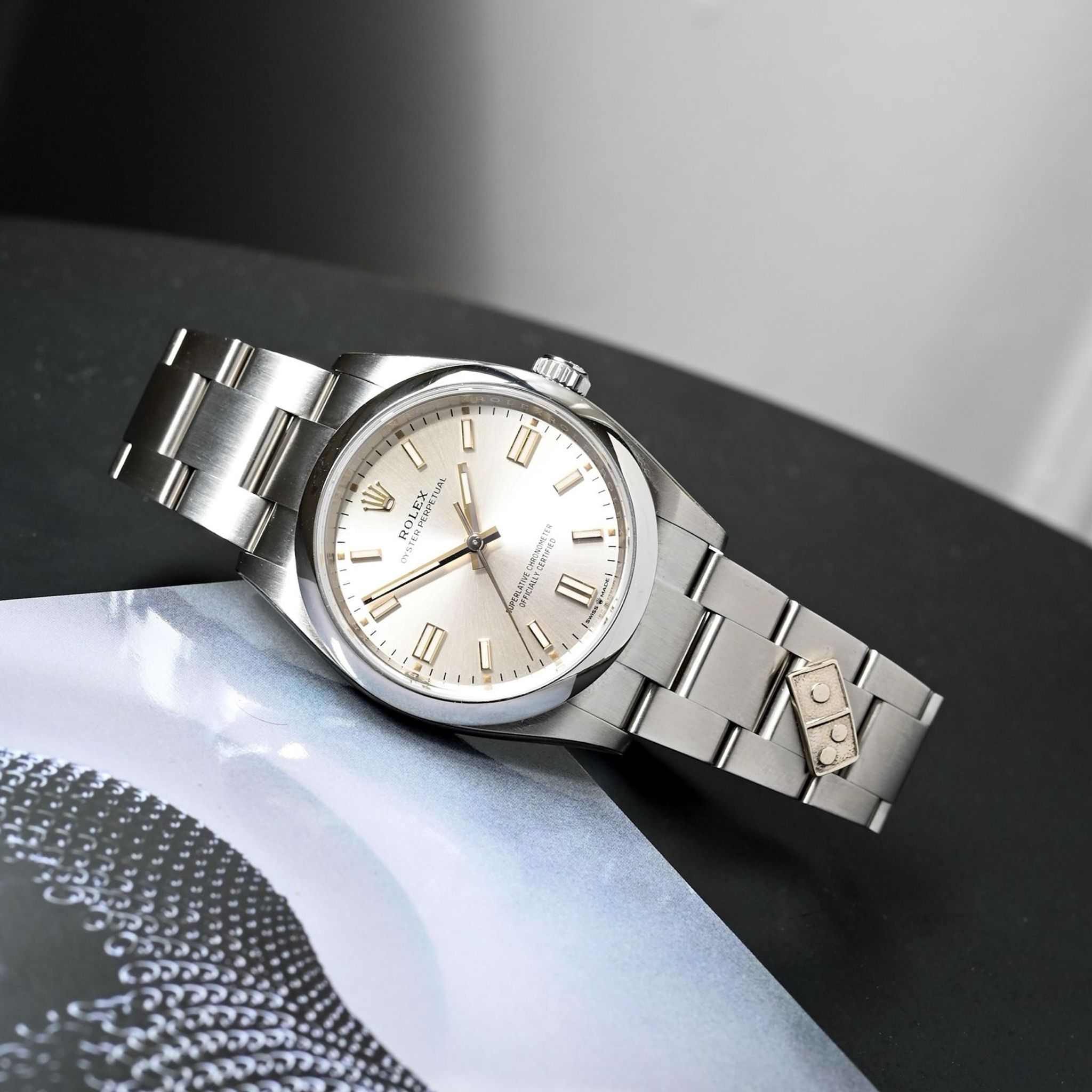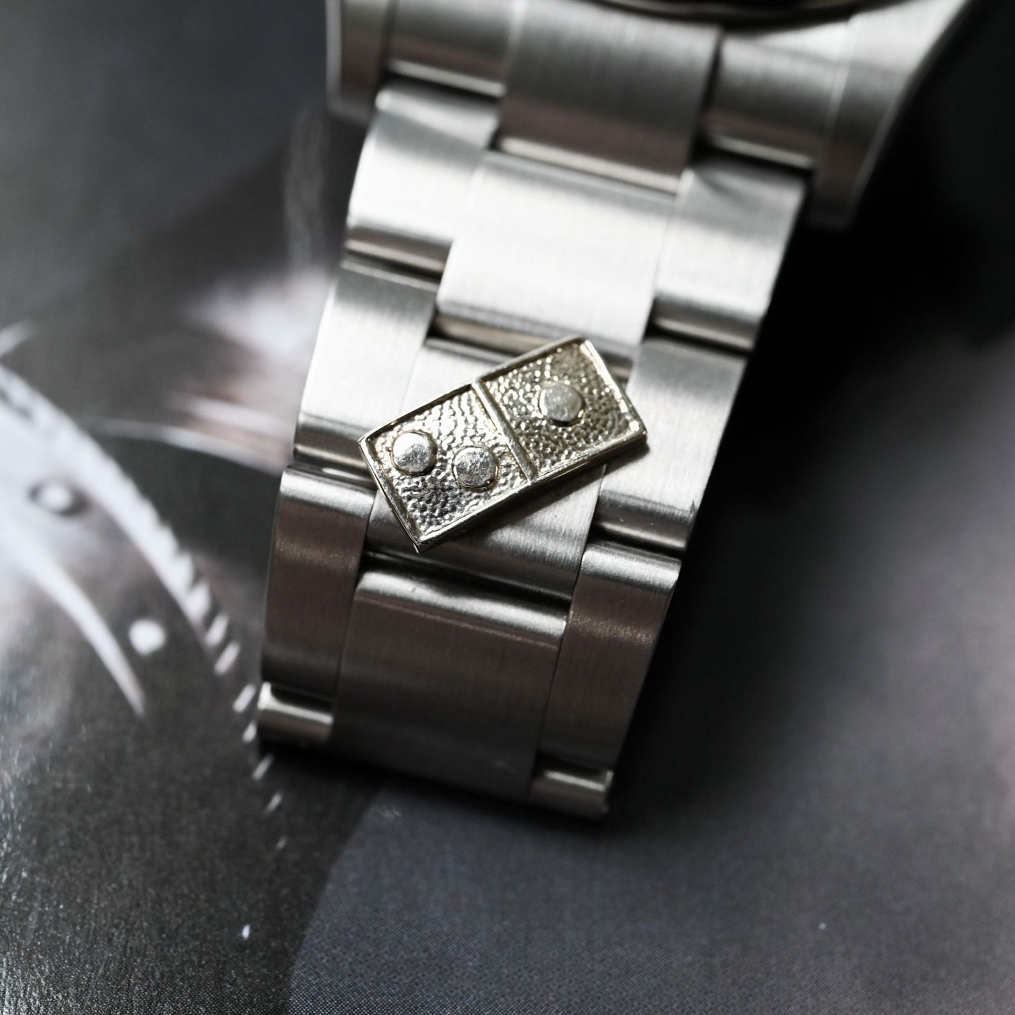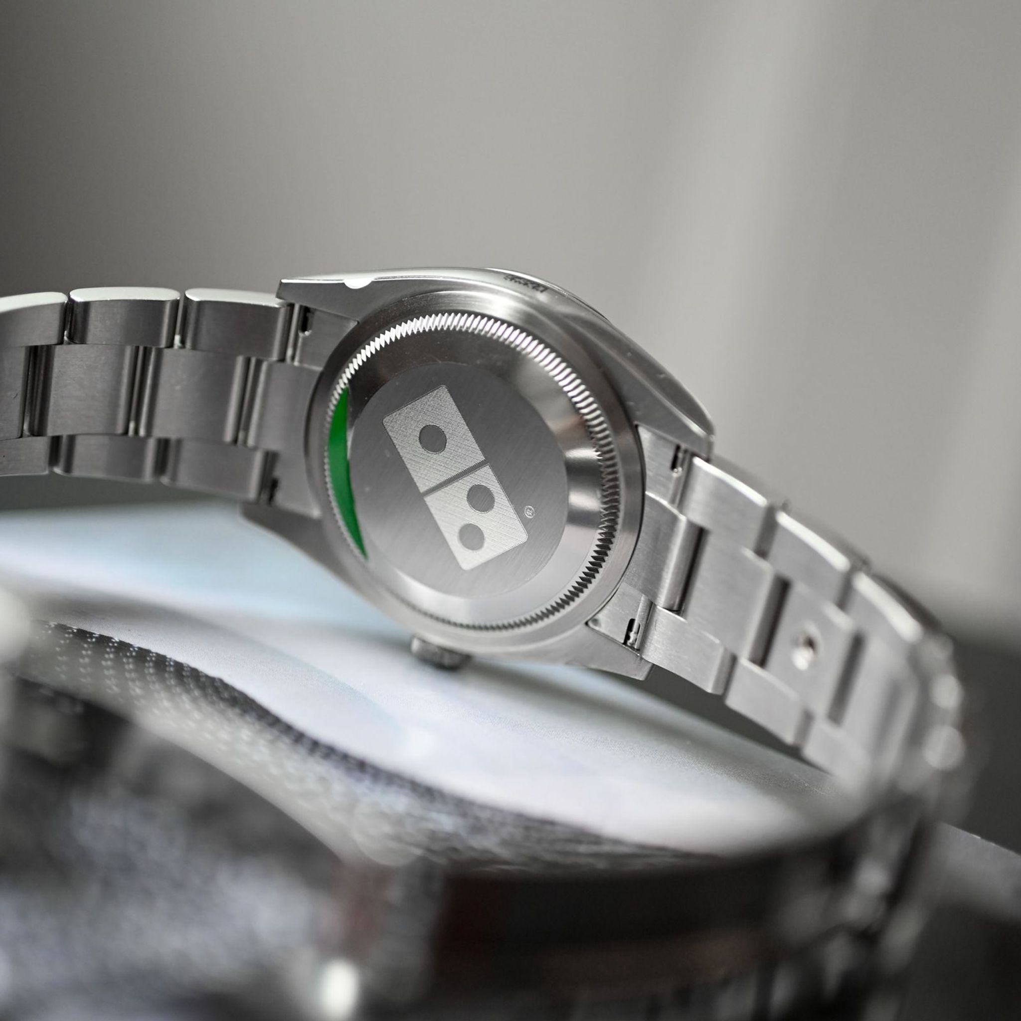 The rarity of this model lies in the fact that it was specially made for the famous pizza brand "Domino's Pizza ”, with the logo on the case back and bracelet. Tom Monaghan, the founder of Domino's Pizza, began giving away watches in 1977 if the manager of a restaurant managed to exceed sales of $20,000 in one week! Monaghan set up the Domino's Pizza Rolex Challenge to motivate his teams. The Air-King ref. 5500 was the most widely distributed model, and one of the most famous, with the colored logo directly on the dial. As this model is no longer in production, it has been replaced by similar models up to the Oyster Perpetual ref. 126000, as seen here, since 2020.