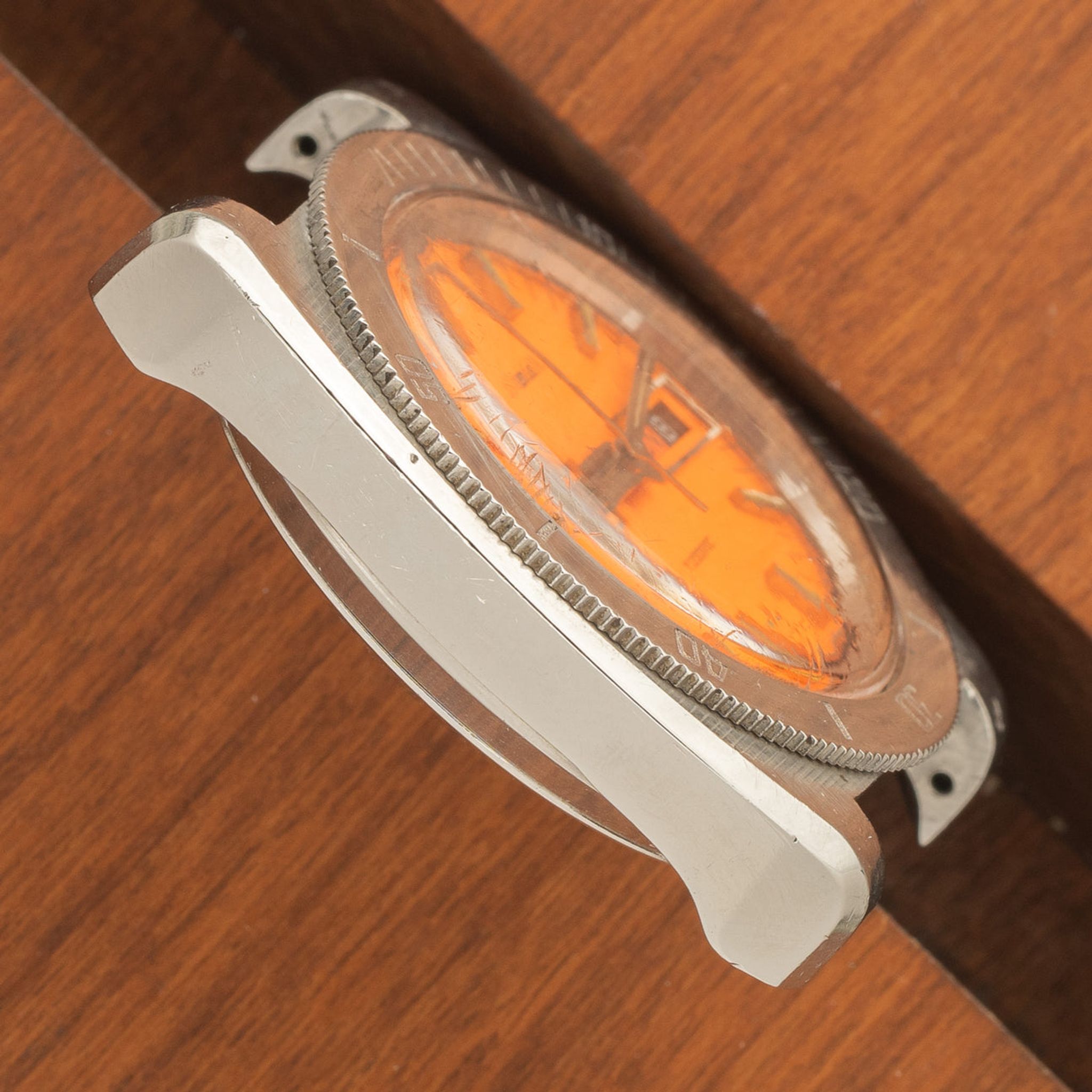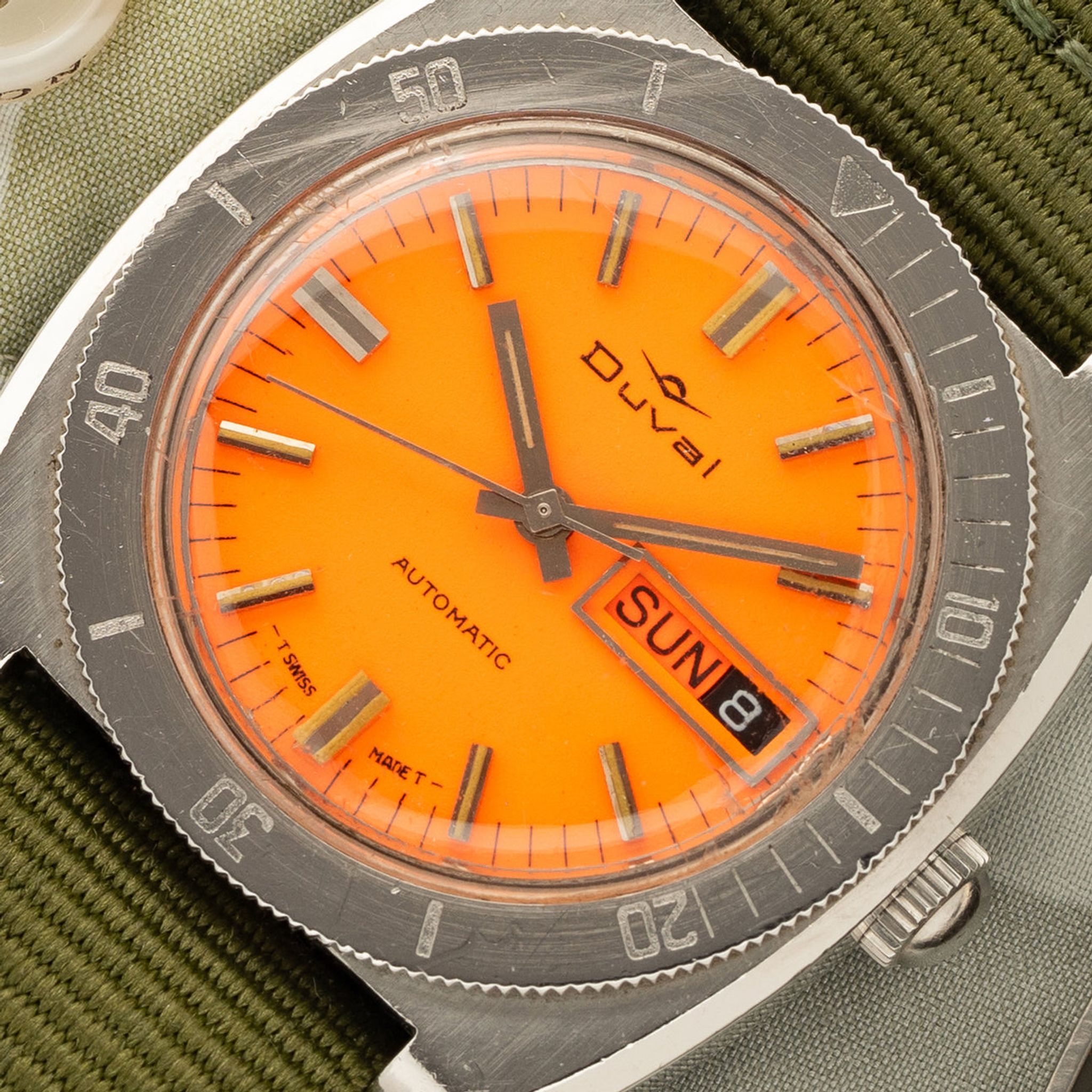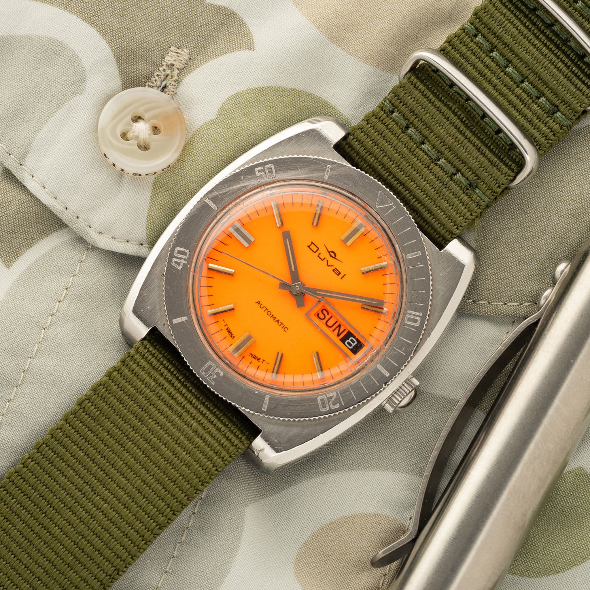 There's very little known about Duval as a brand. This timepiece is therefore is a great find for someone looking for a vintage example that is off the beaten path. This skin diver features a bright orange dial that was difficult to resist adding to our inventory. It's not often we see a full colored dial from the vintage era and its always a welcome find! The case is nicely sized at 38mm wide and displays a beautiful sea star on its back. This piece also features an automatic day-date complication. It is plenty rugged for daily use, offers loads of character and is ready to enjoy for years to come.