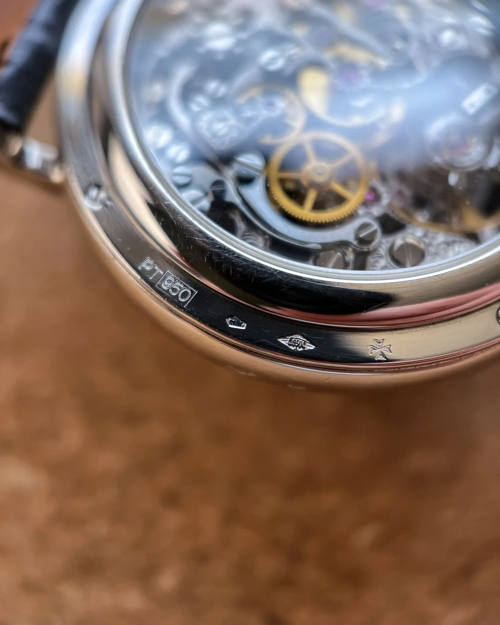 What I love — A rarely seen reference from VC, beautifully skeletonized and hand engraved Lemania ébauche. This model was thought to be made in 50 units total, 25 in platinum and 25 in yellow gold. Case back hallmarks are crisp, the overall case is very well preserved. Comes with original platinum buckle displaying correct pre 95 hallmark. Powered by the Lemania base caliber, visible from both front and back, superb! Overall a very special piece indeed.