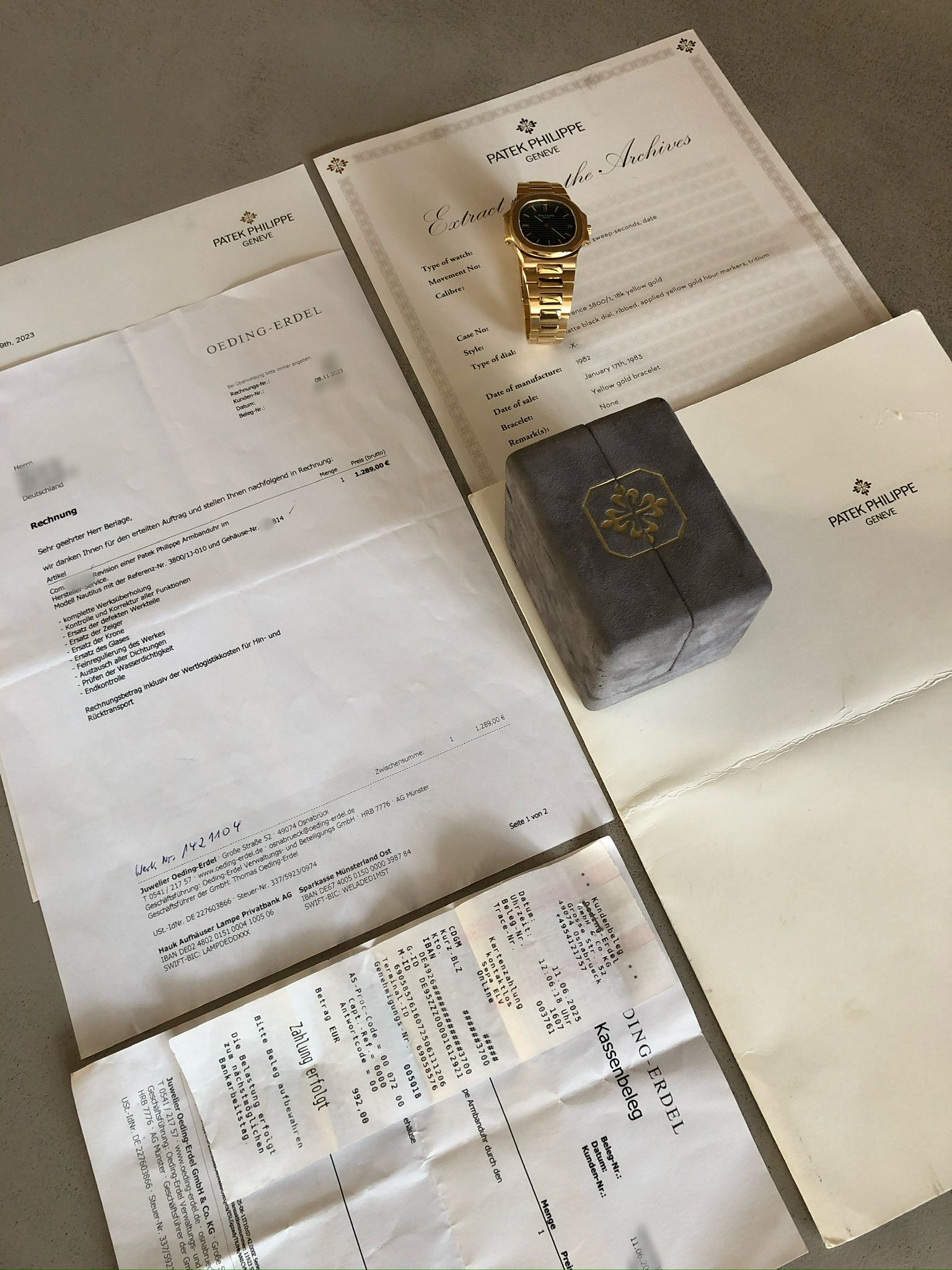 Box, Papers, etc.: Patek Philippe grey velvet box, extract from the archives, service papers including a fresh one from June 2025
