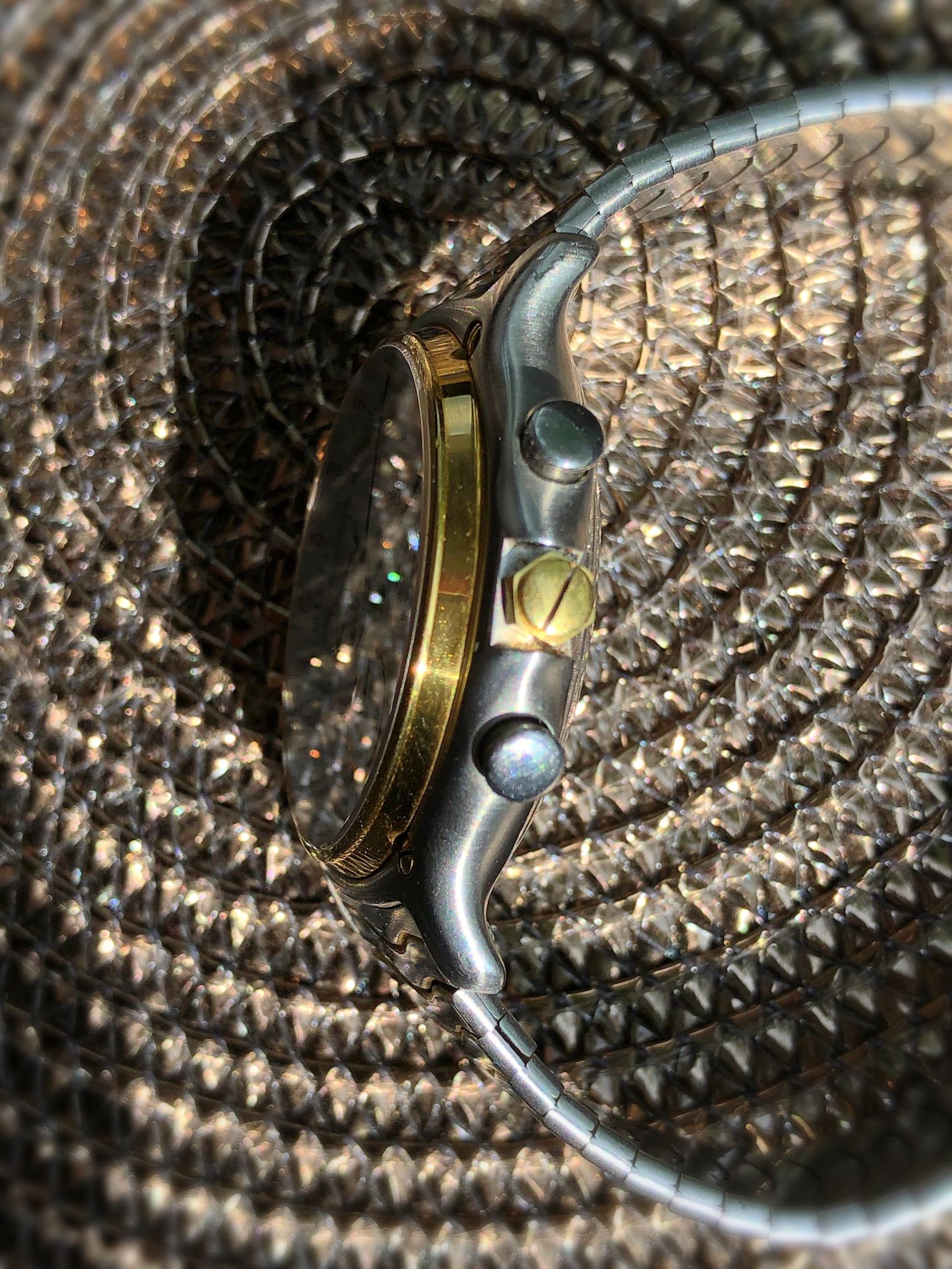 This example offered is the very iconic variation that represents the “Miami Vice” title featuring a white dial with black hands for the hour, minute and chronograph hand. While the rest of the watch is in stainless-steel such as the case, the bezel, screws and crown are in yellow-gold.