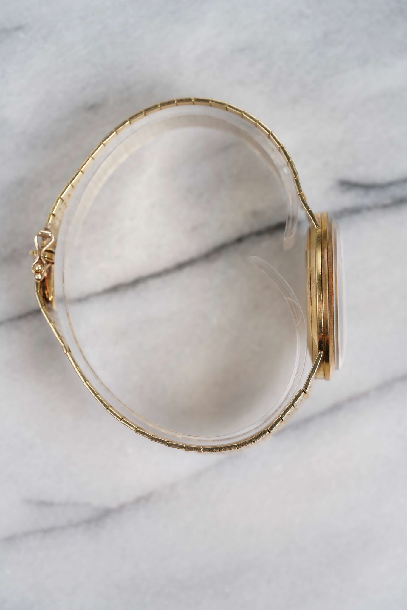Here's a vintage Ebel manual wind in 18K yellow gold with a champagne sapphire dial from the 1970s. Keeps great time and is fully functional. Measurements include a 34mm case size and an 18mm lug width (signed clasp) that fits up to a 7.5 inch wrist. Over $4000 0 in just scrap gold! Stick gold hands. Factory sapphire hour markers. Although its quite old school and old manish, the all gold style is coming back! All parts are original including the dial, case, and movement. the dial and case are in great cosmetic, untouched condition.