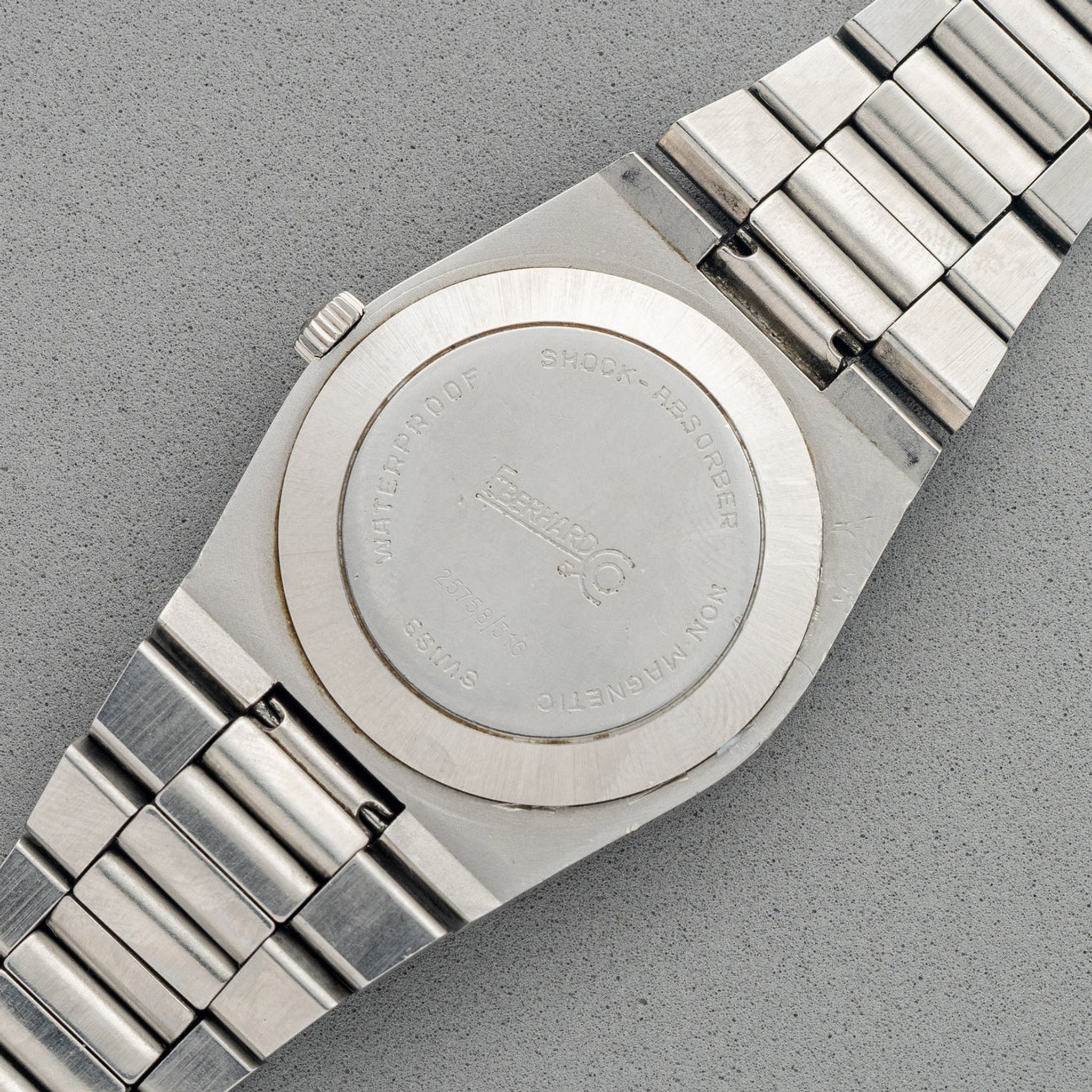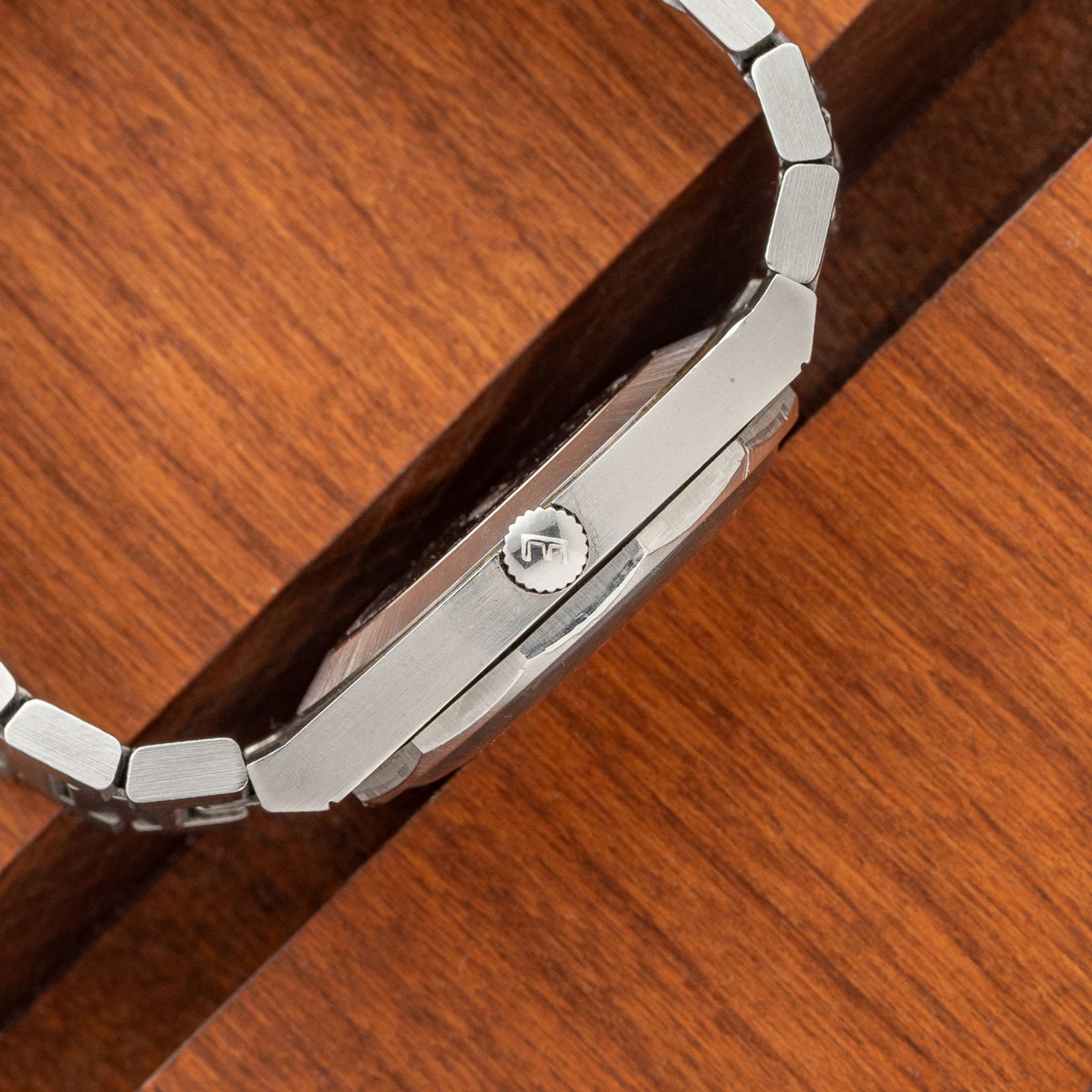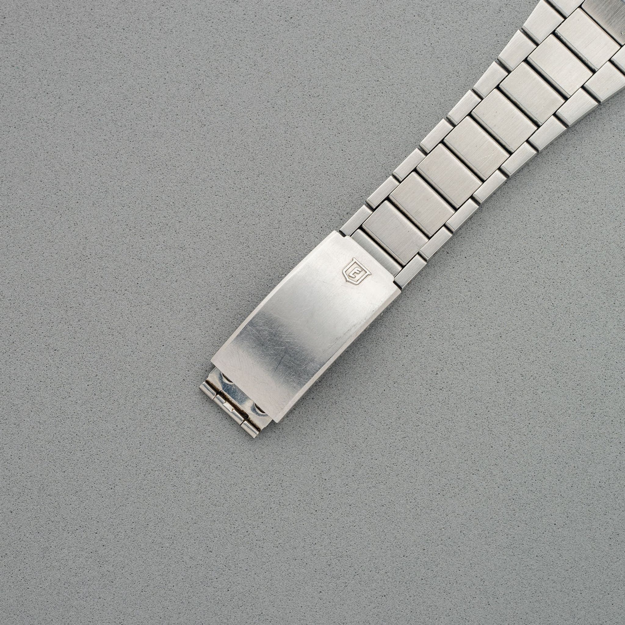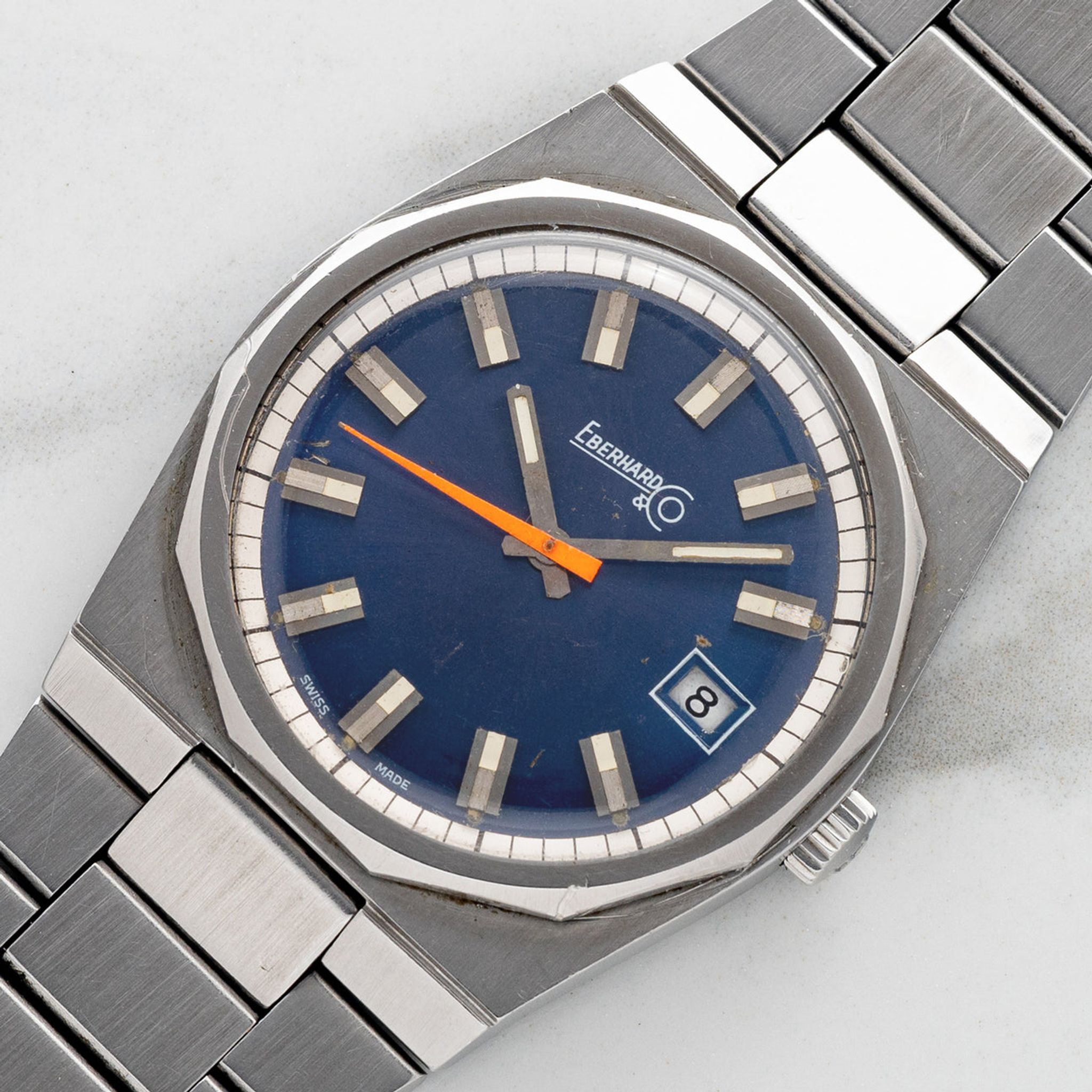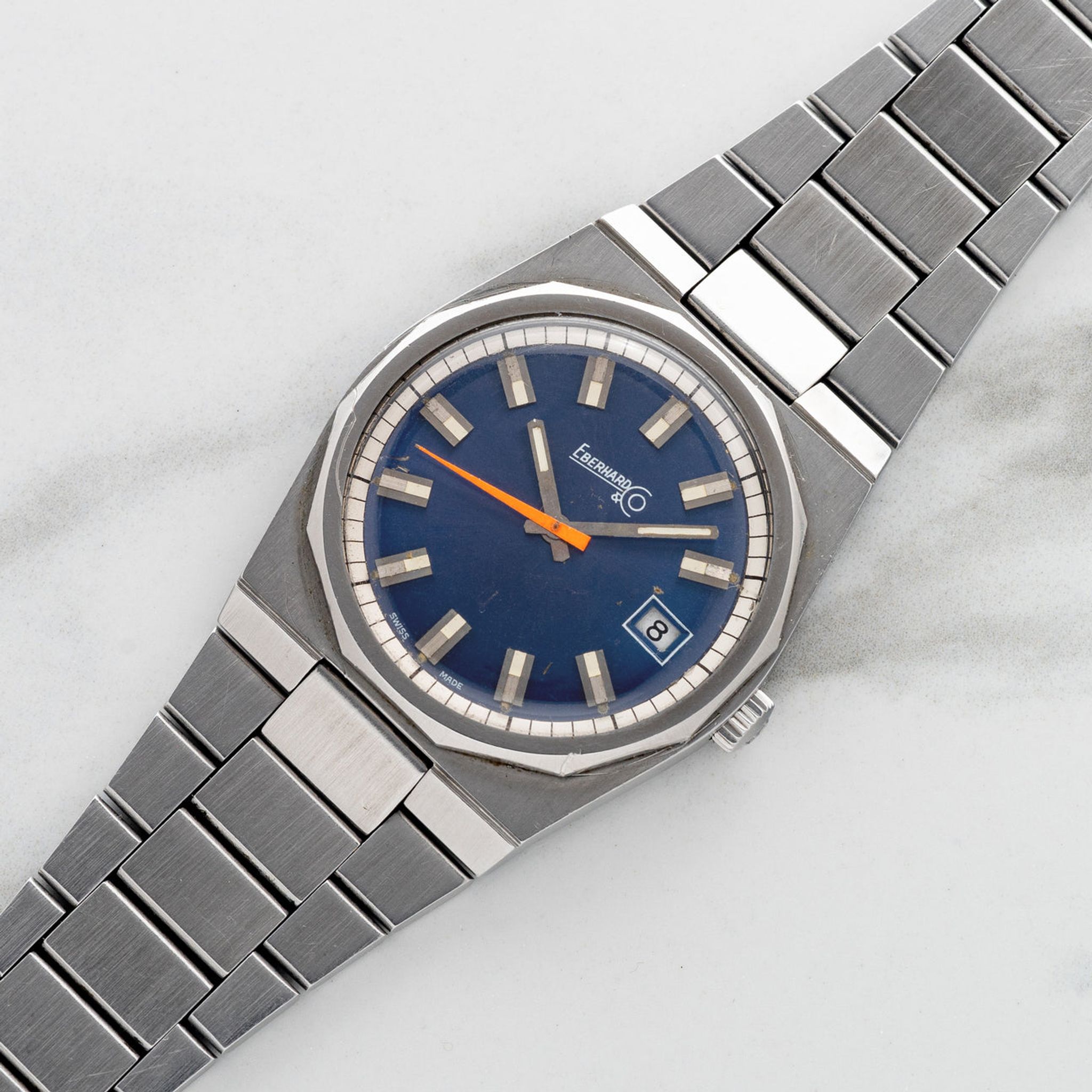 The ref. 25758/316 is clearly an homage to the AP Royal Oak. The design DNA is of course evident but Eberhard made it more playful with the contrasting pop of an orange second hand. We believe this to be a very rare watch and a great option for someone who may have been interested in the Bulova "Royal Oak" homages which have grown immensely in popularity in the past few years. While the Bulova cousins are quite seldom seen in and of themselves, the Eberhard here seems even more elusive from what we've come to find. This particular example features a gorgeous sunburst blue dial which adds another level of pop to the orange seconds hand. It has remained in good overall condition with an unpolished case/bracelet. Don't sleep on this piece if it entices you because once it’s gone it'll likely be gone for good.