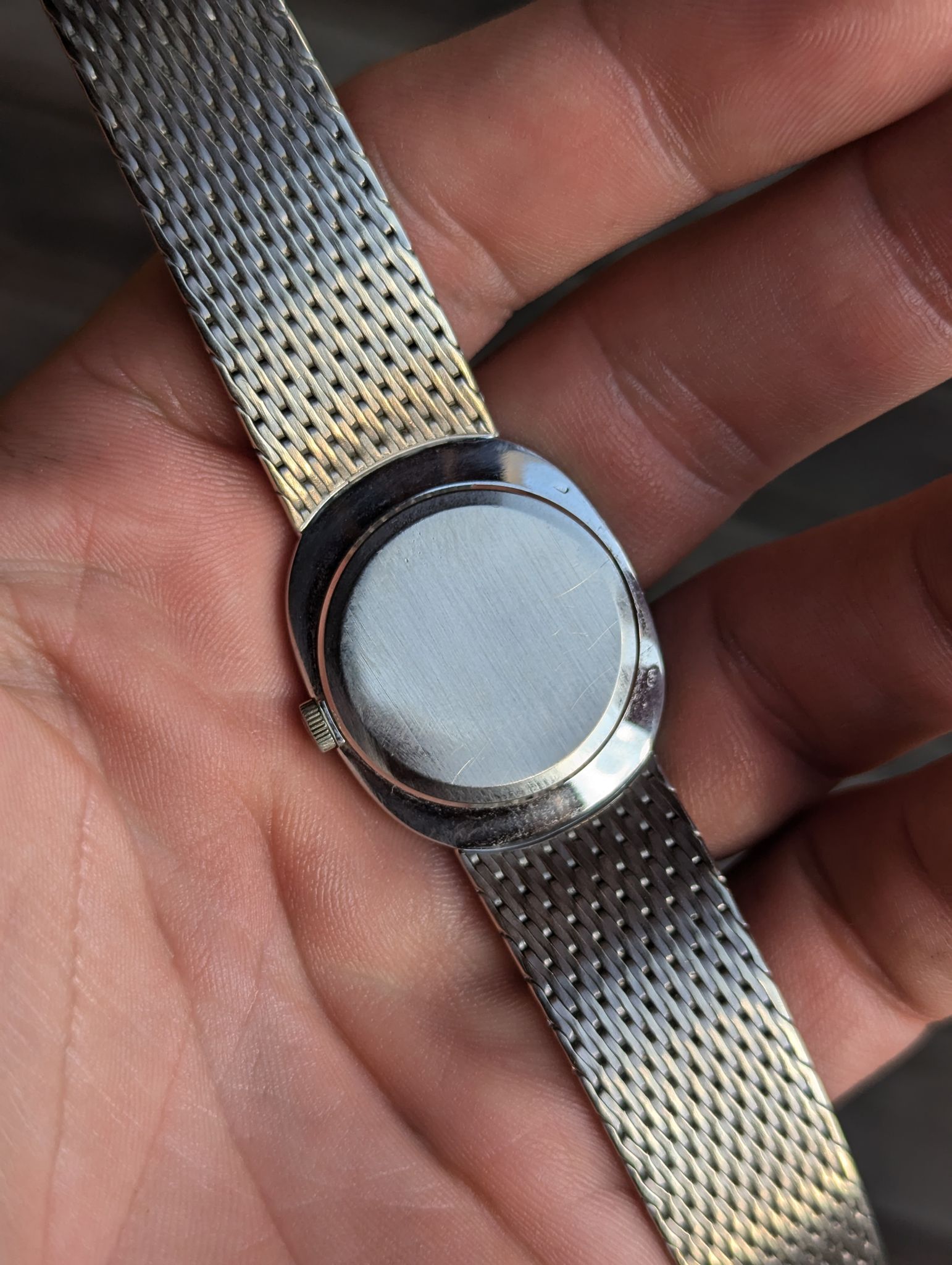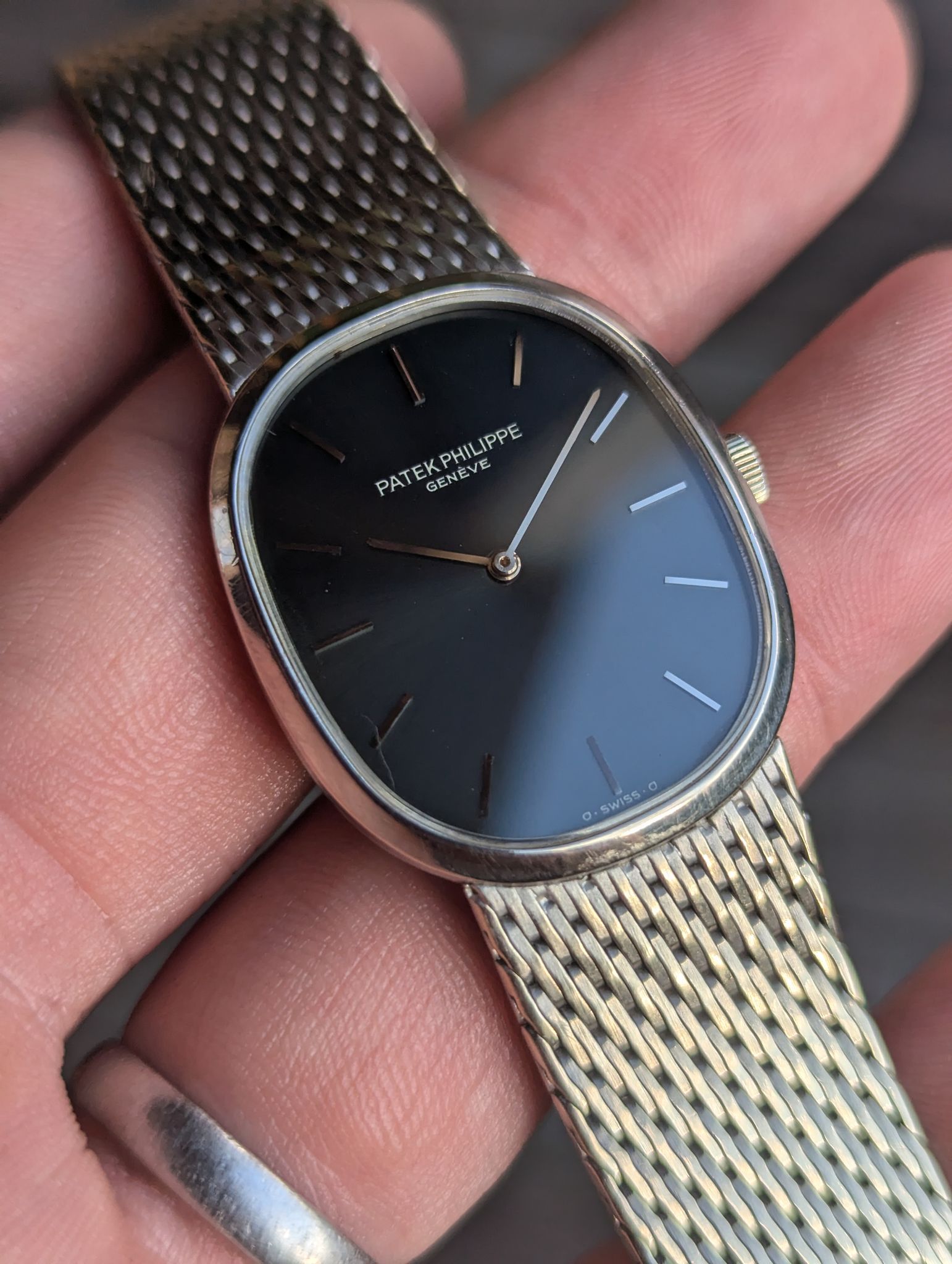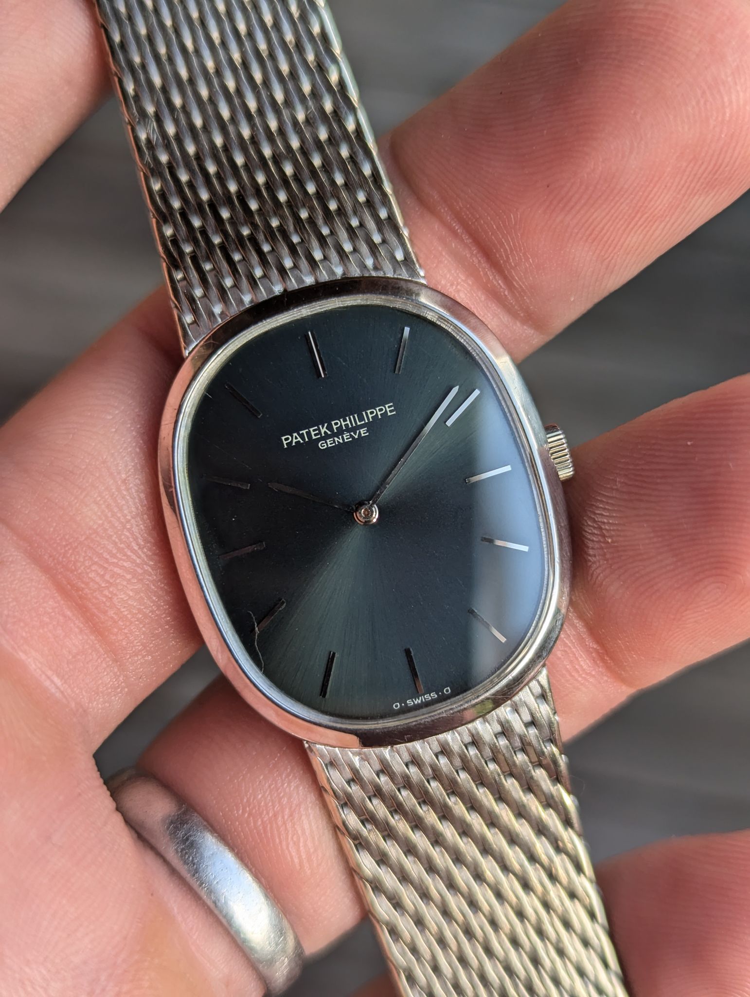 This beautiful piece, bearing the reference 3748, features an integrated white gold bracelet, fitting a 18,5cm wrist, an incredible dial, originally deep blue, now showing hues of green and dark grey, and comes with an extract from the Patek Philippe archives, confirming its production in 1982.