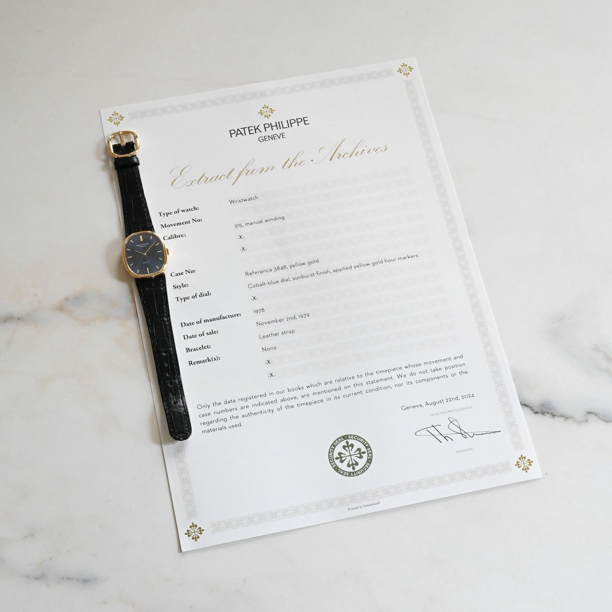 The watch comes with an extract from the Patek Philippe archives.