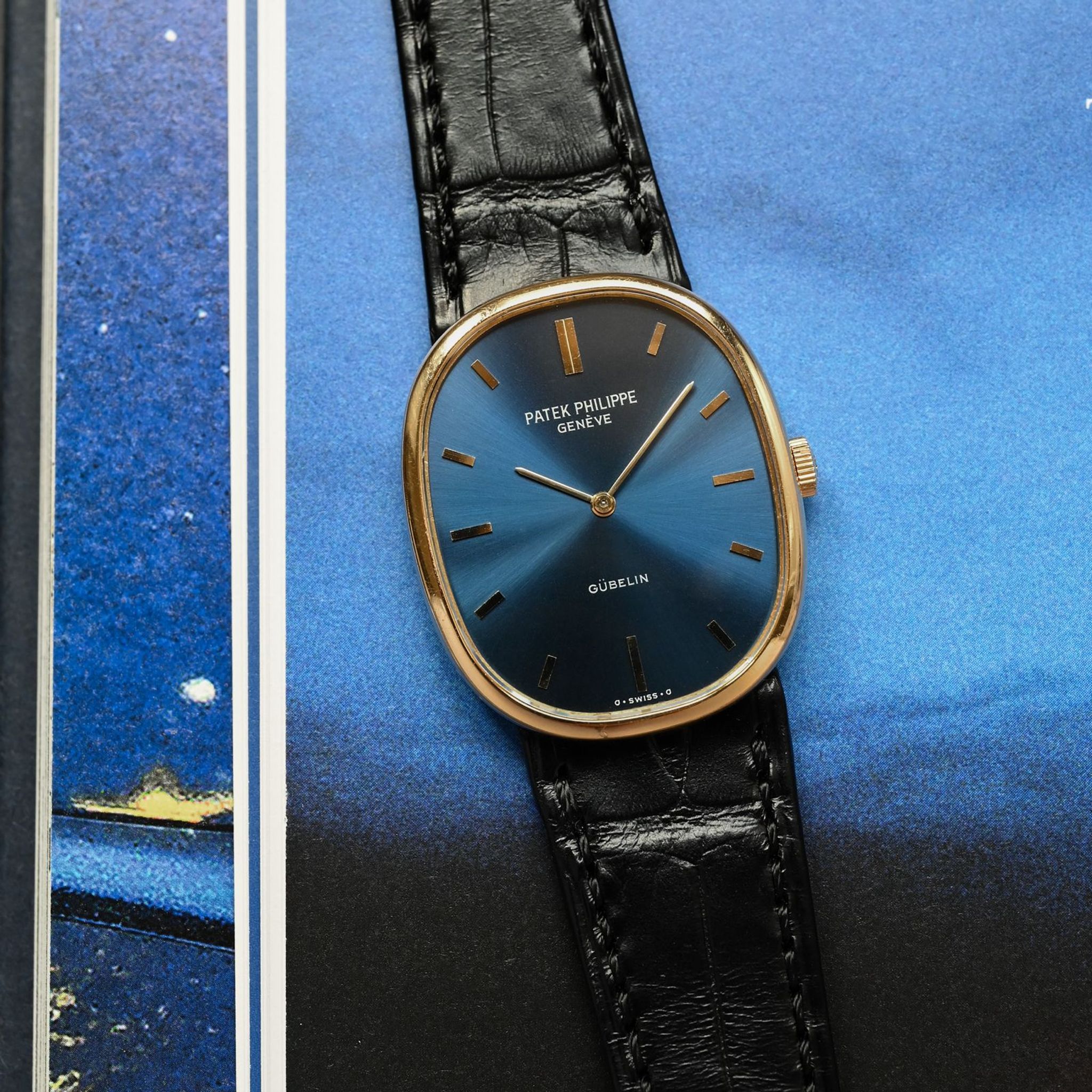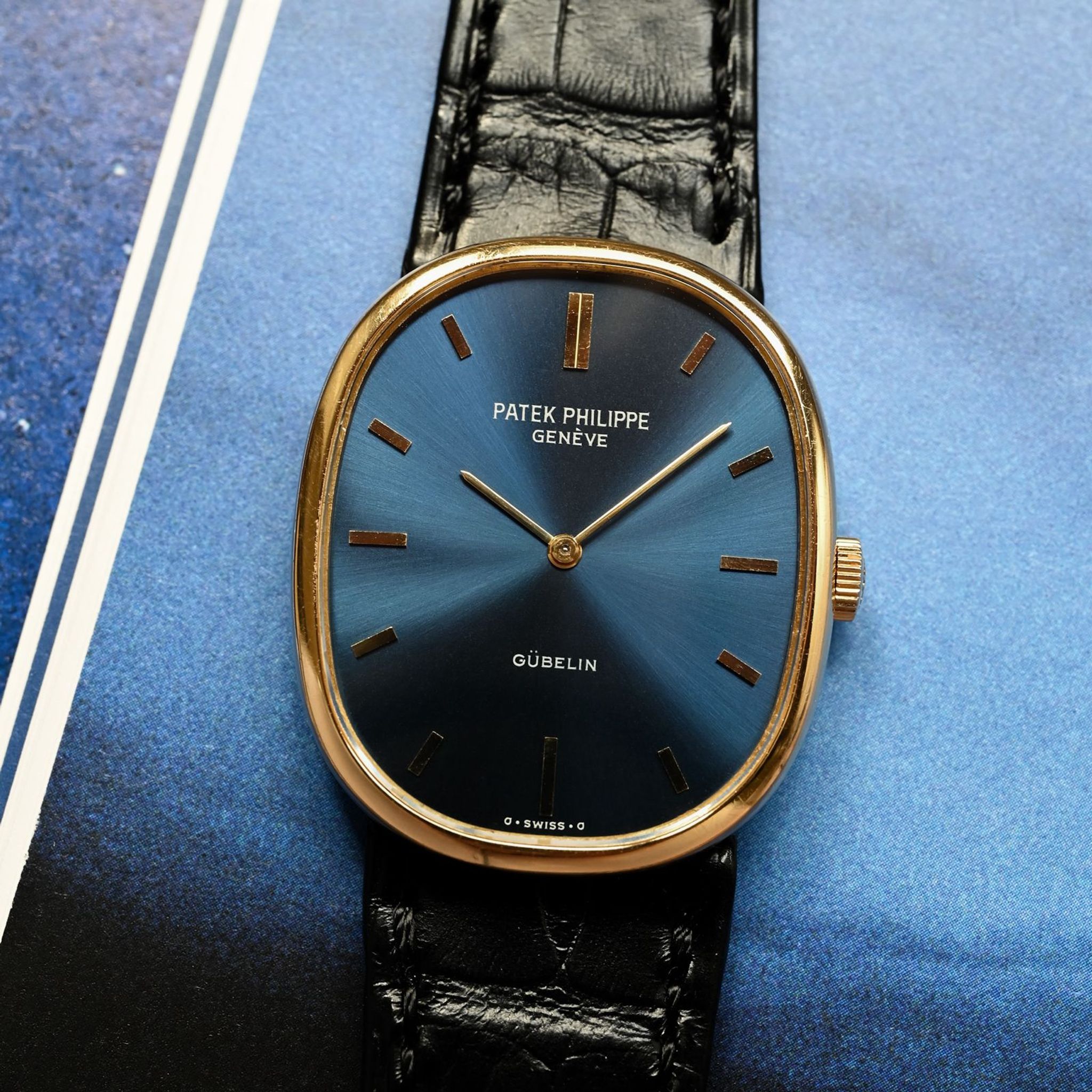 The dials, crafted by specialist Singer for Patek Philippe, offer a simple yet striking contrast between the yellow gold hour-markers and hands and the blue dial with its sunray finish. The dial features a rare “GÜBELIN” signature, an important Patek Philippe retailer historically based in Lucerne, Switzerland, and models bearing this retailer's name are particularly sought-after.