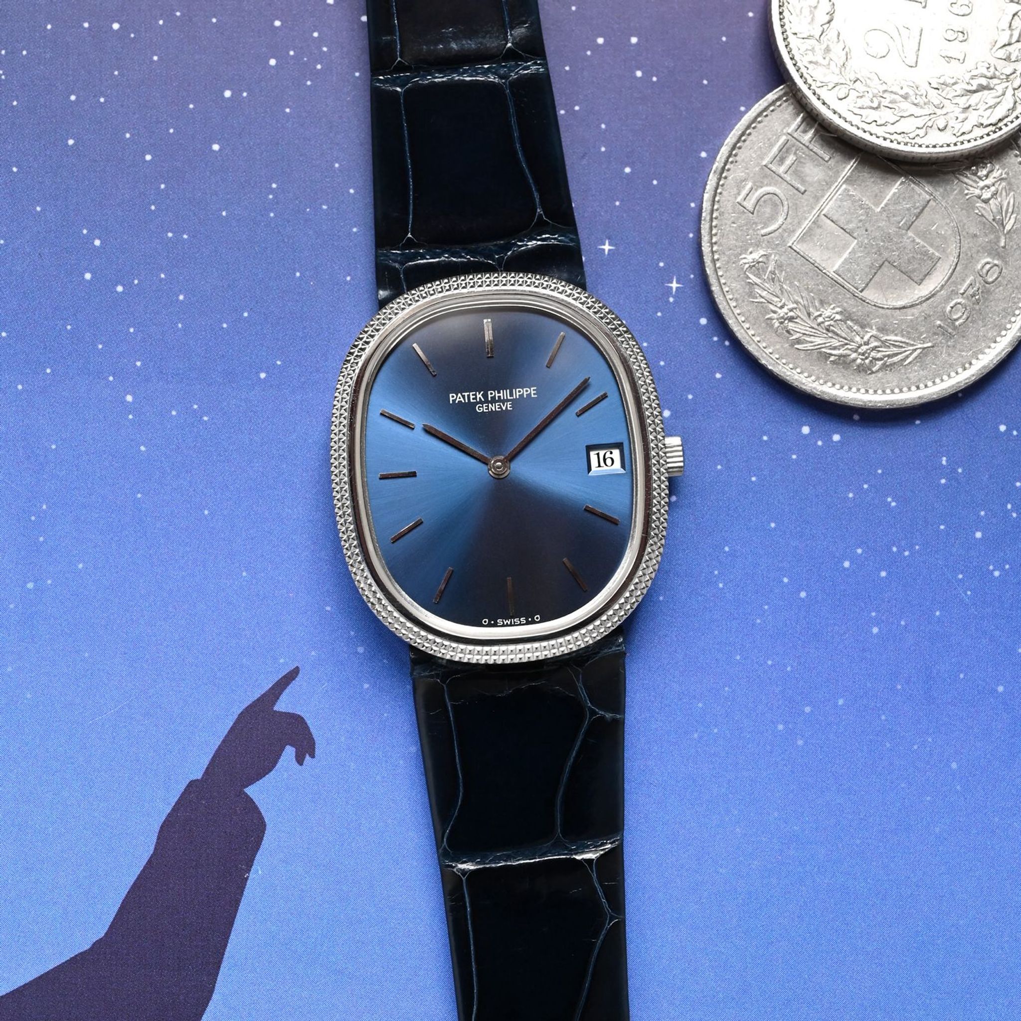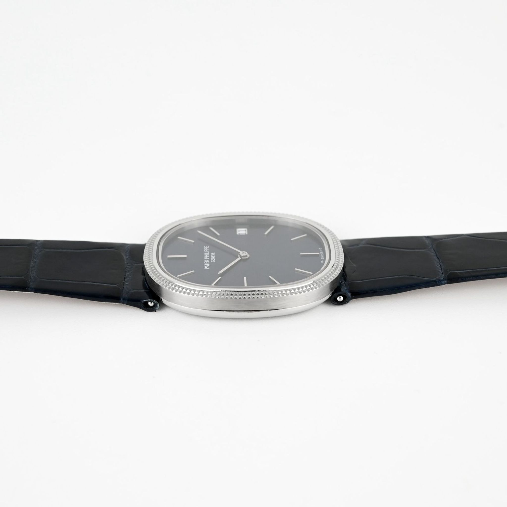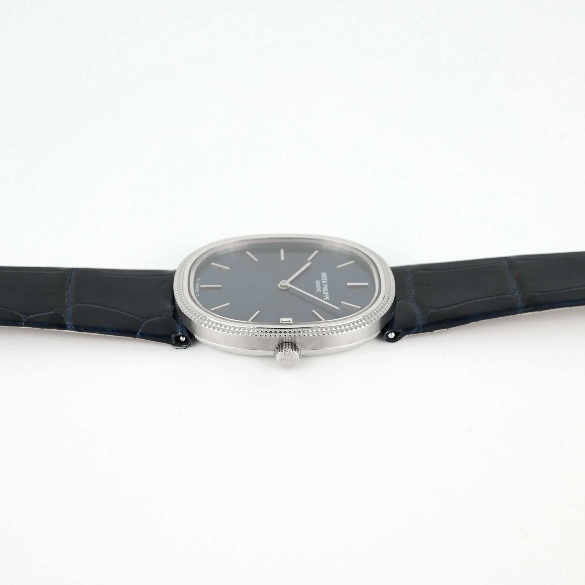This particularly rare version of the Ellipse is made of steel, an alloy rarely used by Patek Philippe for these classic models, and features a bezel with a “Clou de Paris” decorative motif of small pyramid-shaped reliefs. Slightly larger than the original model, 28.6mm wide compared to 27mm, it features a date function at 3 o'clock and is equipped with a quartz movement, caliber E 23 SC.