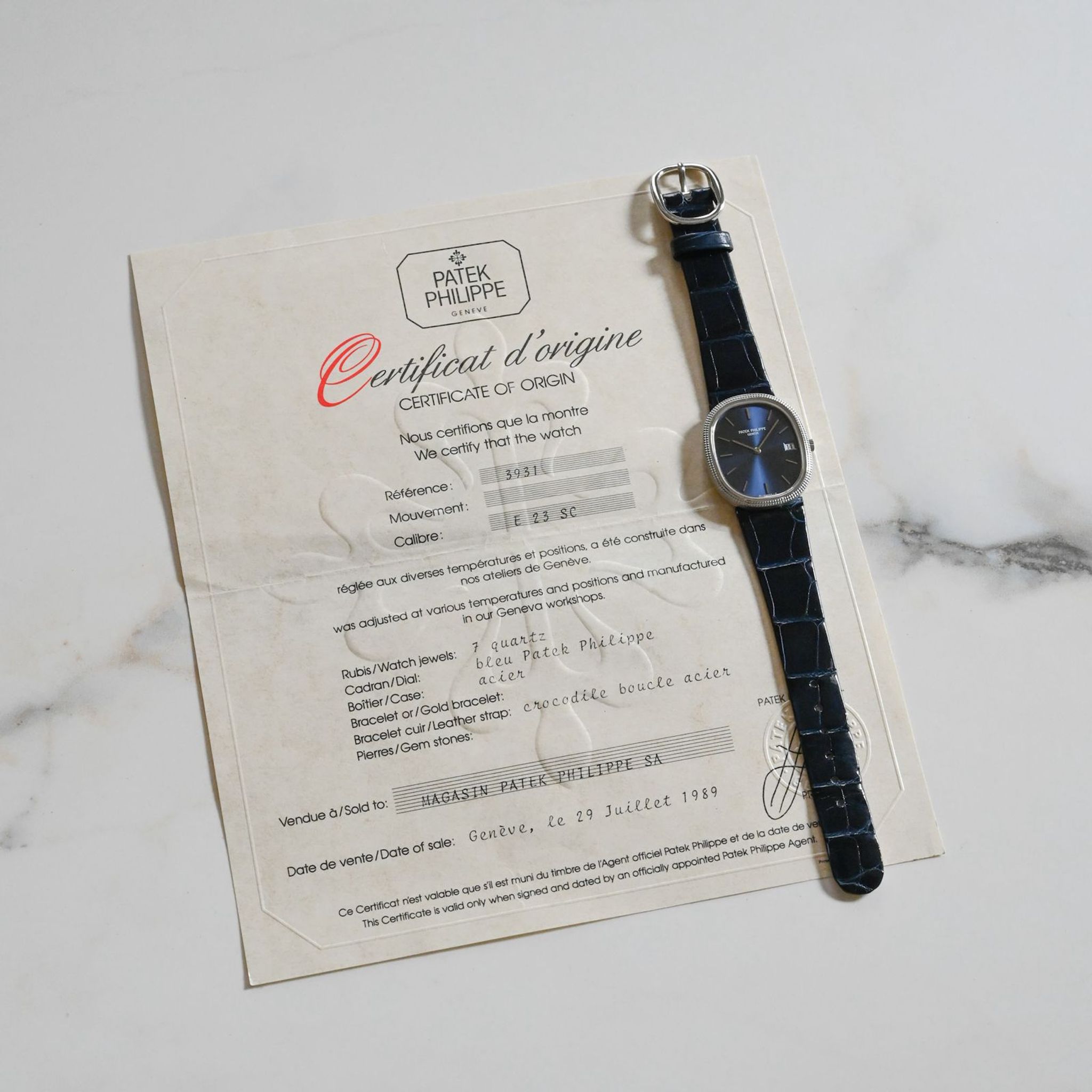 The watch comes with its Patek Philippe certificate of origin (dated 1989 in Geneva).