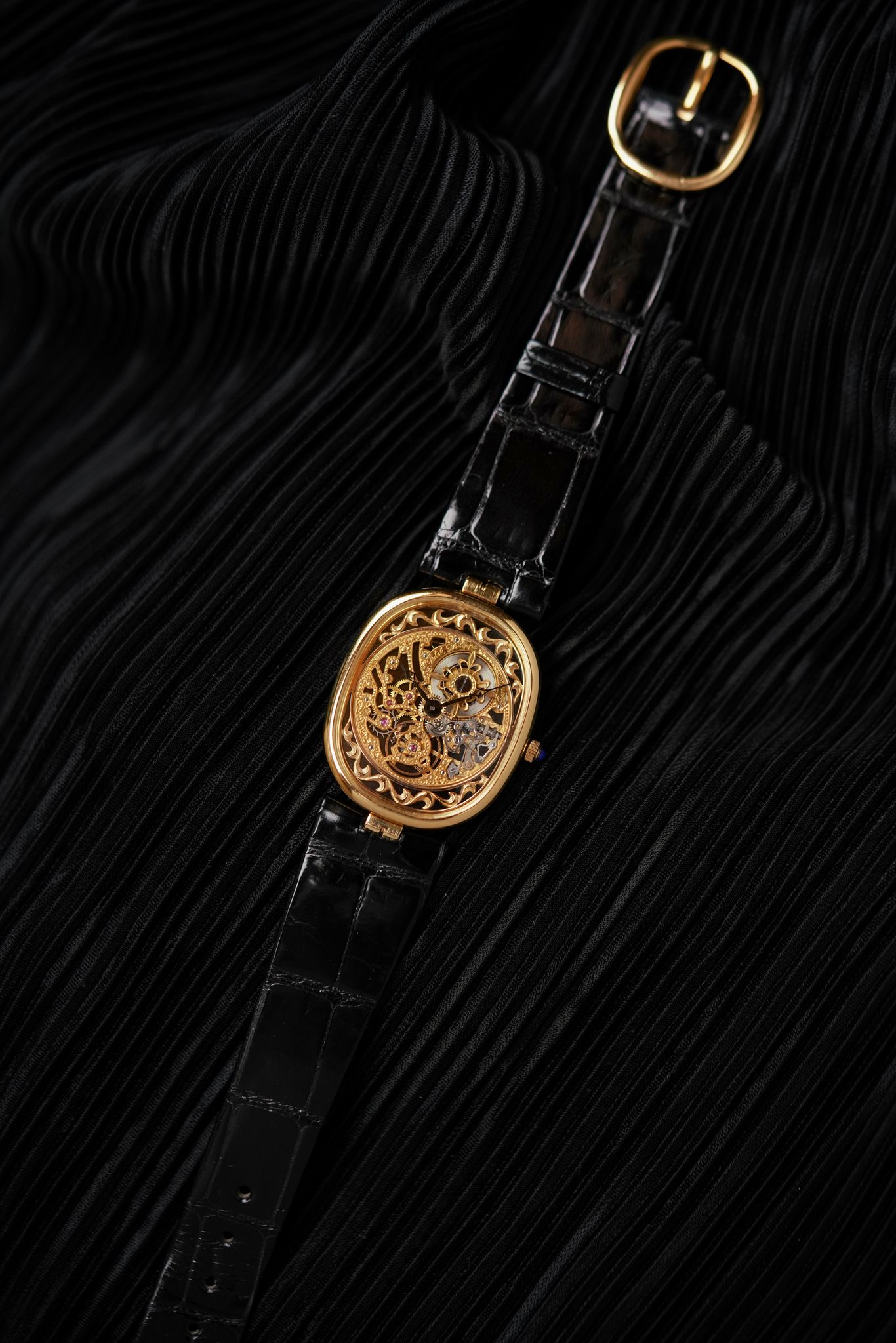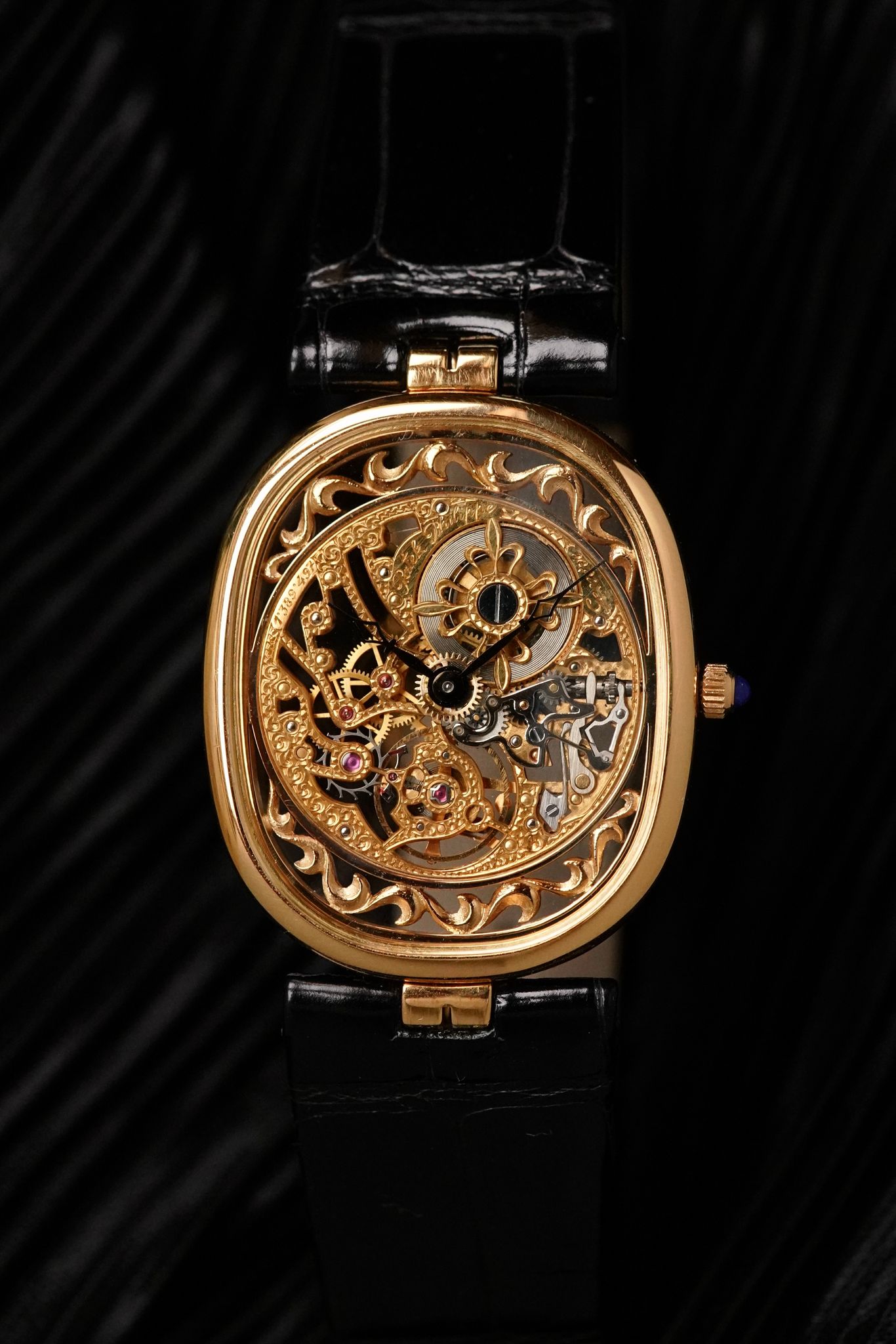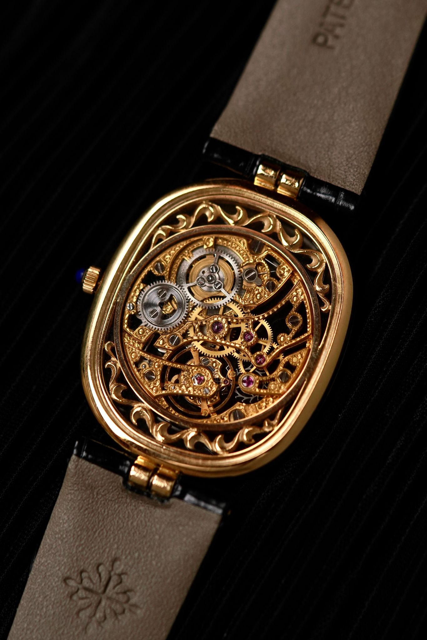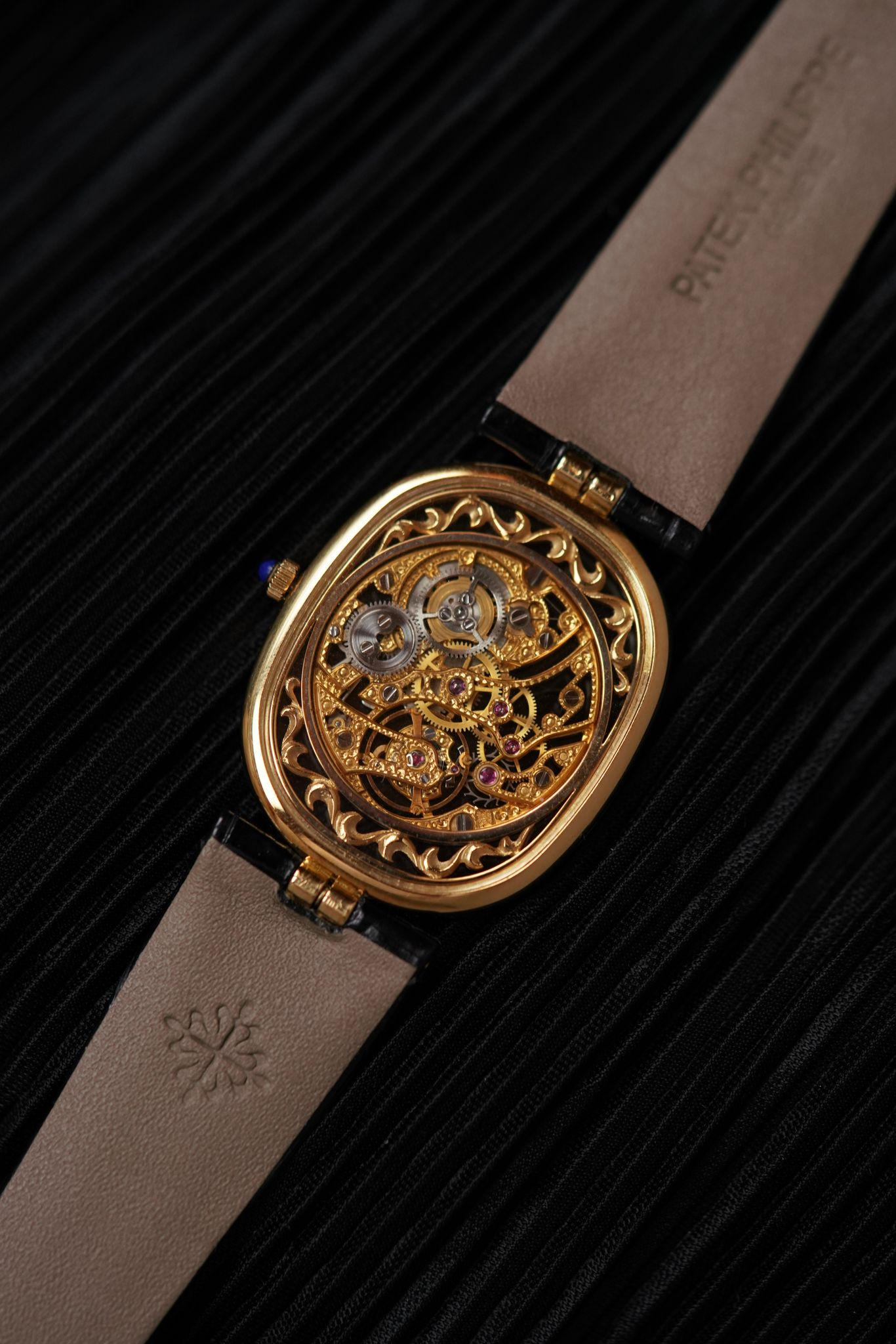 A Patek Philippe ref. 3880 — an Ellipse unlike any other. Crafted in 18k yellow gold, this openworked marvel reveals a fully hand-engraved skeleton movement, each bridge sculpted into swirling arabesques of light and shadow. The case measures 33 × 28 mm and features the signature cabochon crown, paired with a glossy black strap and gold Ellipse buckle.