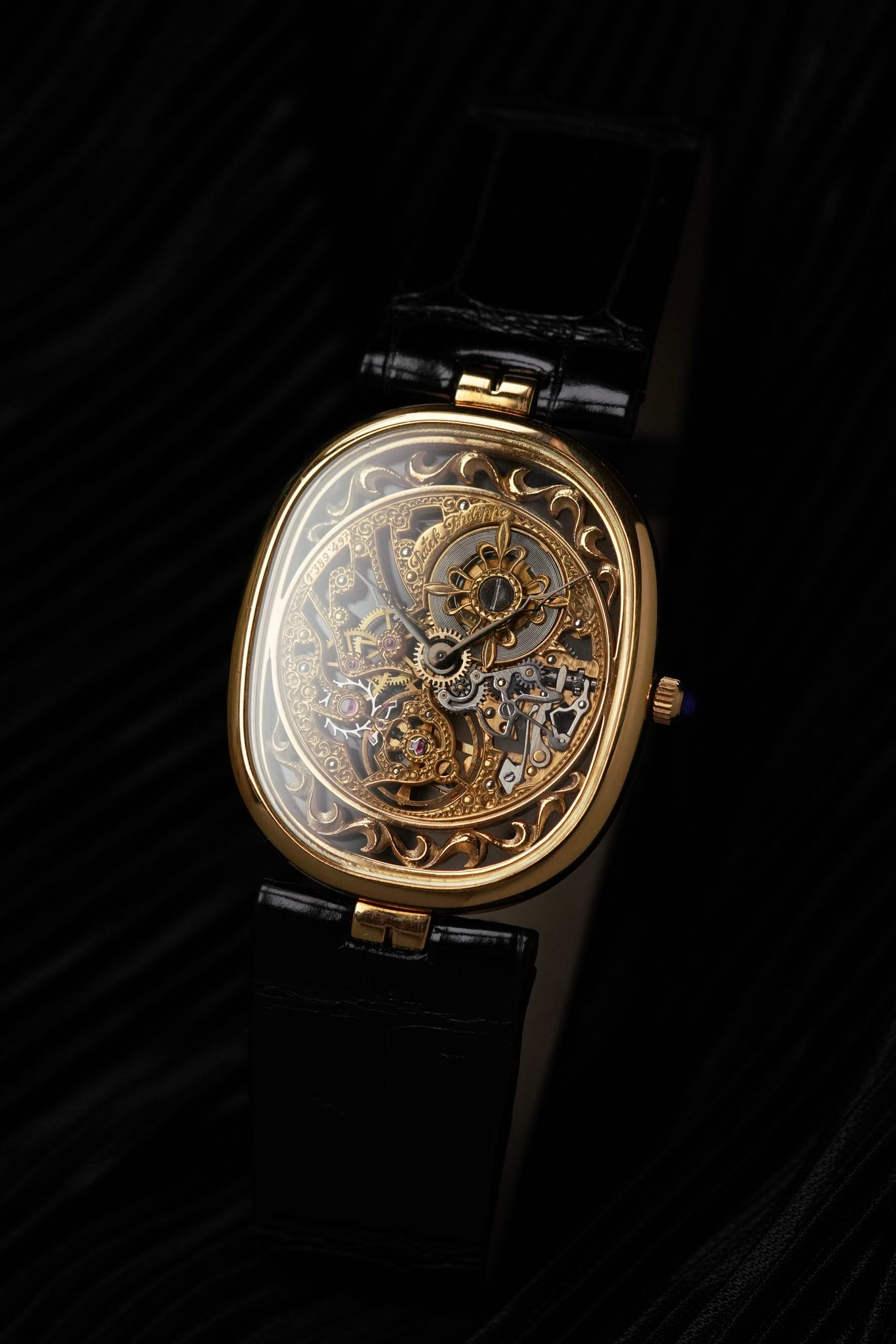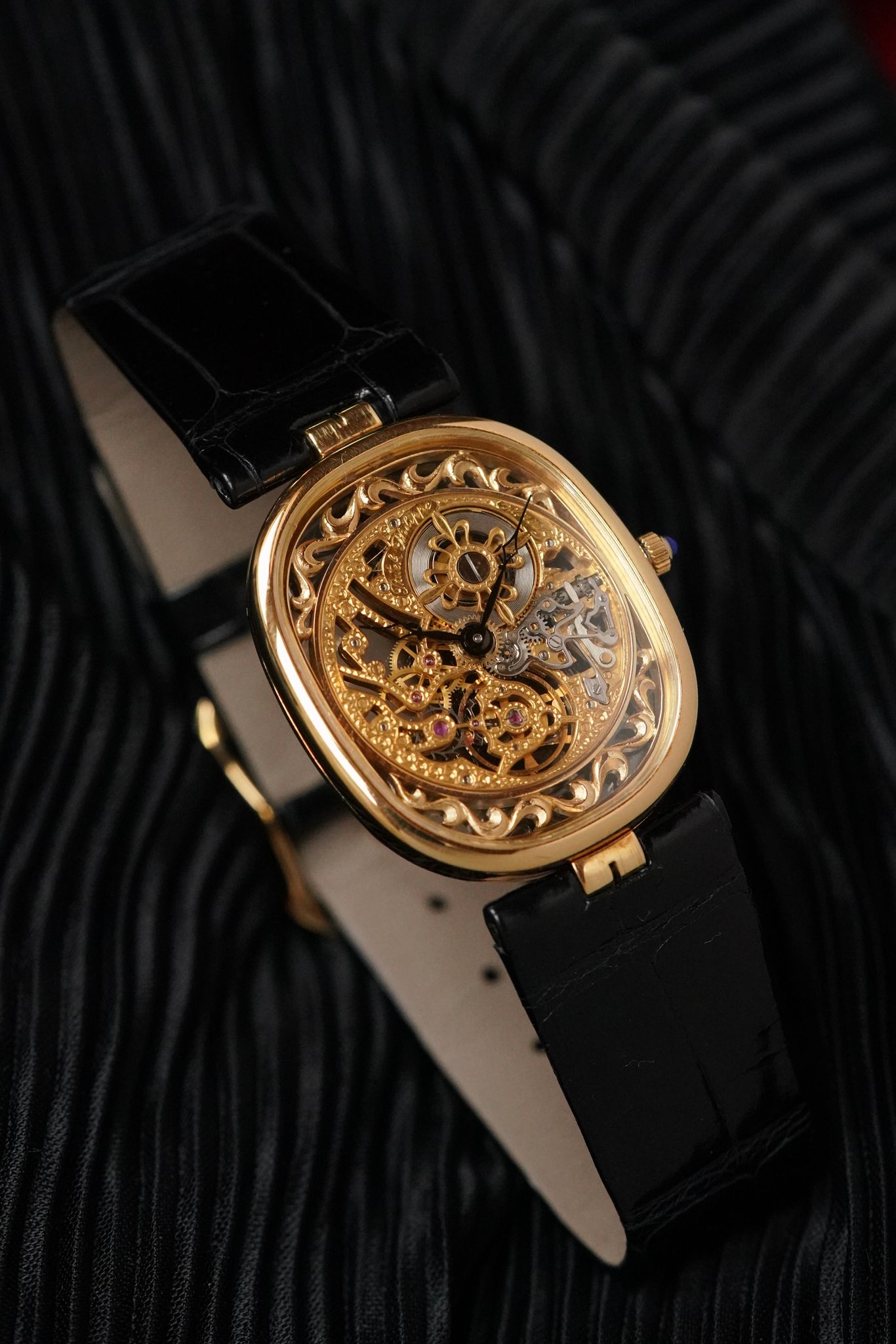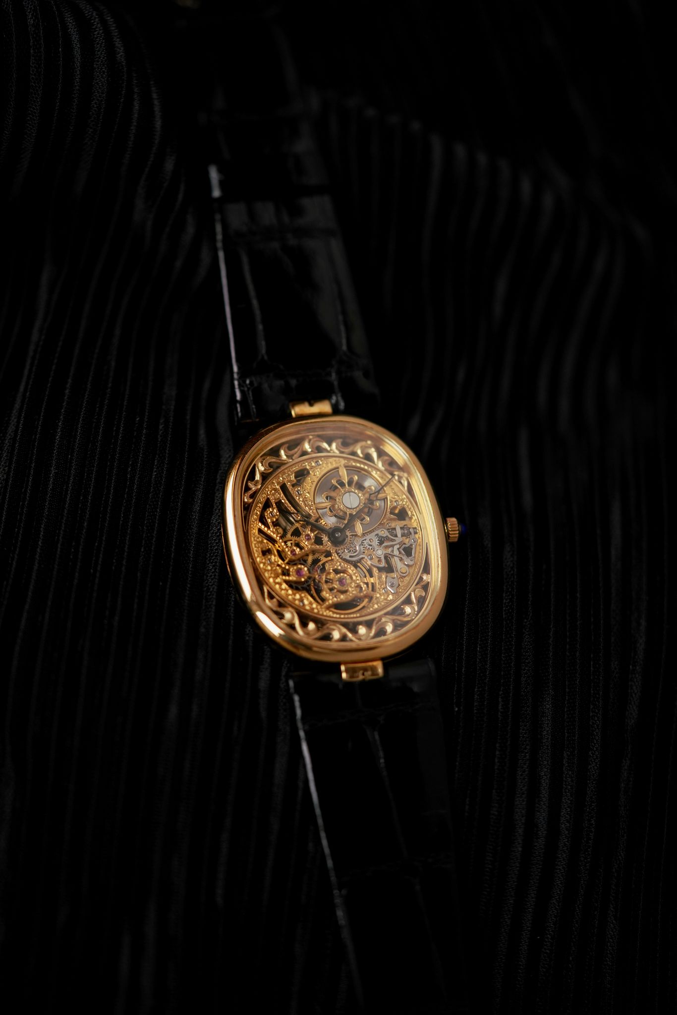A Patek Philippe ref. 3880 — an Ellipse unlike any other. Crafted in 18k yellow gold, this openworked marvel reveals a fully hand-engraved skeleton movement, each bridge sculpted into swirling arabesques of light and shadow. The case measures 33 × 28 mm and features the signature cabochon crown, paired with a glossy black strap and gold Ellipse buckle.