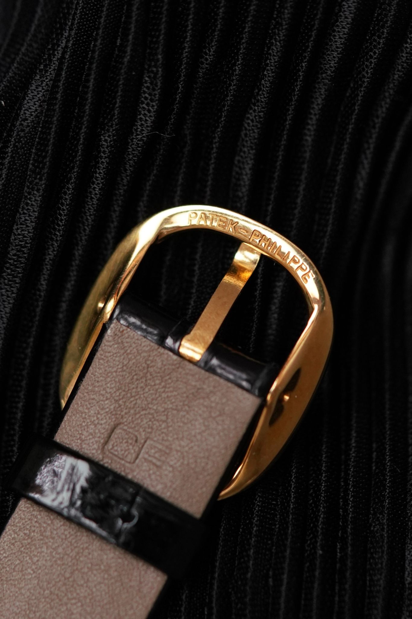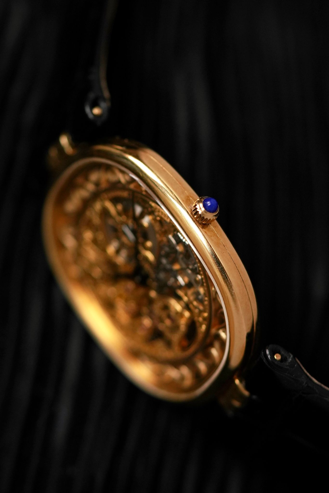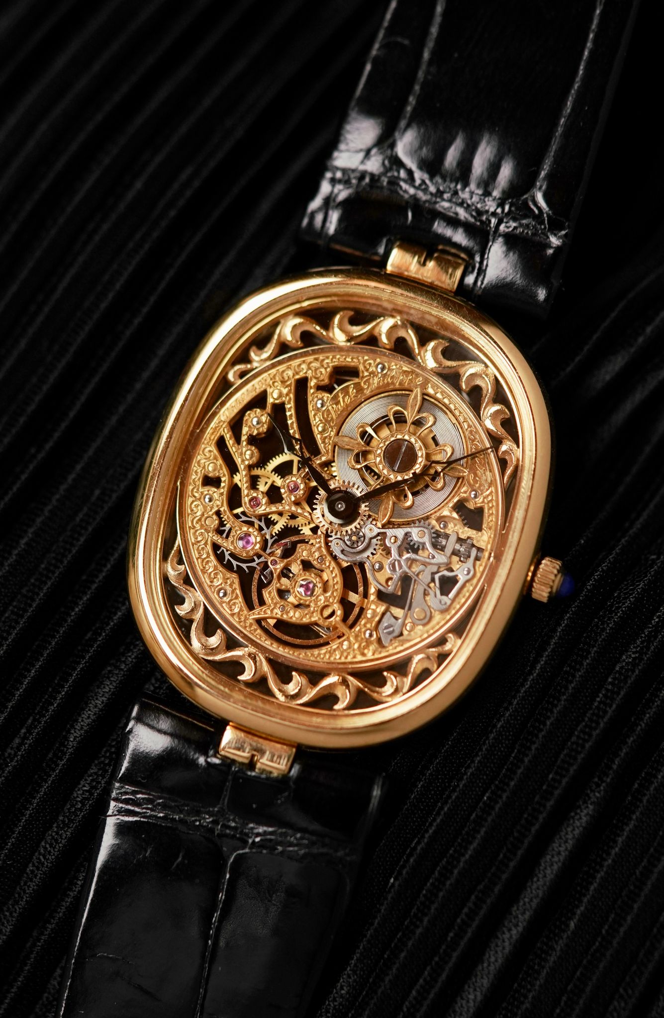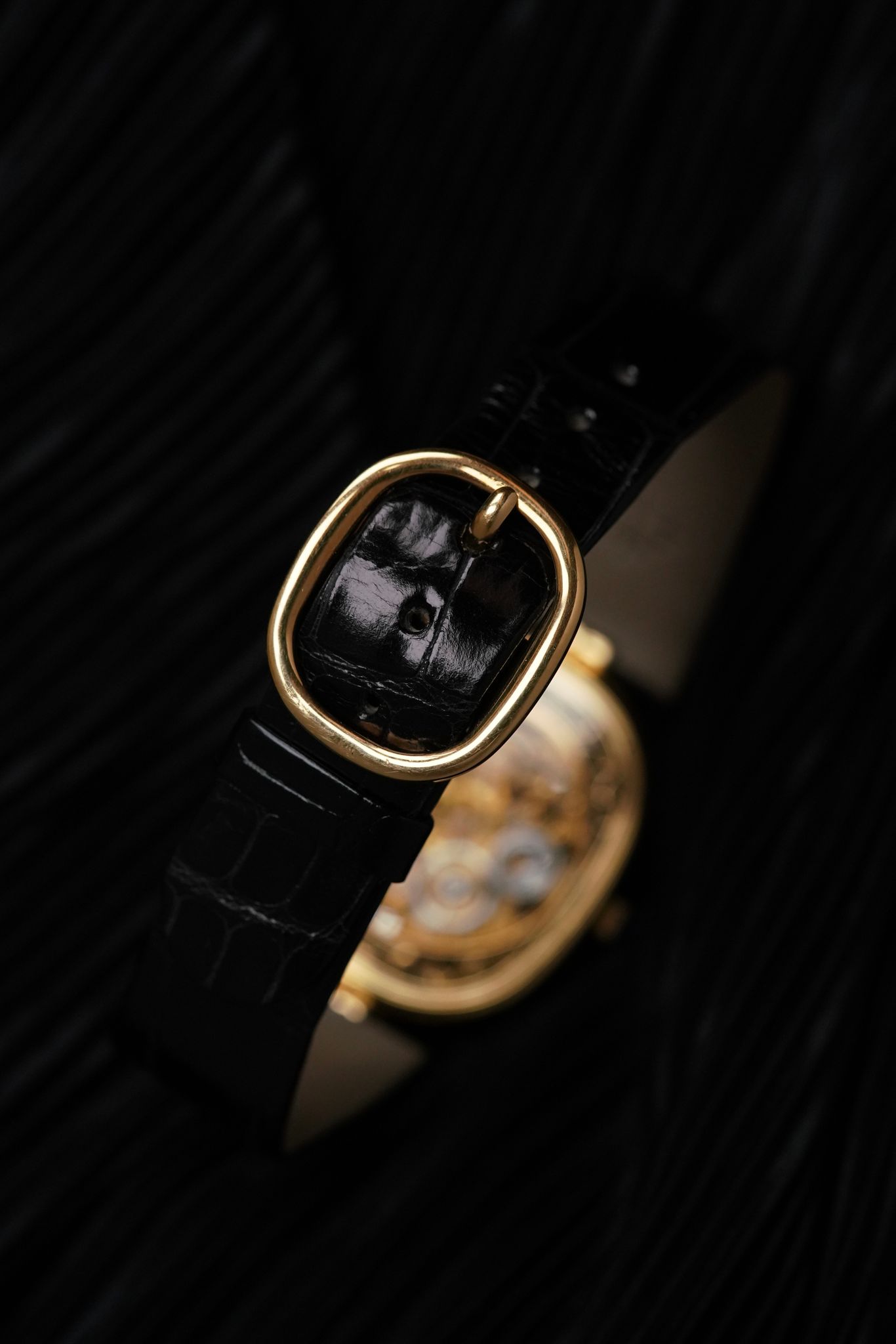 A Patek Philippe ref. 3880 — an Ellipse unlike any other. Crafted in 18k yellow gold, this openworked marvel reveals a fully hand-engraved skeleton movement, each bridge sculpted into swirling arabesques of light and shadow. The case measures 33 × 28 mm and features the signature cabochon crown, paired with a glossy black strap and gold Ellipse buckle.