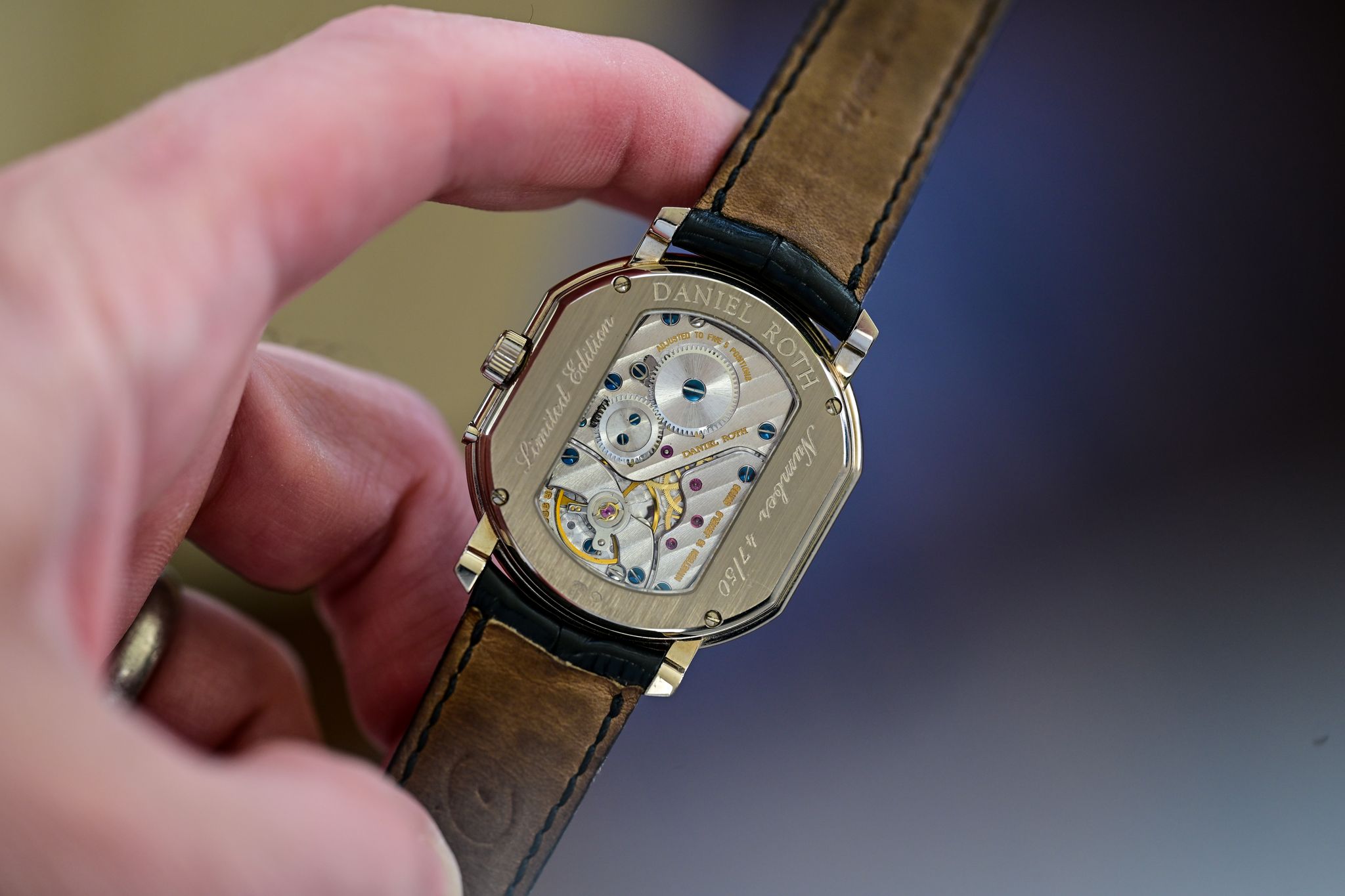 A phenomenal Daniel Roth ‘Ellipsocurvex’ ref. 0357BCSL limited edition watch of just 50 numbered pieces! Featuring a solid 18k white gold case measuring 33x40mm which wears incredibly well and similar to a 36mm round watch. Clearly inspired by his work at Breguet the dial is beautiful; with creamy hand guilloché, silver minute track displaying Roman numerals as well as a power reserve meter and moonphases. The special rectangular shaped, manually wound caliber DR900 is beautifully finished as seen through the sapphire display back. The watch is in very nice all original condition, complete with its orignal strap and pin buckle.