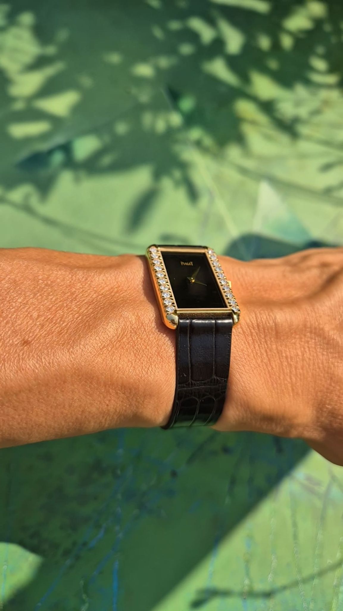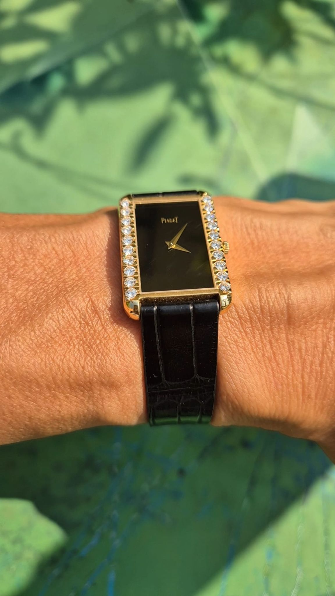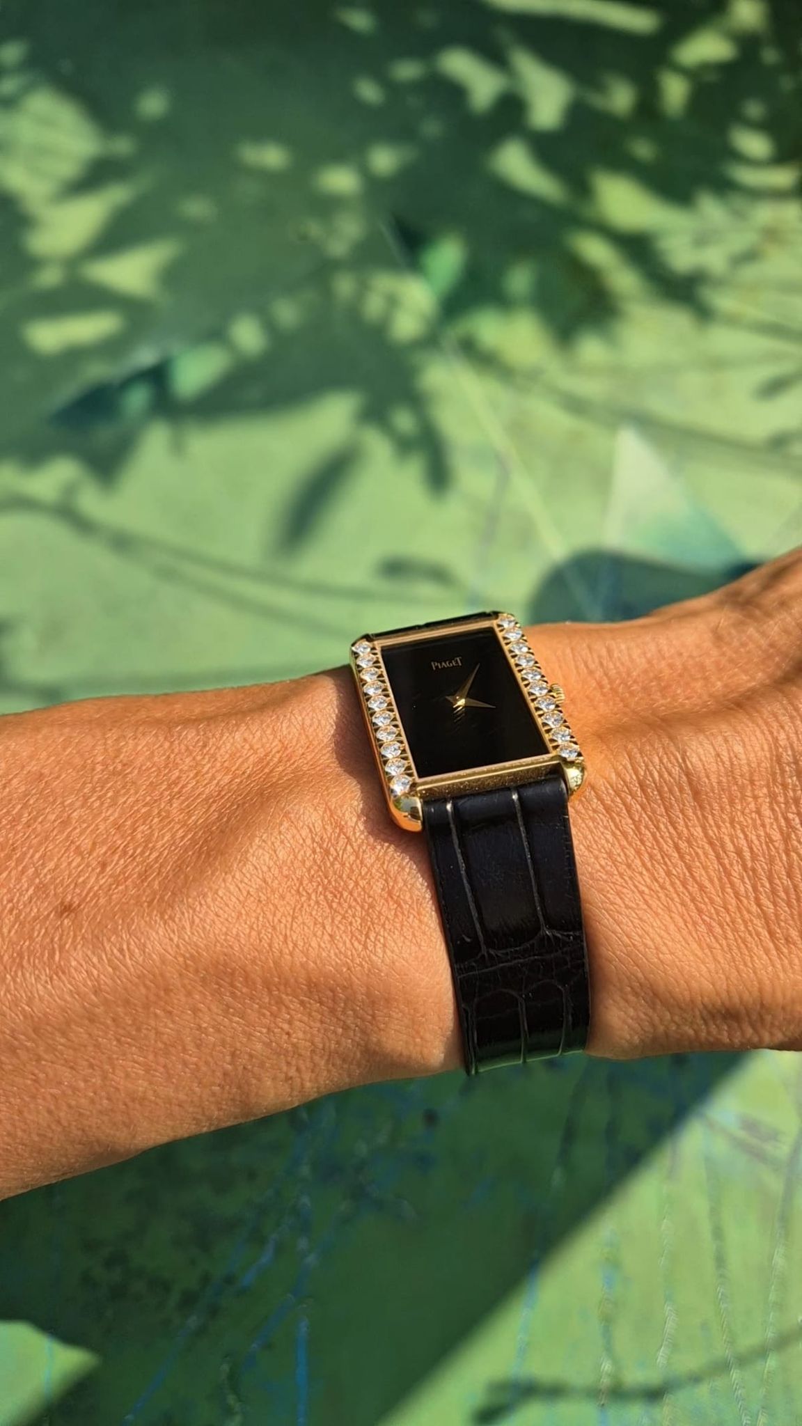 WHY WE LOVE IT? Because there is hardly more contrast in a single watch -- 20 brilliant-cut diamonds (ca. 0.8ct) vs the light-absorbing Onyx stone-dial right next to them --, than in this super-rare elongated tank by Piaget.