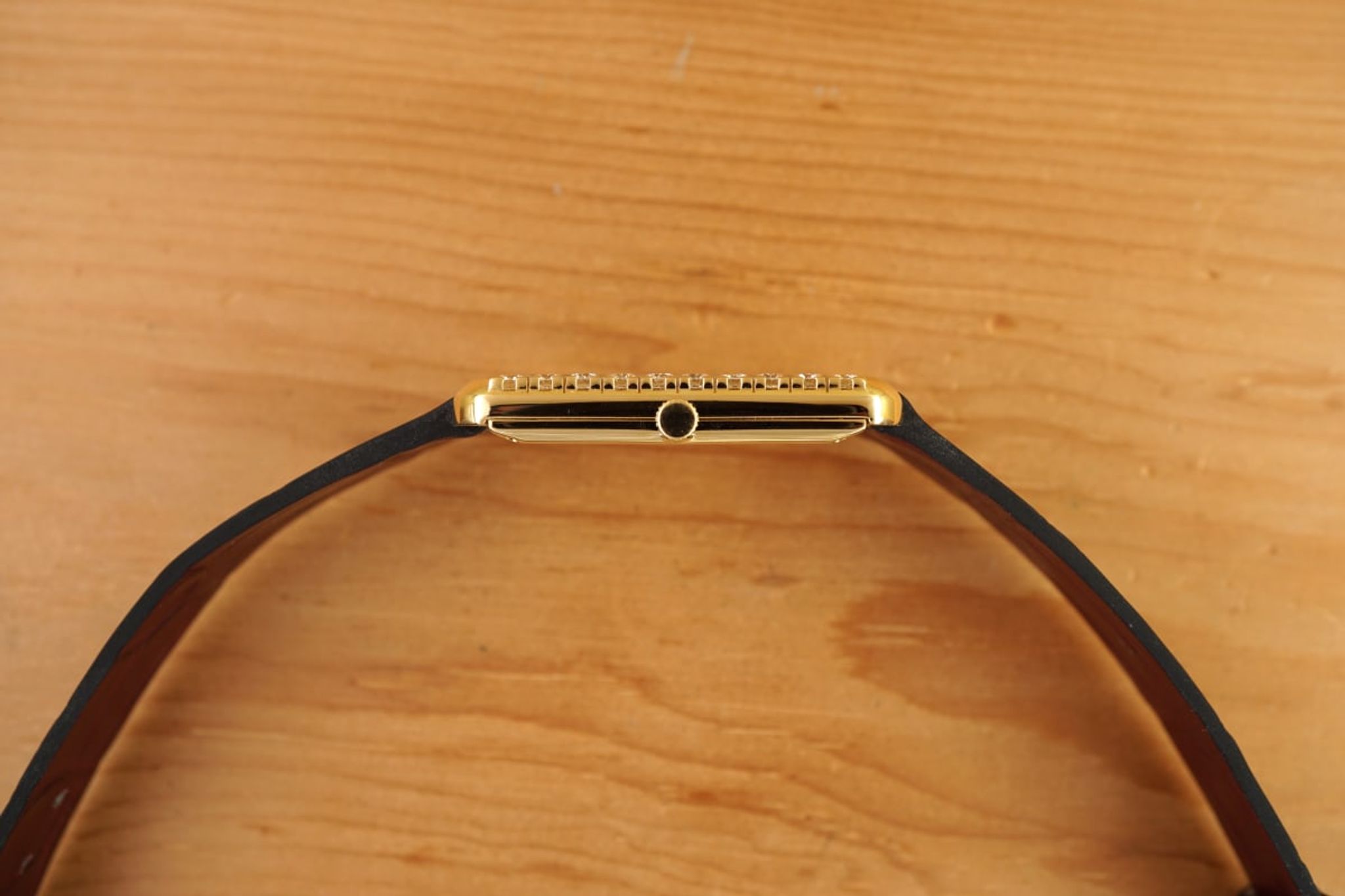 And the dial of this rectangular-shaped elongated black dial is even furhter extended by the high quality black alligator-leather strap, that we custom-made for this impressive watch.
