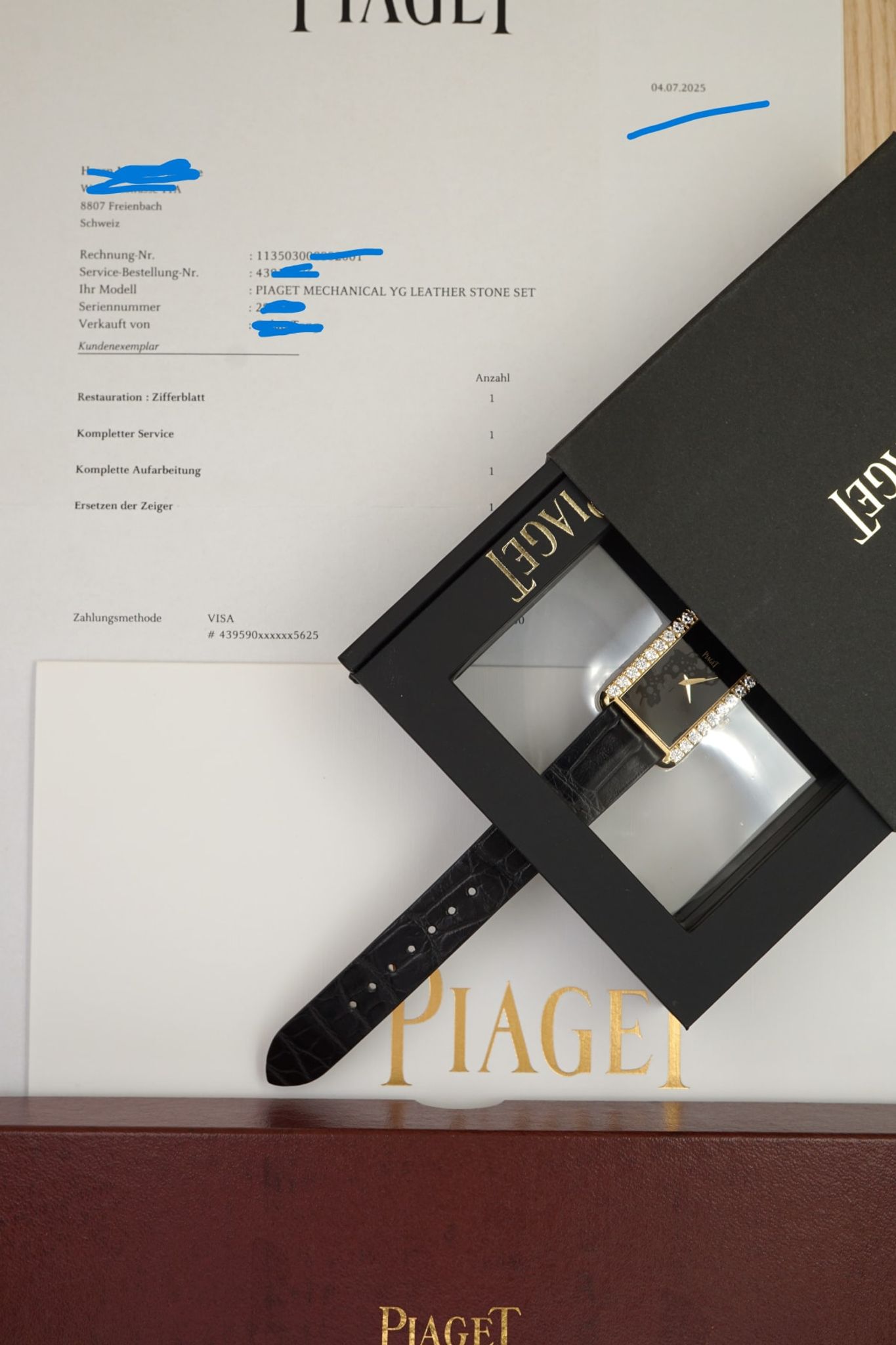 The watch was serviced by Piaget, Switzerland and comes not only in excellent condition but also with a 24-months guarantee by the Maison. Furthermore it comes with the original box, the service-box and -papers and its 18K-yellowgold Piaget-buckle.